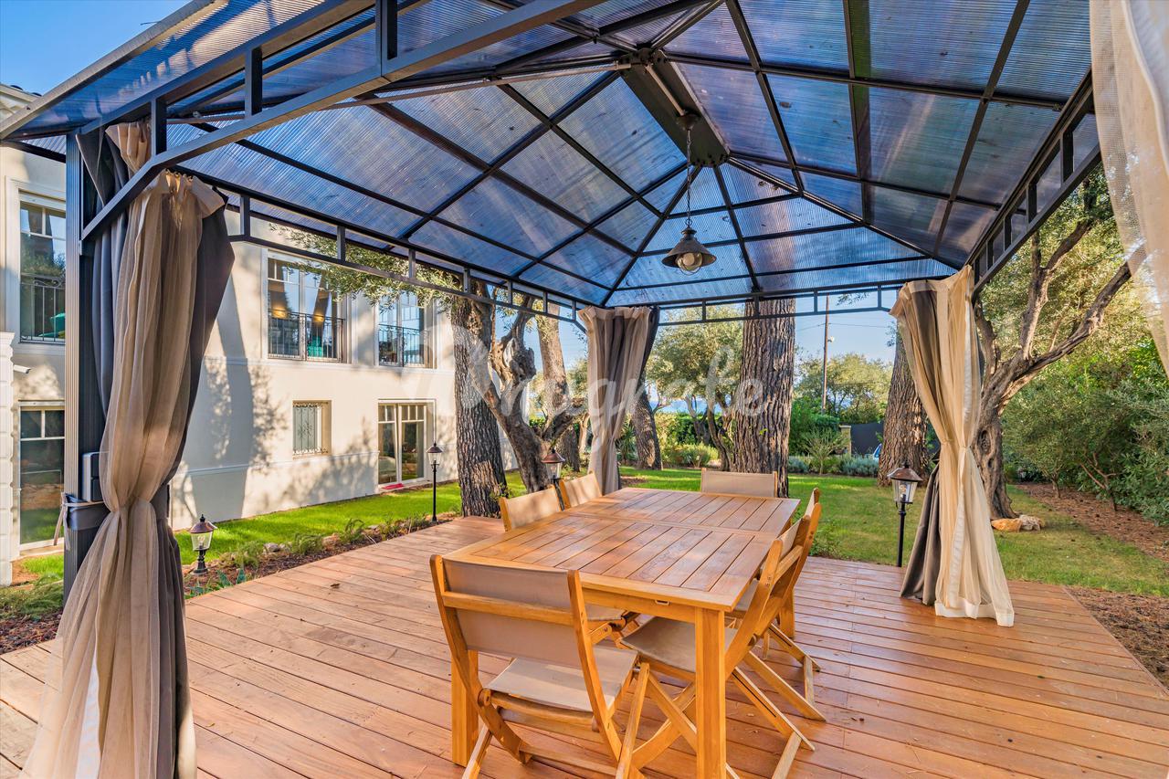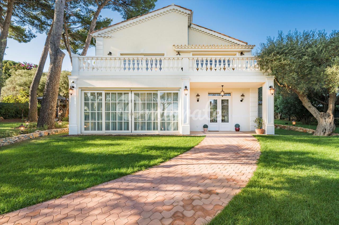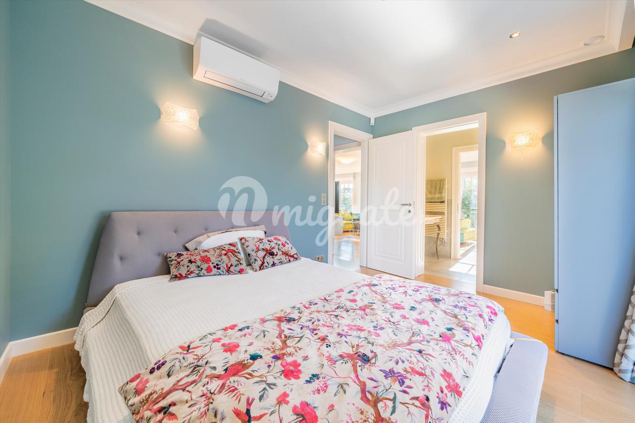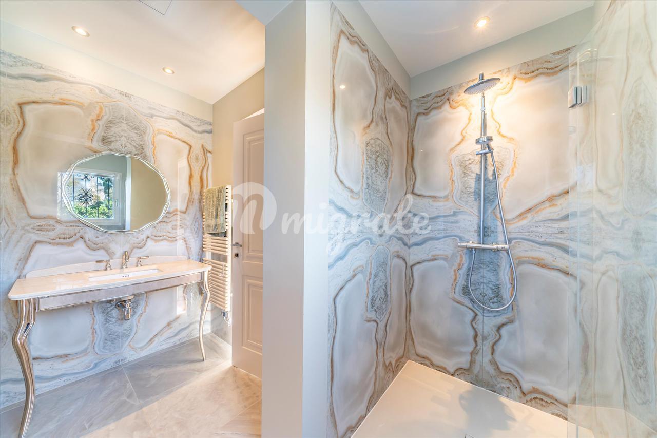 На первом этаже - большая гостиная и столовая, полностью оборудованная кухня, выходящая на прекрасную террасу с видом на море, и пятая спальня с ванной комнатой. Расположенный в саду площадью около 1700 кв.м. с бассейном с подогревом и несколькими террасами.