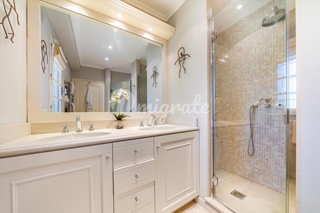 На первом этаже - антресольный кабинет и основная спальня с собственной душевой, гардеробной и собственной террасой. Расположенный в саду площадью около 2800 кв.м. с большой террасой, летней кухней, оливковой рощей, бассейном и парковкой на две машины.