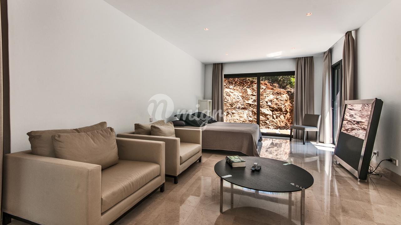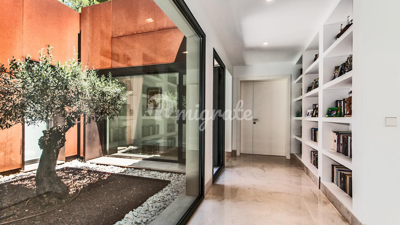 Первый этаж: светлая прихожая, просторная гостиная около 110 м2 с обеденной зоной и камином, ТВ-зал, атриум, полностью оборудованная роскошная кухня, 3 спальни, каждая с ванной комнатой, одна квартира для персонала, гостевая гардеробная. Первый этаж: 1 главная спальня с 2 ванными комнатами и 3 гардеробными. Отдельная гостевая квартира, доступная только снаружи, состоит из небольшой гостиной и 1 спальни с ванной комнатой.