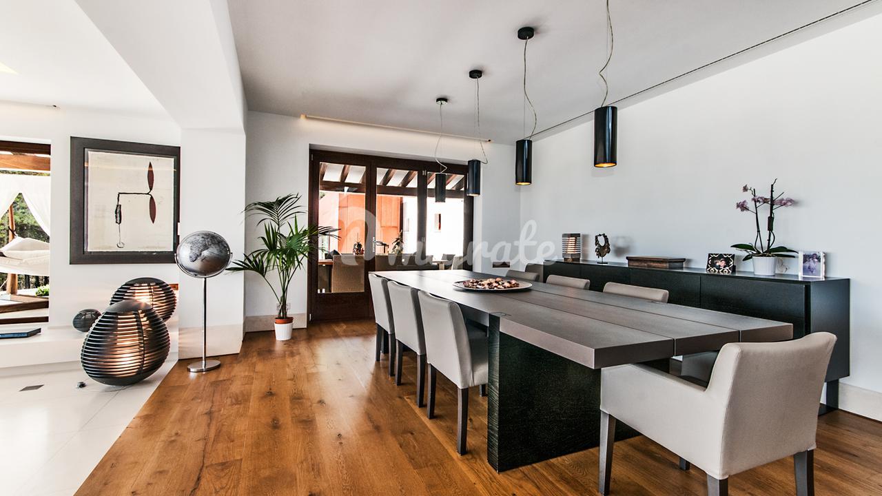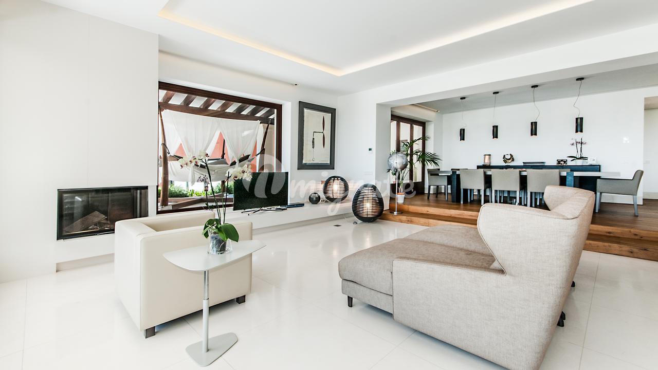 Чистая жилая площадь около 1000 м2 плюс террасы распределены по 3 этажам, включая отдельную квартиру для гостей и квартиру для персонала.