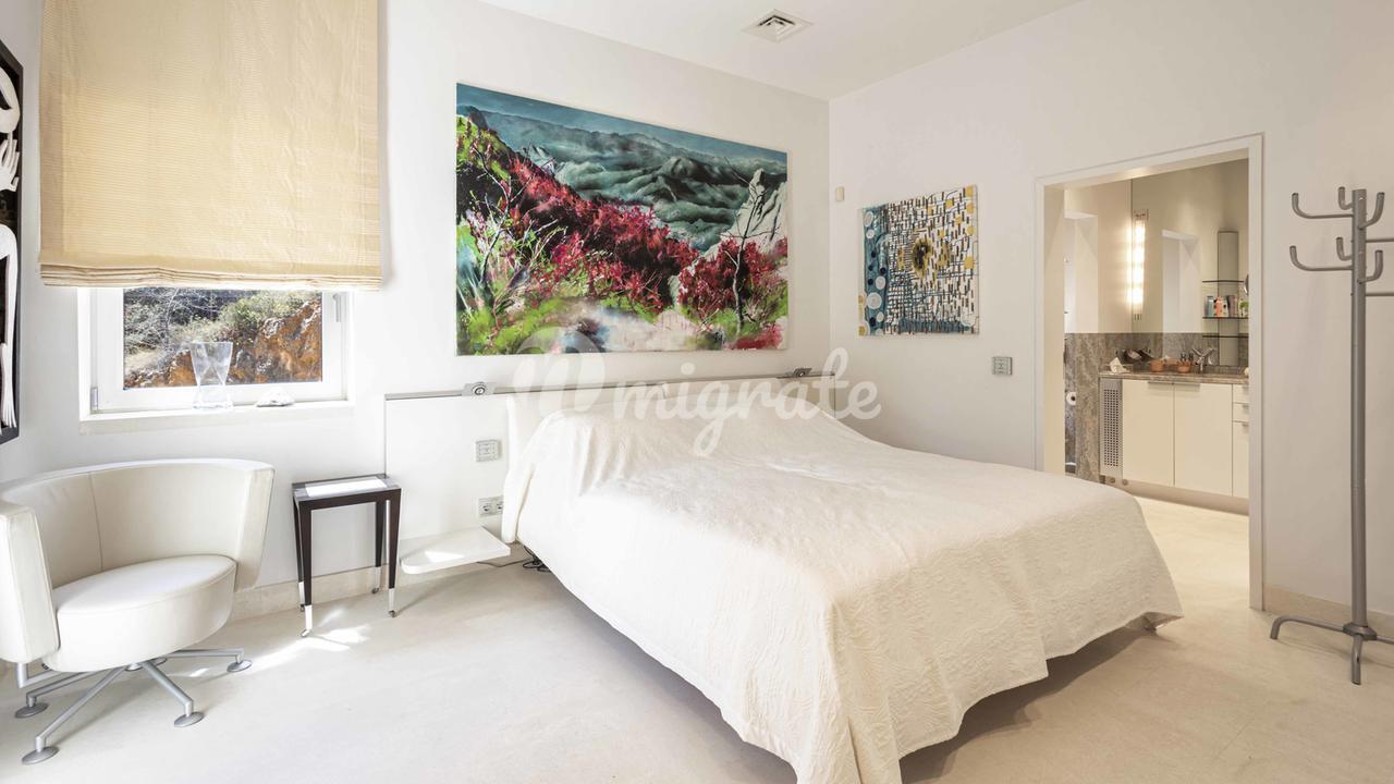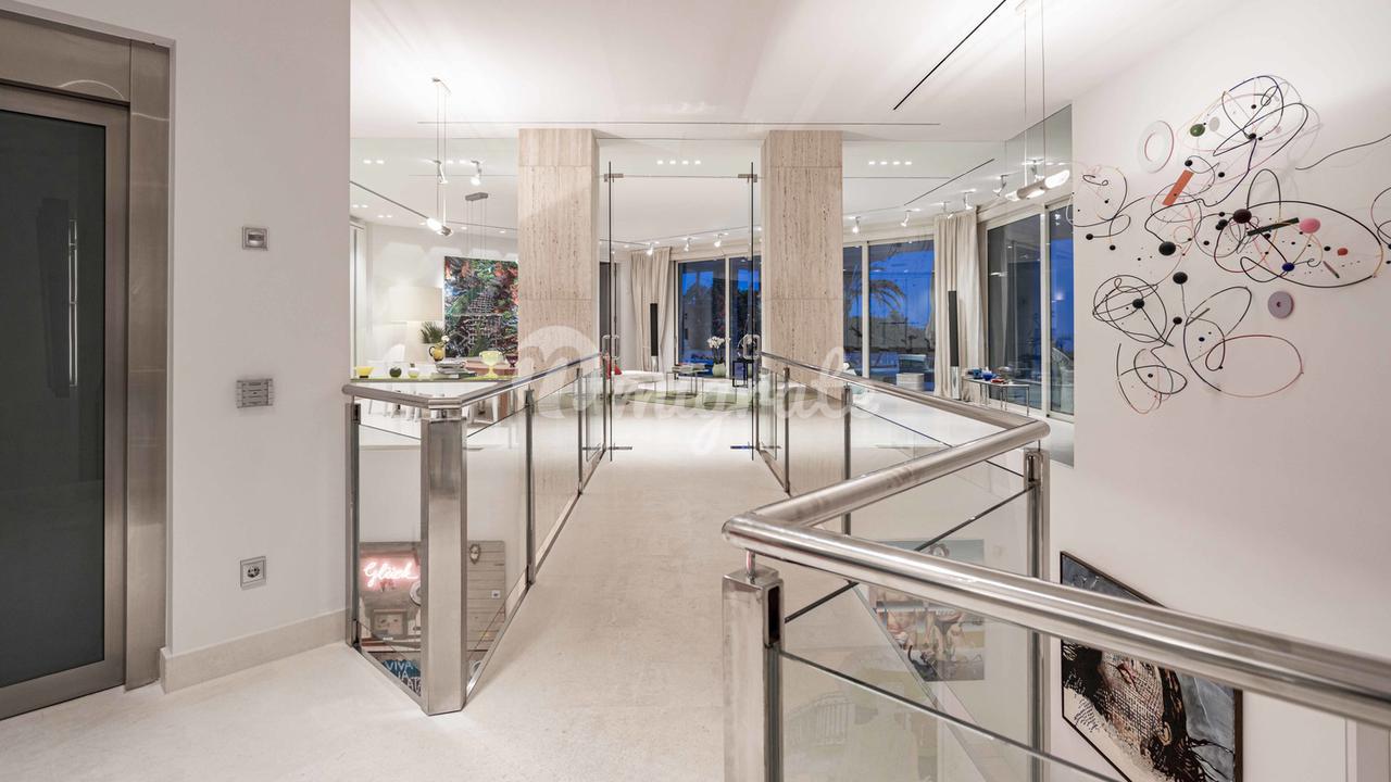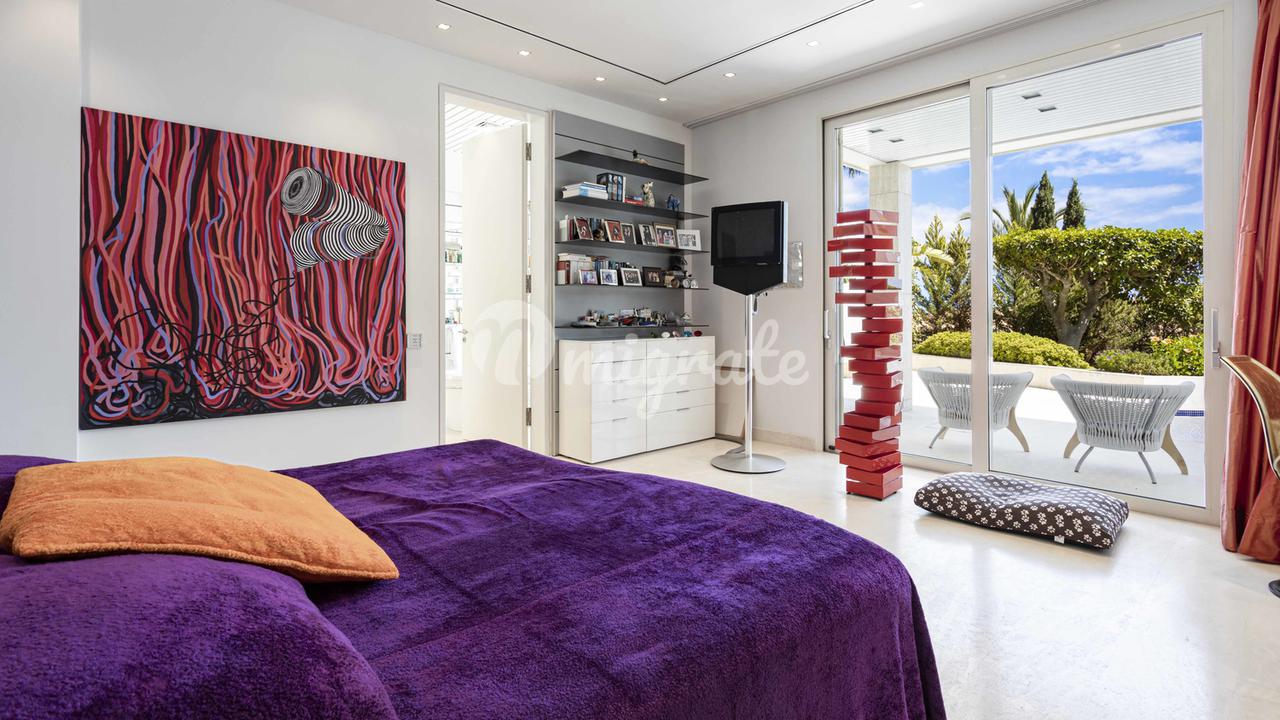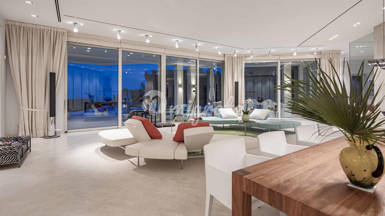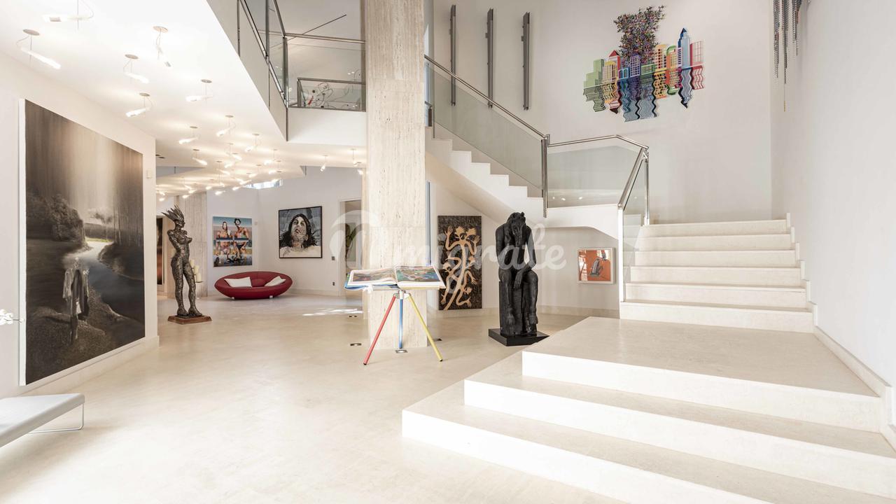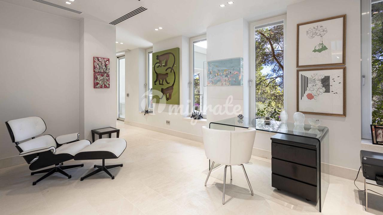 Первый этаж: большая прихожая с двойным потолком, большая открытая лестница, комната для медитации + открытая терраса, отдельное офисное помещение, гостевой туалет, отдельные помещения для персонала, гостиная, кухня, спальня с ванной комнатой. Первый этаж: большой открытый чердак для гостиной-столовой, уголок с телевизором и библиотекой, закрытая кухня с техникой немецкого бренда, главная спальня с ванной комнатой и большая гардеробная. Кроме того, 3 гостевые спальни с ванными комнатами. Этот уровень имеет большой открытый бассейн с морской водой и различные просторные террасы для загара и отдыха, все с захватывающим видом на море и залив Пальмы.