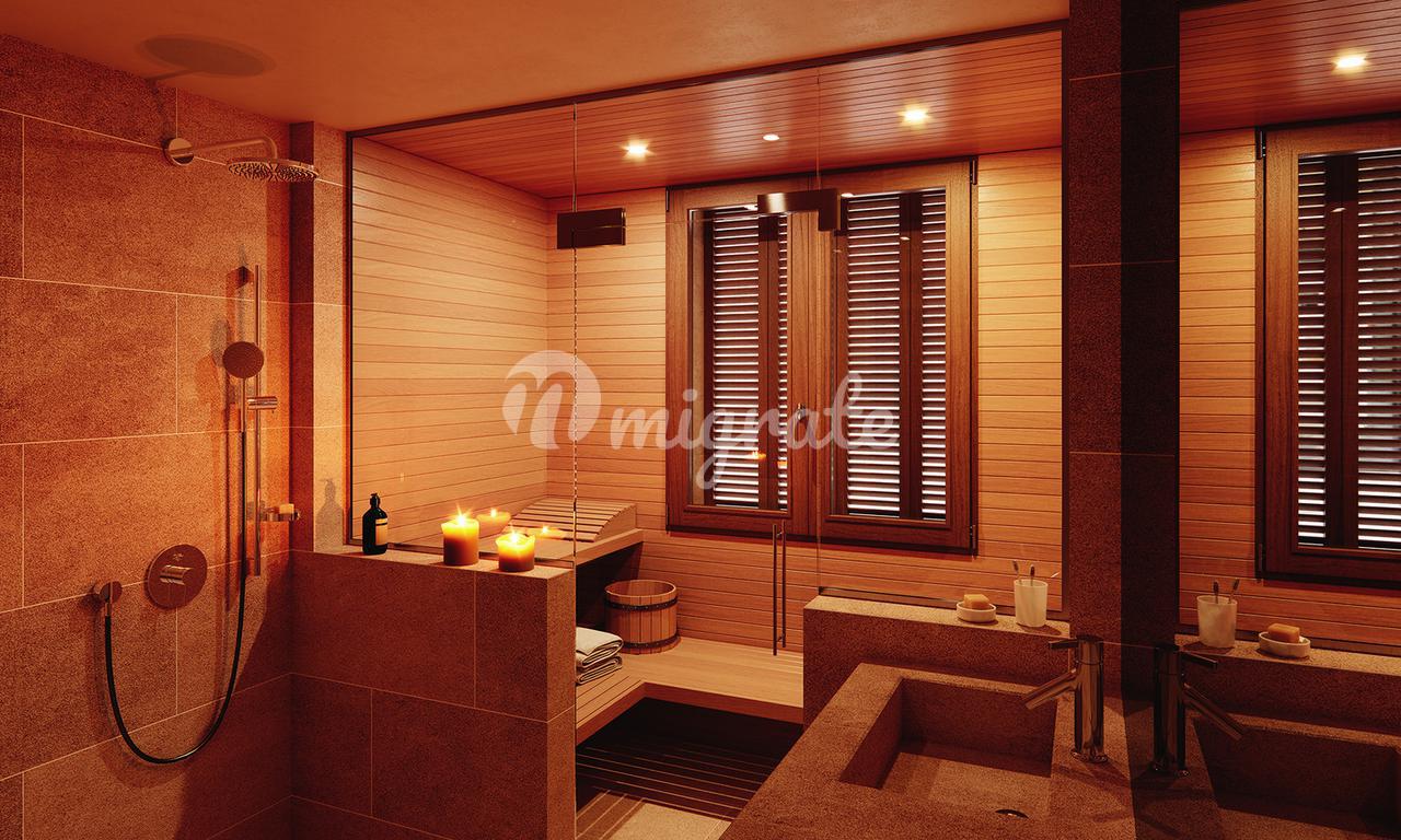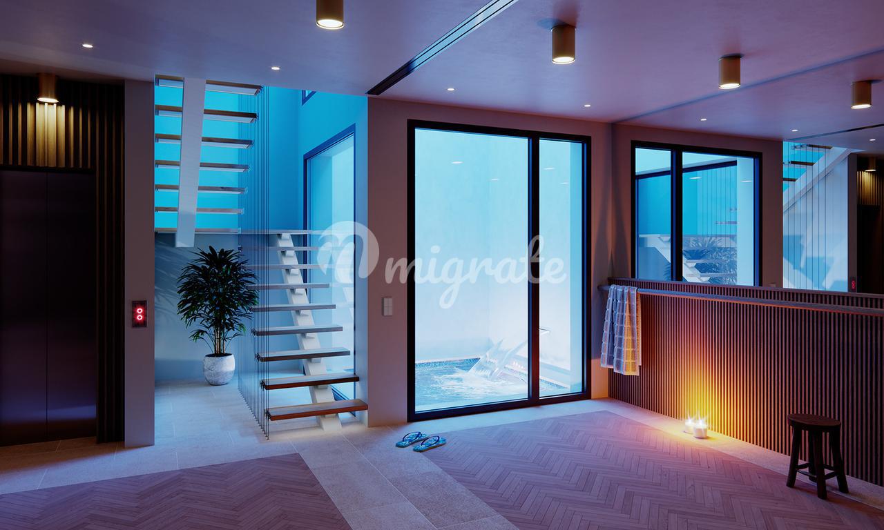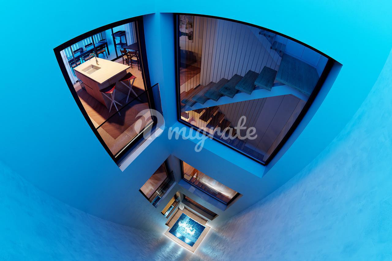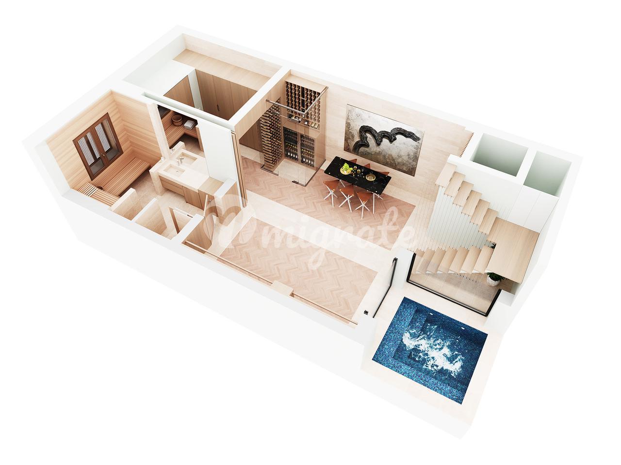 Первый этаж: на уровне улицы вы найдете главный вход с винным погребом, тренажерный зал, ванную комнату, сауну и бассейн во дворе.
