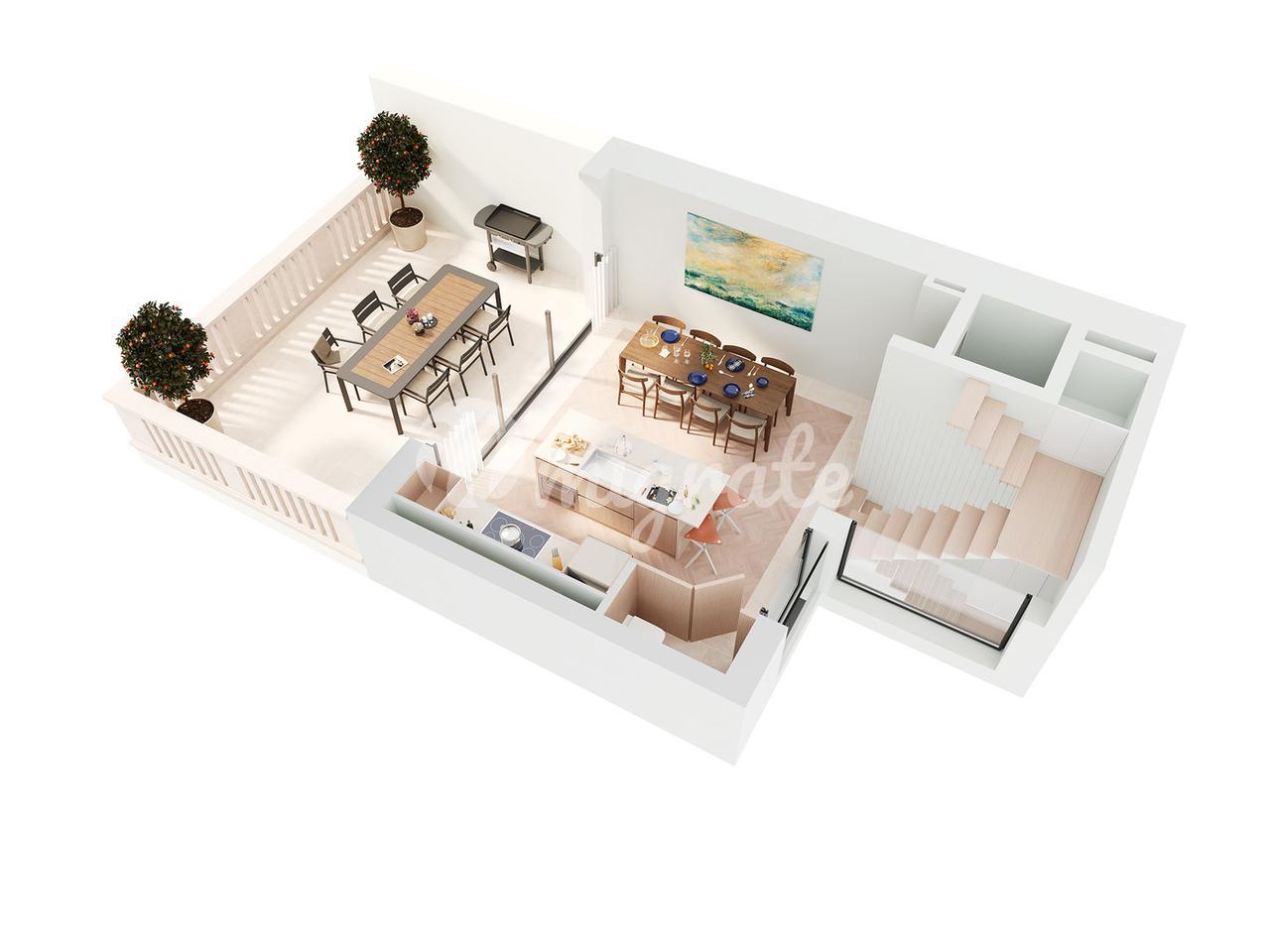 Третий этаж: открытая кухня и столовая, гостевой туалет и большая открытая терраса с открытой гостиной и обеденной зоной.