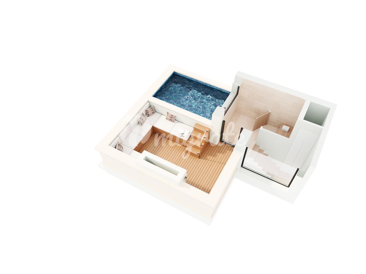 Четвертый этаж: небольшой домик у бассейна с гардеробной, террасой для загара и бассейном на крыше.