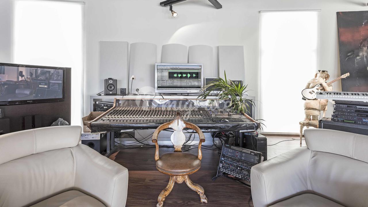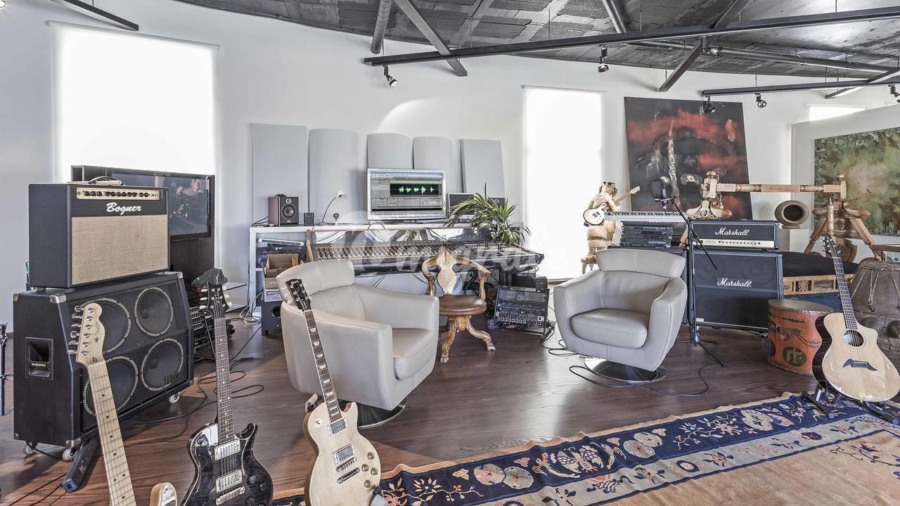 На задней стене студии также есть много окон и стеклянных раздвижных дверей с небольшим балконом, идущим вдоль них. На этом сайте у вас есть вид на жилое здание и его сад.