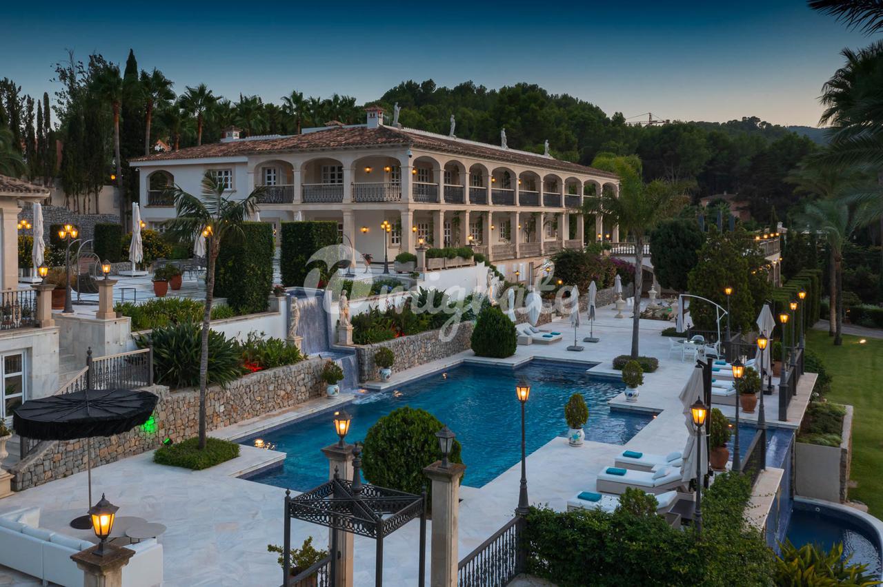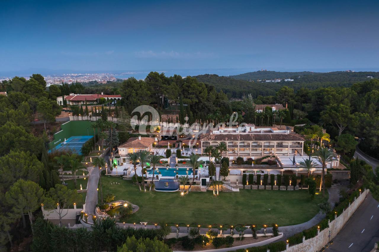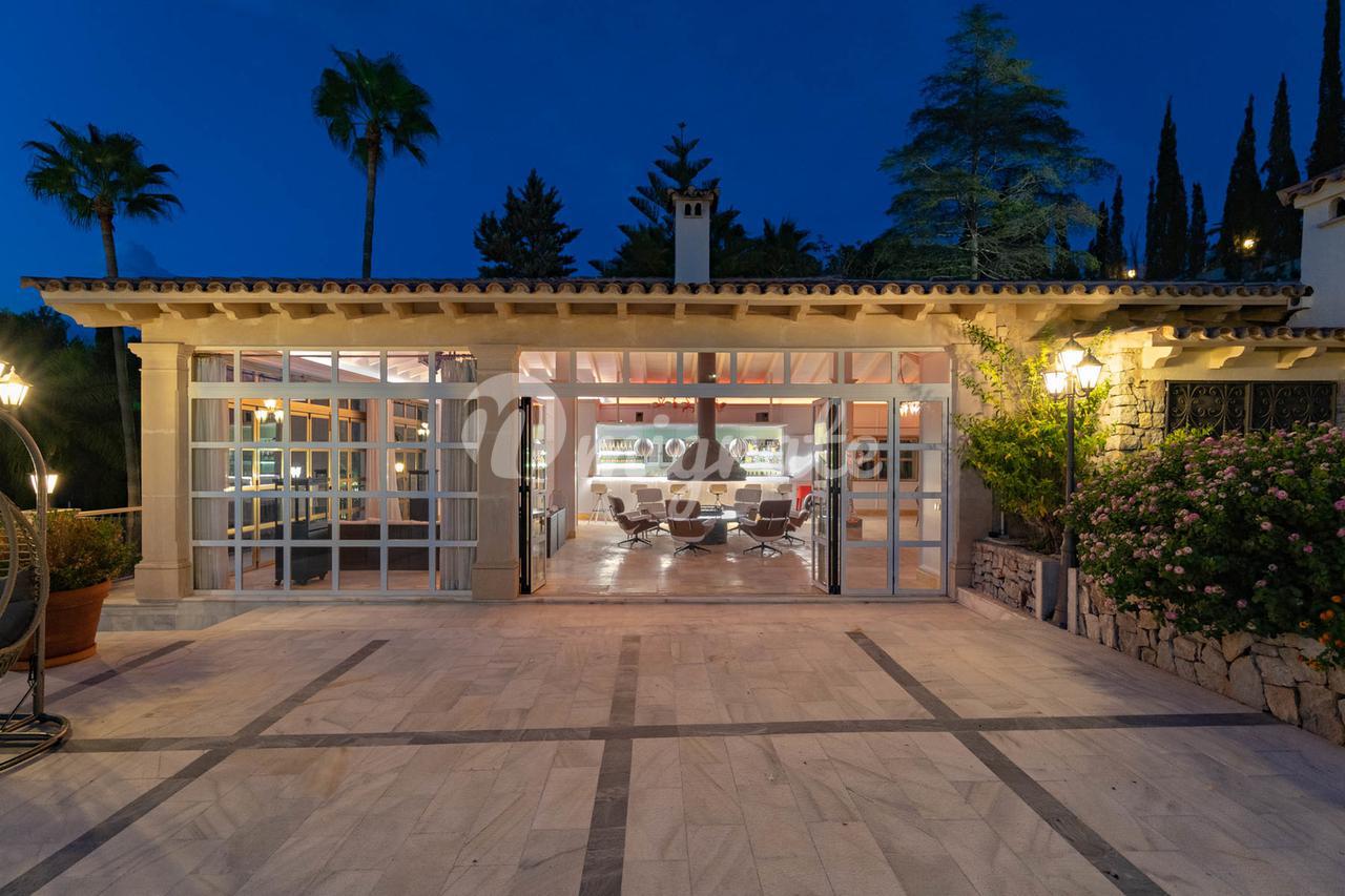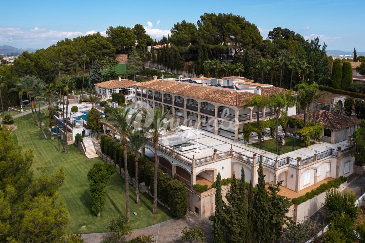 Он также имеет освещенный теннисный корт в очень хорошем состоянии. Есть два гаража, один на три машины, другой на две и возможность парковки еще 10 автомобилей при необходимости внутри собственности. Наиболее впечатляющими являются открытые площадки, как с террас первого этажа, так и с террасы у бассейна открывается панорамный вид на поле для гольфа Son Vida и ландшафтную часть с водопадом, фонтанами, лужайкой, пальмами и фруктовыми деревьями. придайте этому великолепному имению вид парка, а не частного сада.