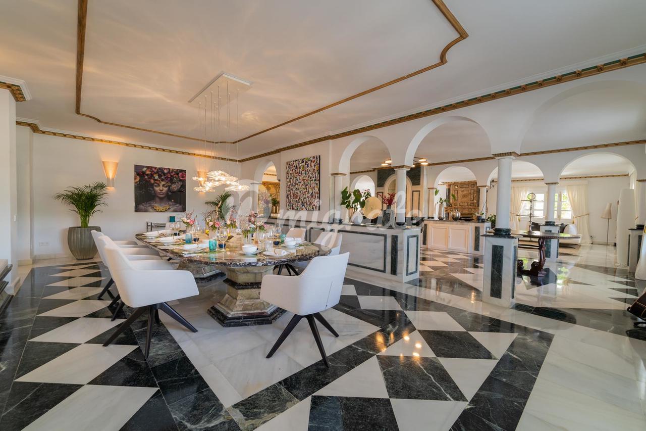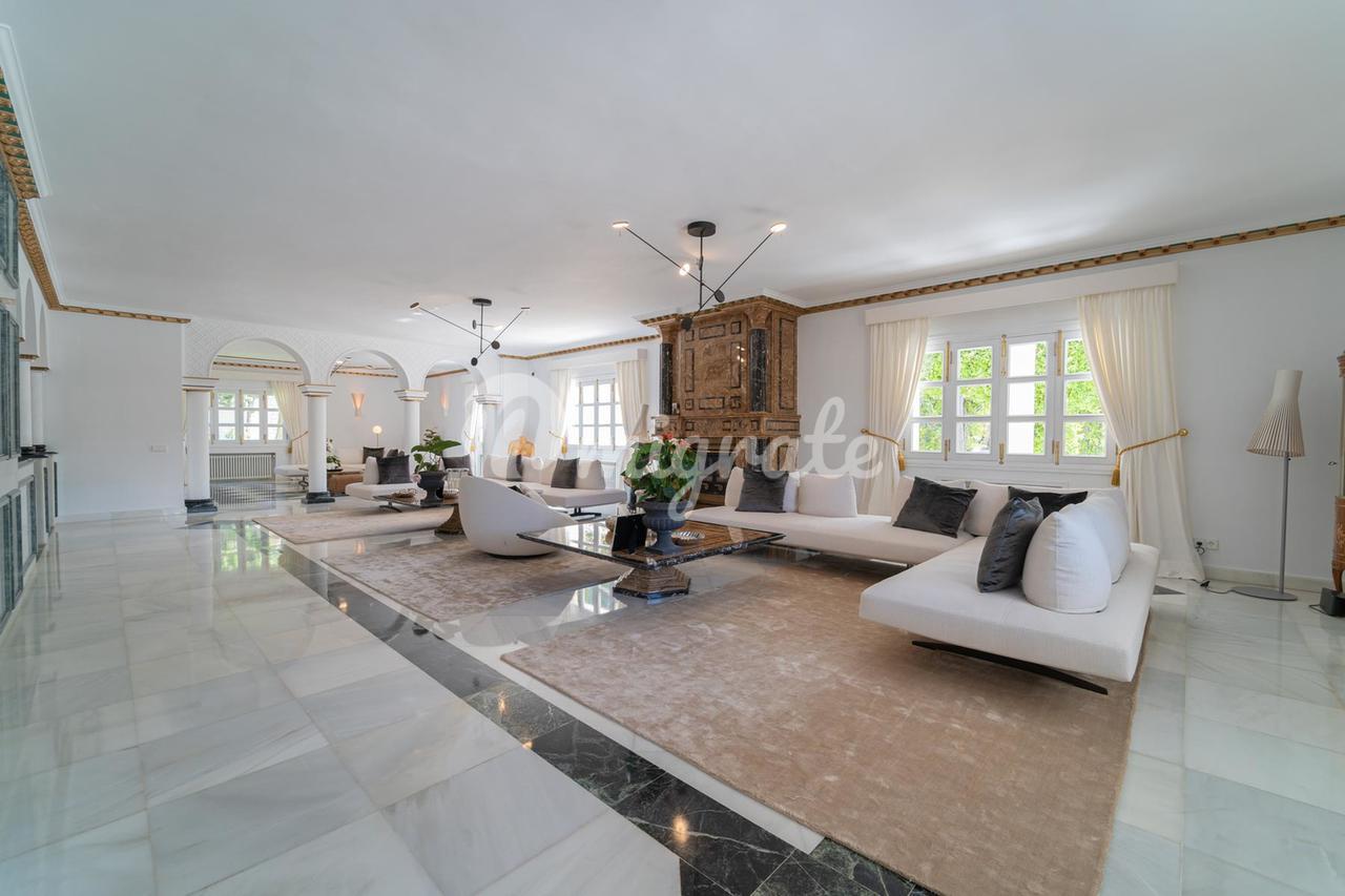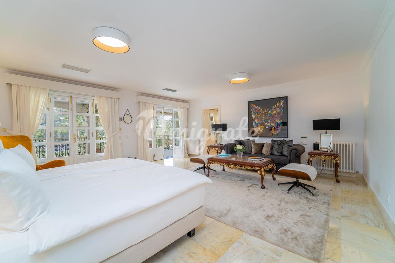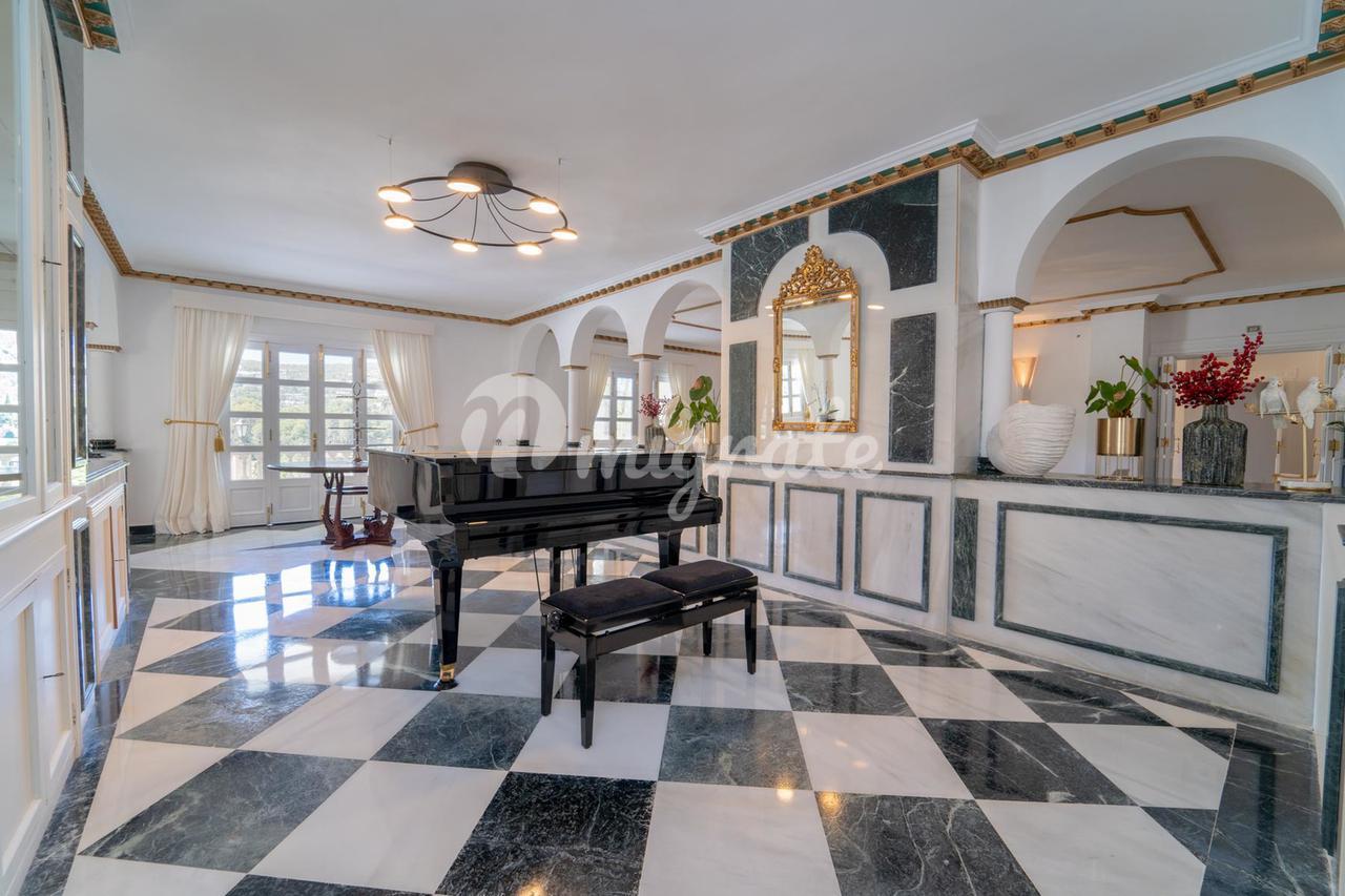 Первый этаж: просторный холл ведет с одной стороны в детскую комнату, за которой находится комната с ванной комнатой для няни и просторная кухня. С другой стороны, из кухни есть выход в маленькую комнату, где можно выпить шампанского перед ужином, парадную столовую, комнату с фортепиано и просторную гостиную с двумя комнатами и большим камином. Существует также большой офис, туалет и телевизионная комната. С первого этажа, на том же уровне, есть доступ к большой пристройке, где есть большая площадка для барбекю, круглый центральный камин, большая столовая на 14 человек, бар и туалеты. Ниже этой пристройки находится оздоровительный центр с сауной, турецкой баней, душевыми, ванной, зоной отдыха и столом для пинг-понга. Вход в оздоровительный центр находится на том же уровне, что и большой бассейн с гидромассажем и пристройка к двум семейным люксам. Первый семейный люкс состоит из двух спален, гостиной и ванной комнаты, а второй состоит из двух других спален с общей ванной комнатой. С другой стороны, есть еще одна пристройка меньшего размера, где расположены тренажерный зал, мини-кухня, ванная комната и спальня для персонала. Первый этаж: главная спальня с большой гардеробной и большой ванной комнатой, а также 7 гостевых спален, все с ванной комнатой и выходом на террасу. Две из них имеют заднюю террасу, а остальные 6 имеют выход на красивую и просторную переднюю террасу с панорамным видом на поле для гольфа.
