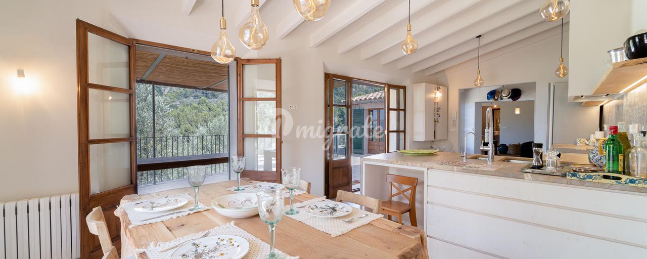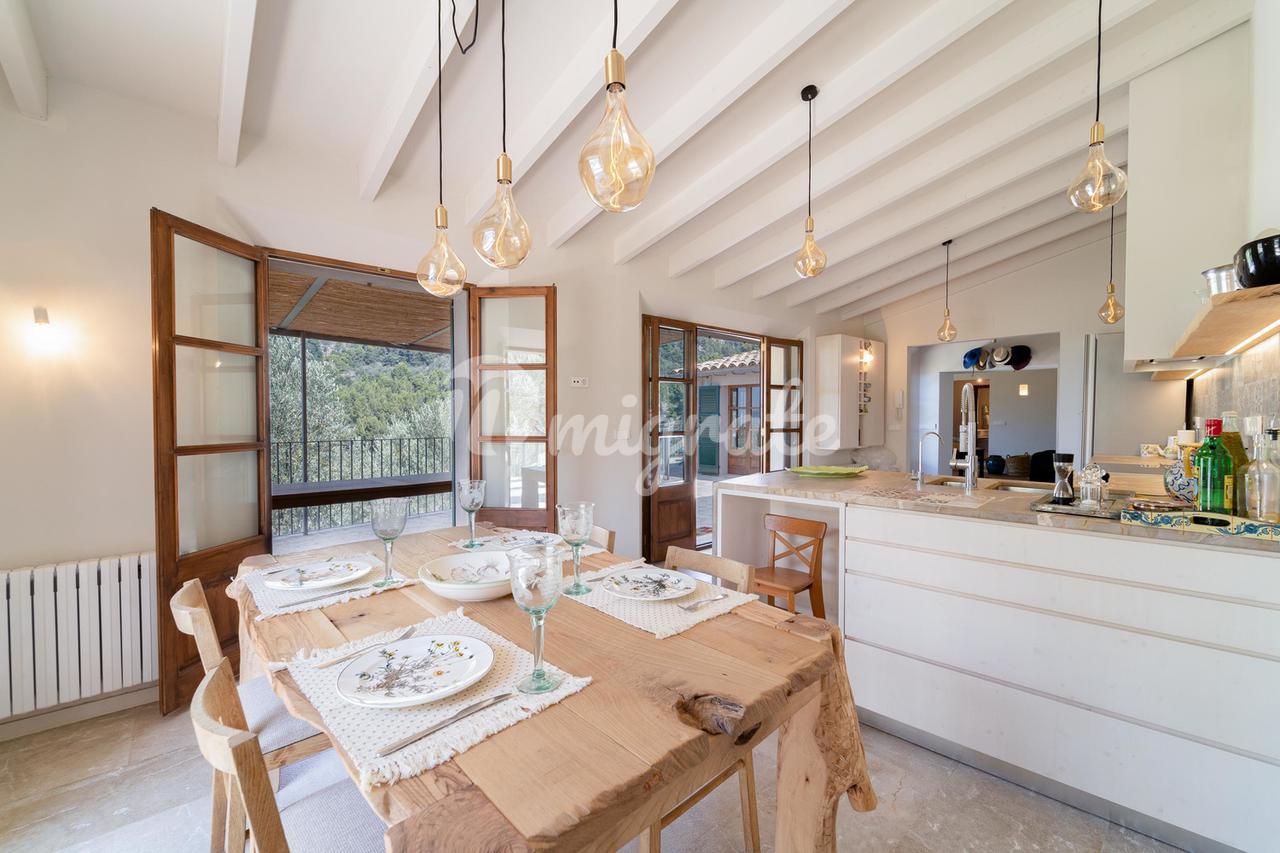 С лицензией на аренду на время отпуска. Ориентация: Западная сторона. Жилая площадь ок. 192 м2 плюс террасы распределены по 2 этажам. Первый этаж: прихожая, полностью оборудованная кухня, гостиная с дровяной печью, 2 спальни, одна с гардеробной, общая ванная комната. Выход на террасы как из гостиной, так и из кухни/столовой. Первый этаж: главная спальня с ванной комнатой. Имущество представлено в отличных условиях. Он был полностью отремонтирован в 2019 году с использованием высококачественных материалов. Деревянные и каменные полы, открытые балки, центральное отопление, AA. Собственность окружена террасами с древними оливковыми деревьями и имеет самый красивый вид на горы и деревню Форналтукс. Есть парковка на несколько автомобилей. Форналукс с красивой рыночной площадью находится в 5 минутах езды, а до нее можно добраться за 20 минут, спустившись с холма. Здесь вы найдете кафе, рестораны и магазины. Оживленный город Сольер, а также Пуэрто-де-Сольер с его пляжем, пристанью для яхт и множеством очень хороших ресторанов находятся всего в 15 минутах езды от отеля.