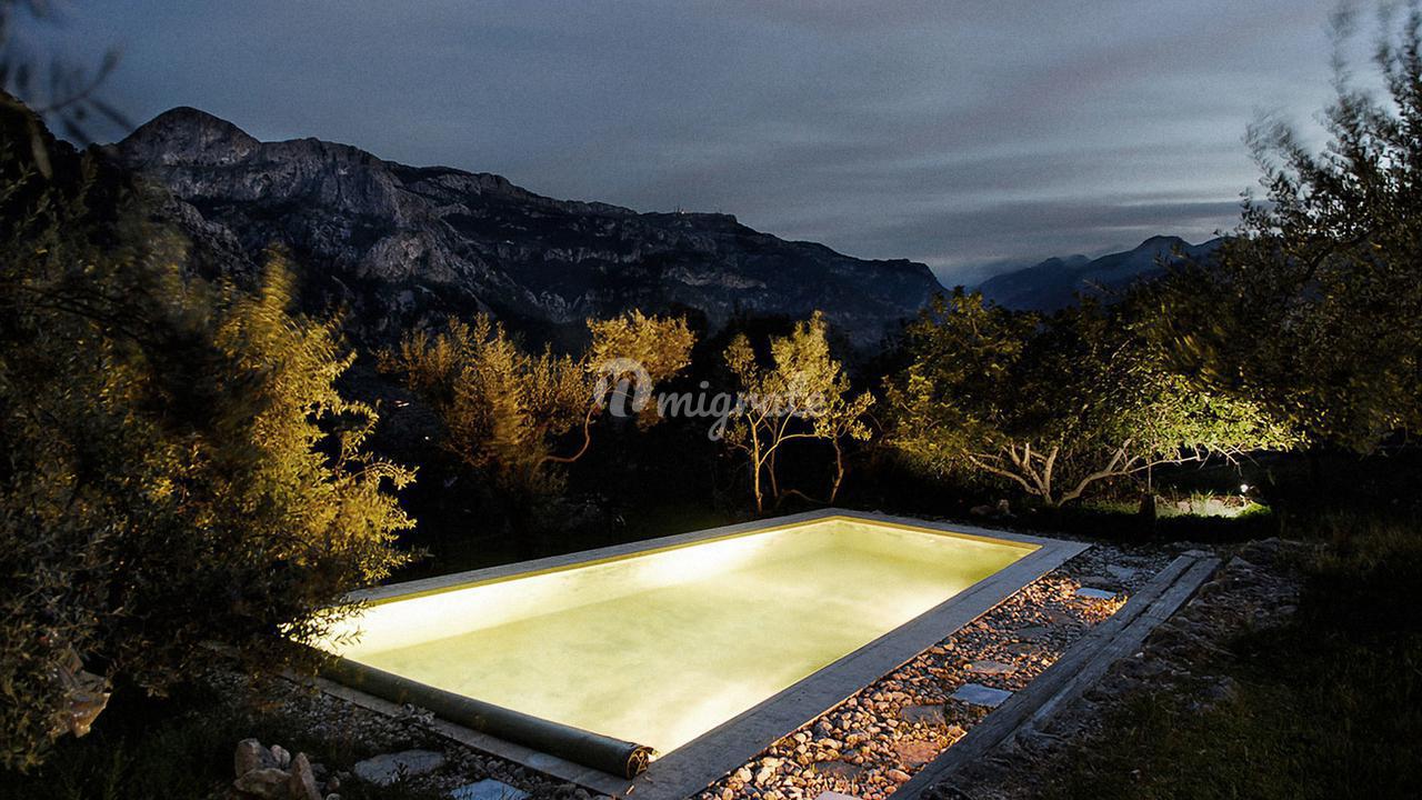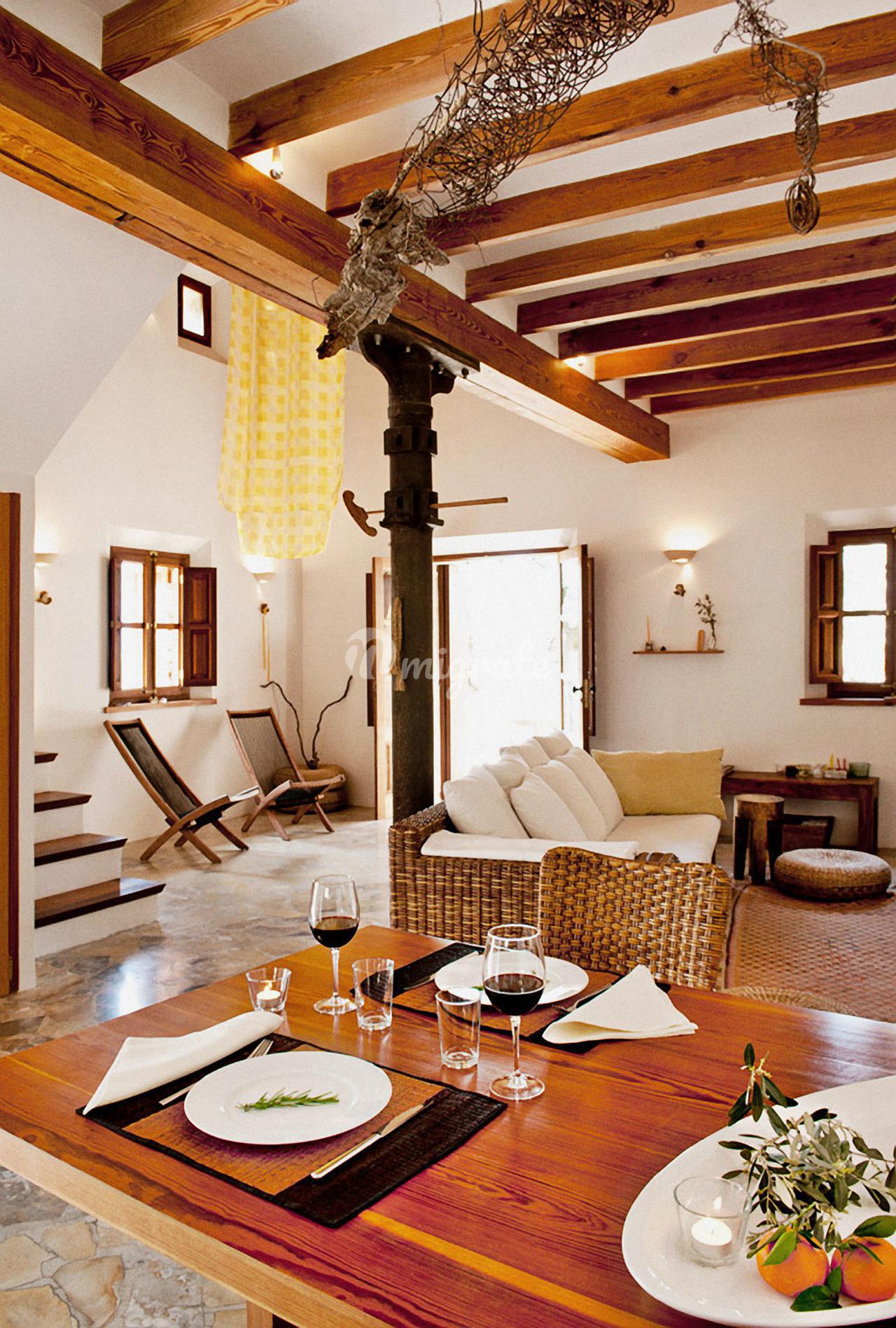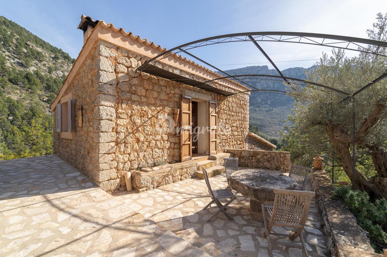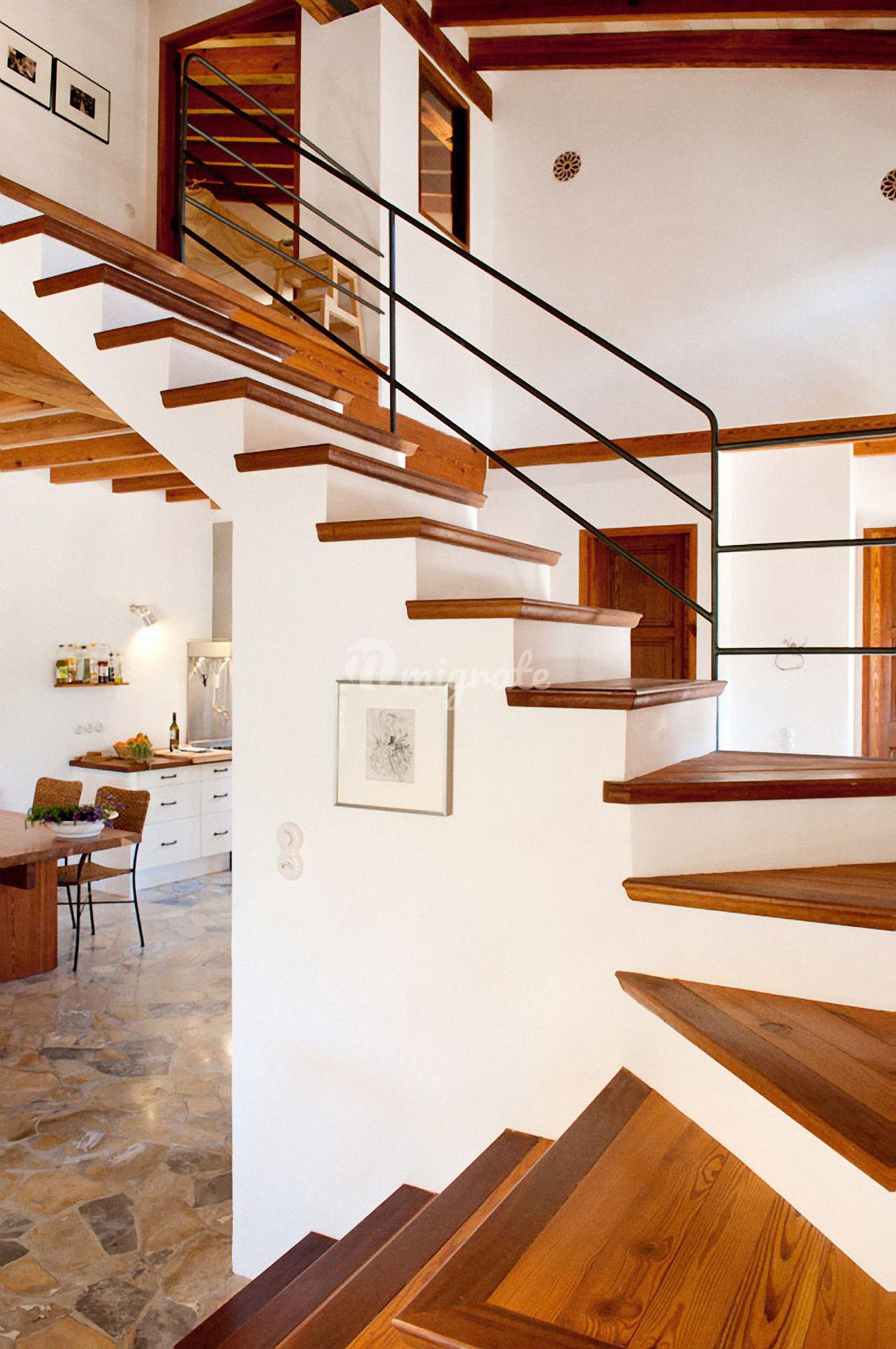 Жилая площадь около 190 м2 плюс террасы разделены на главный дом площадью ок. 120 м2 и гостевой дом площадью ок. 70 м2. Главный дом: Первый этаж: гостиная/столовая со швейцарским камином, открытая кухня, подсобное помещение и гостевой туалет. Второй этаж: главная спальня с кондиционером горячей / холодной воды и вторая спальня с общей просторной ванной комнатой. Гостевой дом: Первый этаж: гостиная/столовая с камином, открытая кухня и спальная зона. Мезонин: ванная комната Цокольный этаж: просторная спальня Поскольку дом расположен в оливковой роще с террасами, со всех уровней есть выход наружу. Недвижимость находится в очень хорошем состоянии. Усадьба из натурального камня была построена в удачном сочетании традиций и современности на развалинах старого здания. Были объединены современные строительные материалы и традиционные элементы, такие как железные балки со старой текстильной фабрики в Соллере. Усадьба расположена в тихом месте, среди очень старых и ухоженных оливковых рощ. Рожковое, инжирное и миндальное деревья, а также розмарин и лаванда дополняют средиземноморскую атмосферу. С террас и бассейна (8 х 4 метра, с морской водой) открывается захватывающий панорамный вид на горный хребет Трамунтана до Сольера. Неограниченное парковочное место. Дом расположен в горах над очаровательной деревней Форналуткс, которая находится менее чем в пяти минутах езды или примерно в 20 минутах ходьбы от отеля с ее магазинами и ресторанами. До городов Сольер и Пуэрто-де-Сольер с широким выбором магазинов и ресторанов можно доехать на автомобиле за 15 минут. Ближайший пляж также находится в Пуэрто-де-Сольер.