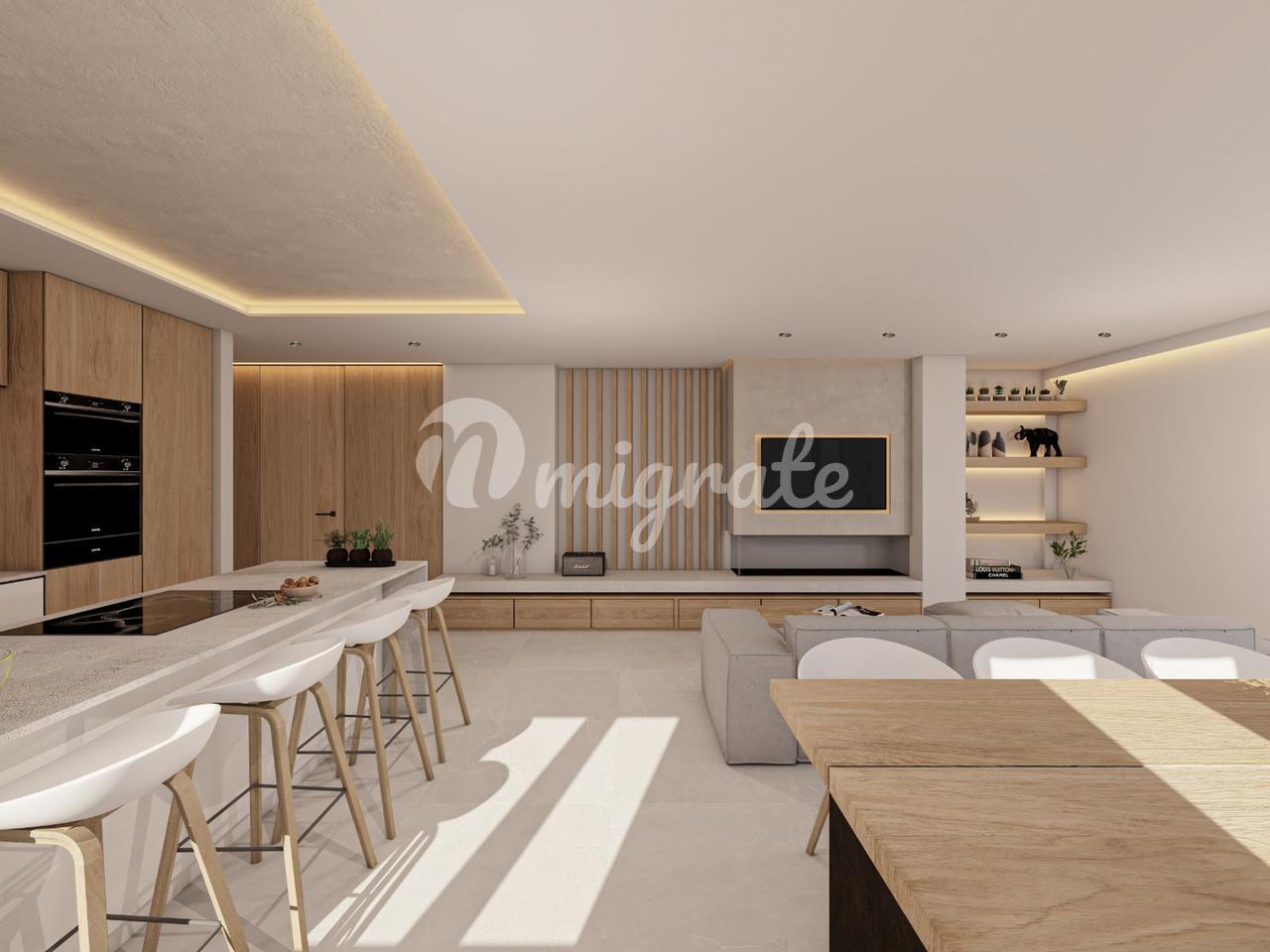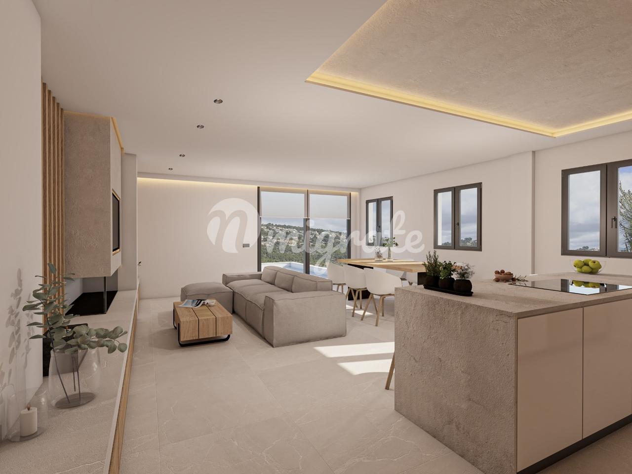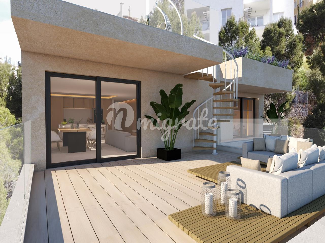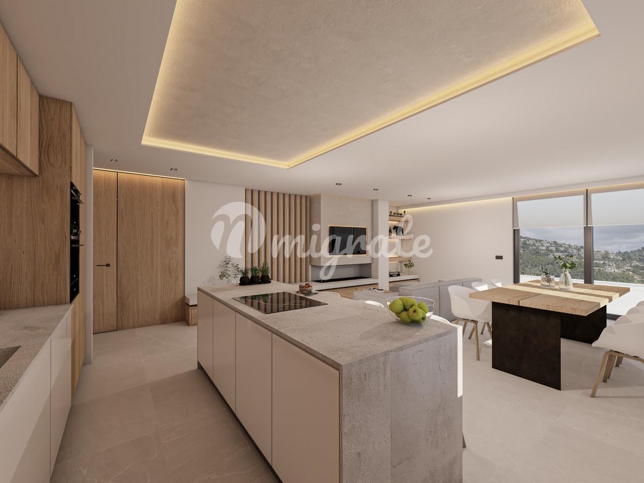 На первом этаже пентхауса расположены три спальни и две ванные комнаты, открытая кухня и гостиная с панорамно-раздвижными дверями, которые соединены с большой террасой с видом на горы.