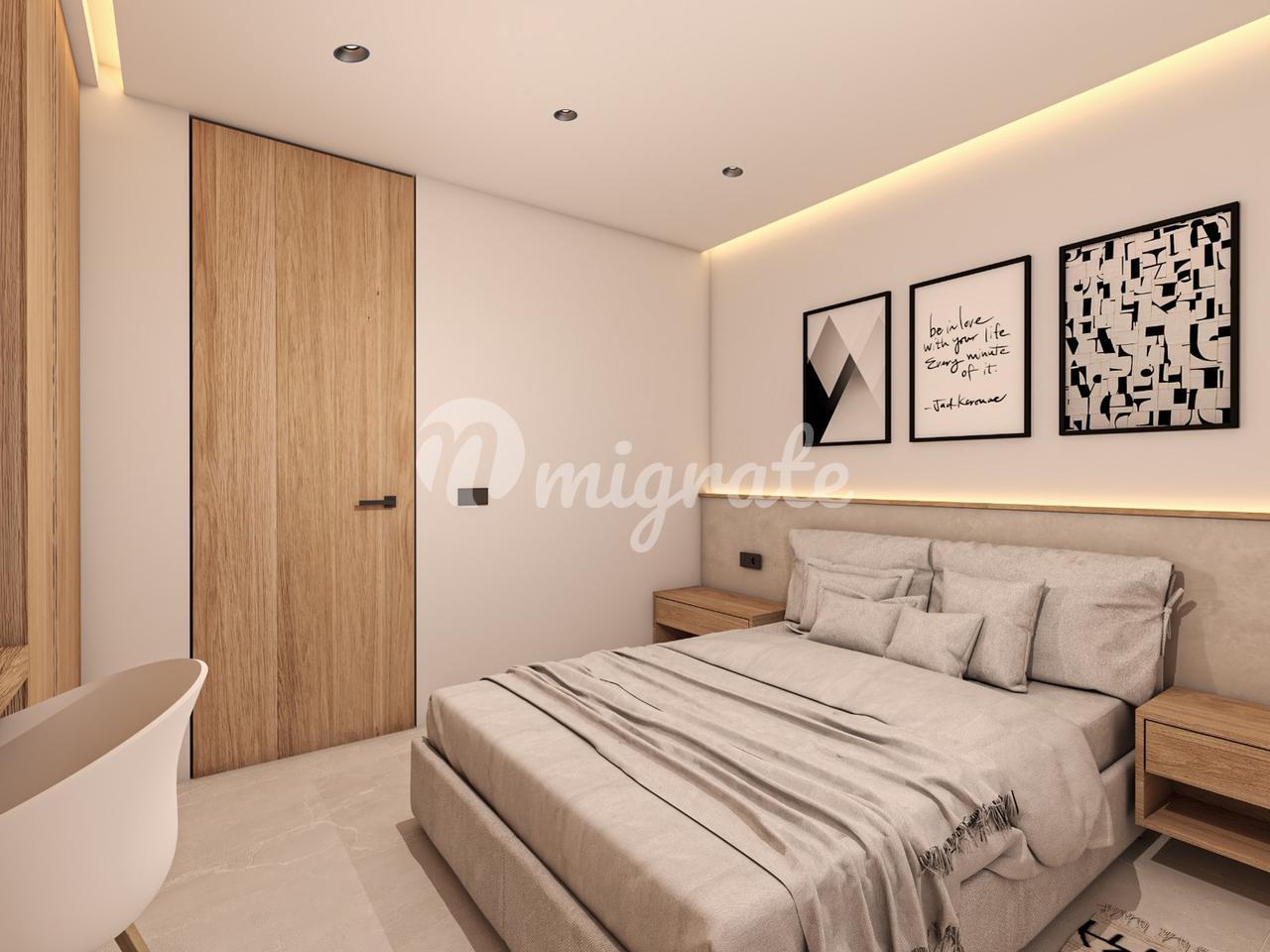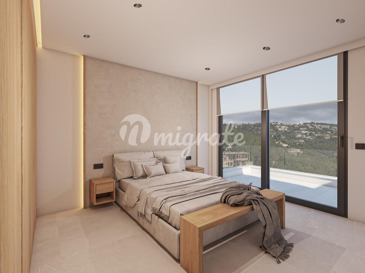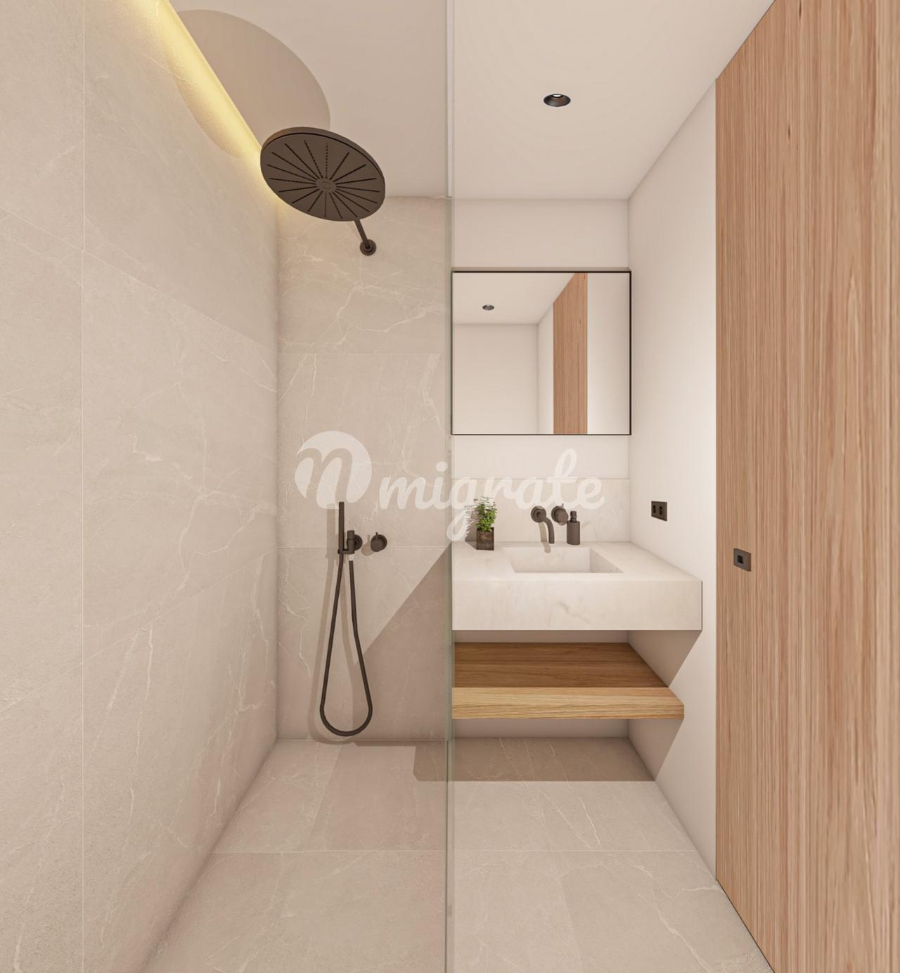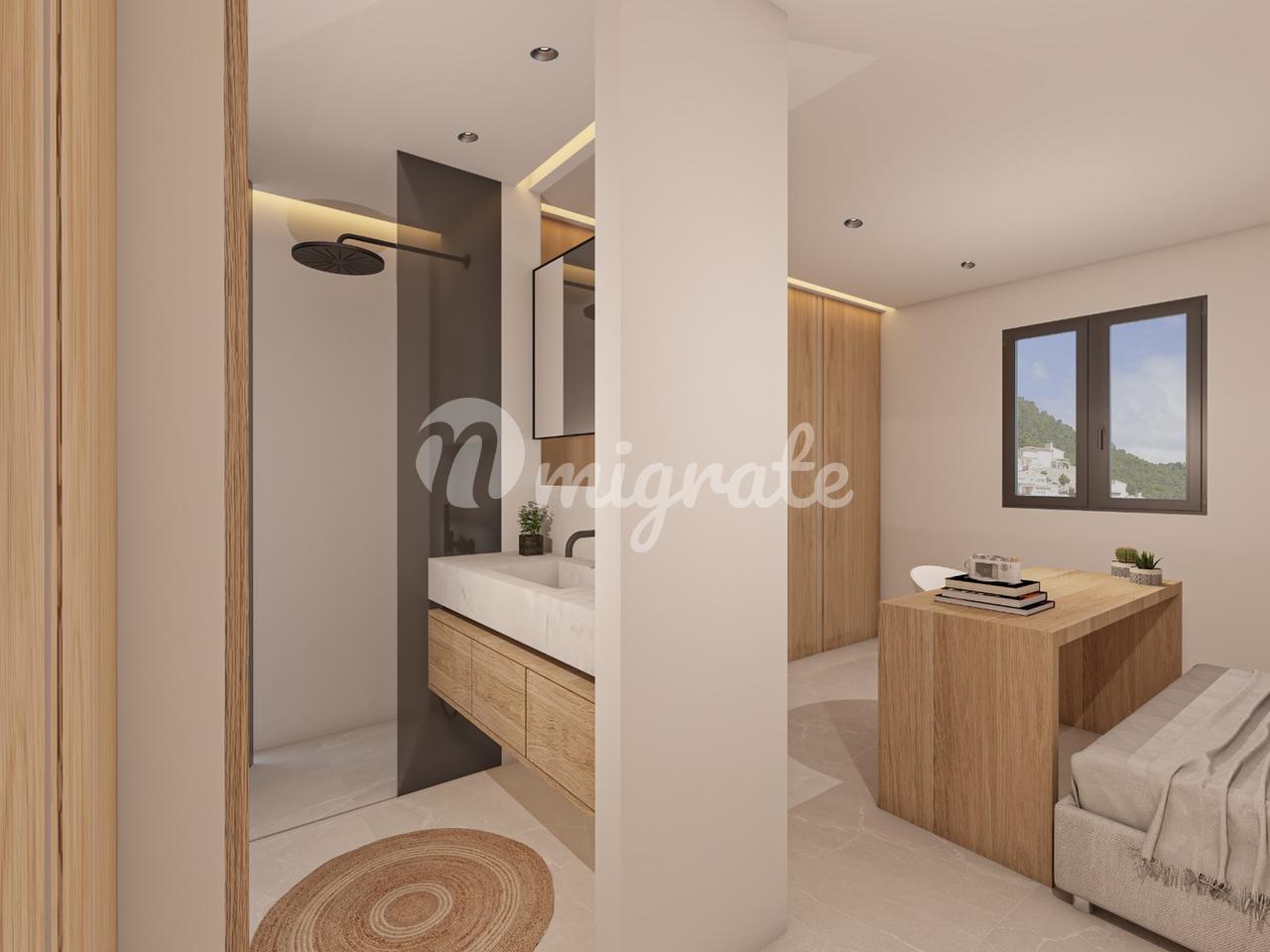 На первом этаже пентхауса расположены три спальни и две ванные комнаты, открытая кухня и гостиная с панорамно-раздвижными дверями, которые соединены с большой террасой с видом на горы.