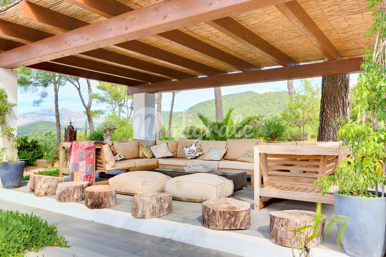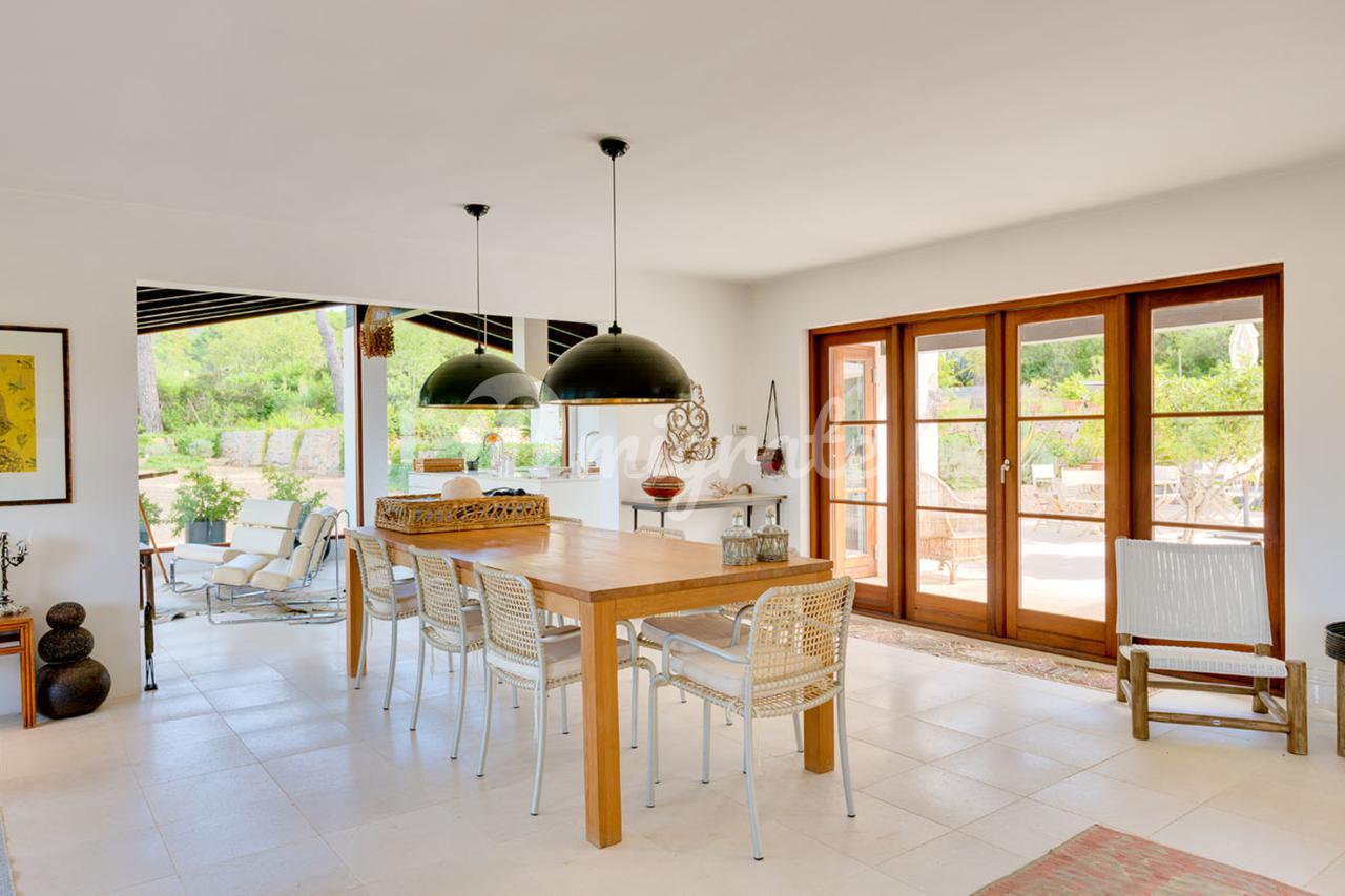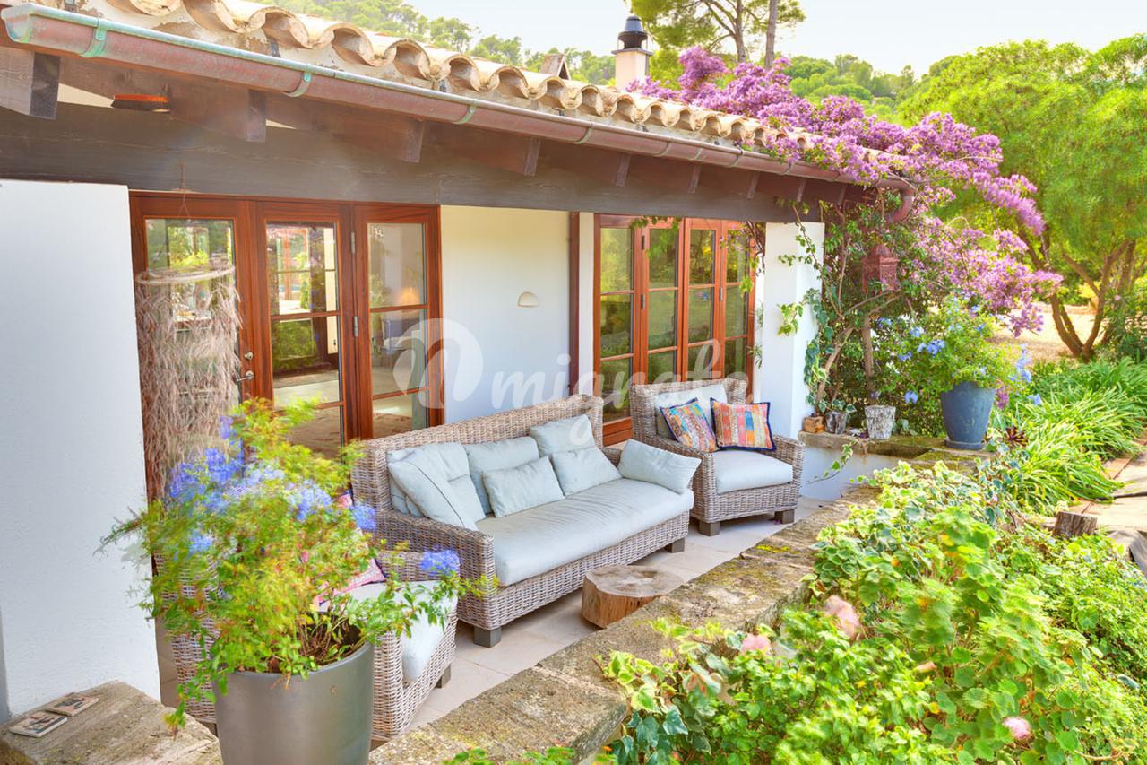 Несколько террас, большой двор с уютной зоной отдыха, летнее барбекю, бассейн, 2 летних душа, захватывающий вид на горы Трамунтана, большой участок с соснами, миндальными деревьями и большими агавами.