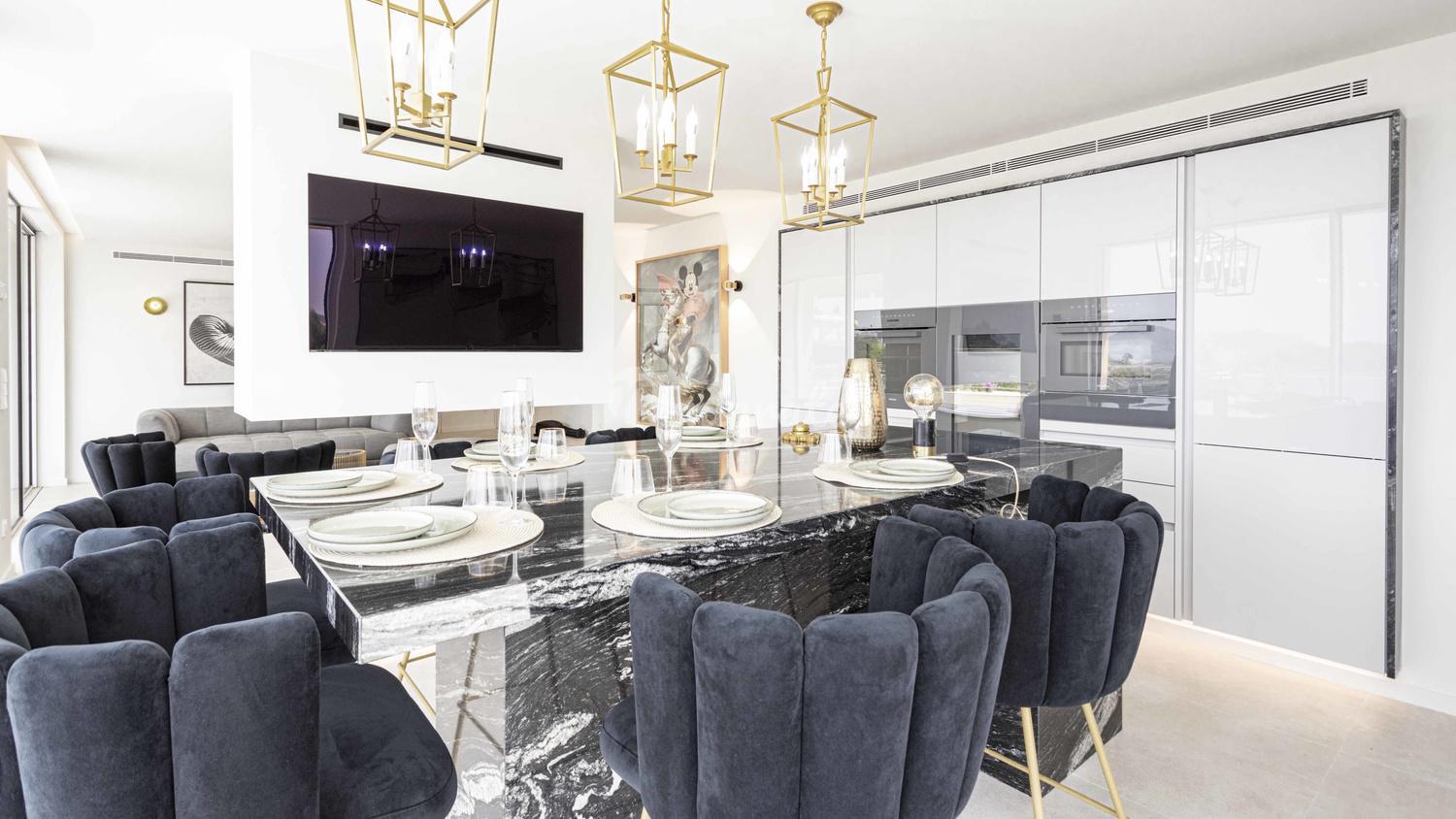 Пентхаус состоит из прихожей, гостиной-столовой открытой планировки с потрясающим видом на море и острова Мальграт, открытой американской кухни с кухонной техникой немецкого бренда, которая отделяет гостиную от кухни частичной стеной, в которой расположены камин и стена с телевизором. В пентхаусе находится большая главная спальня с ванной комнатой и гардеробной, а также две гостевые спальни с общей ванной комнатой.