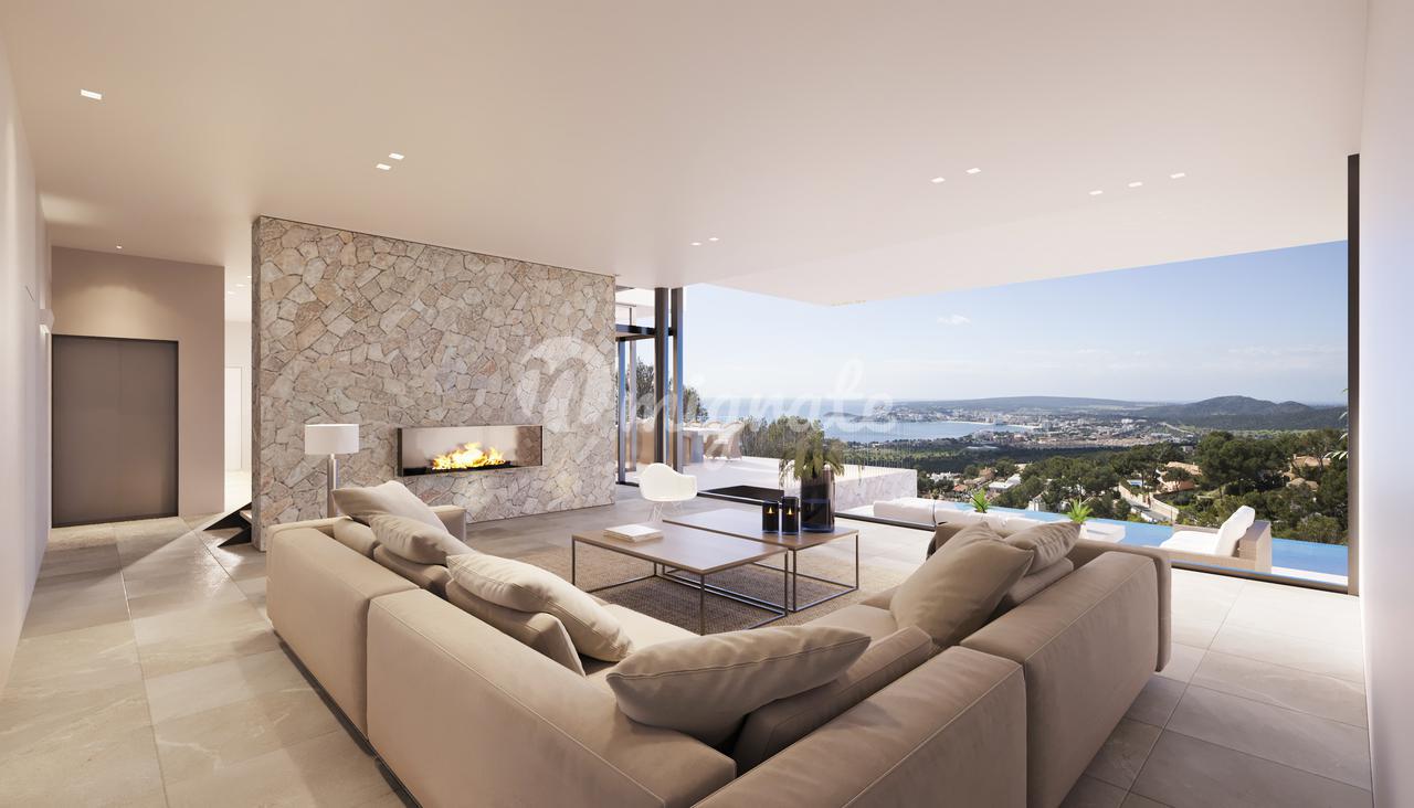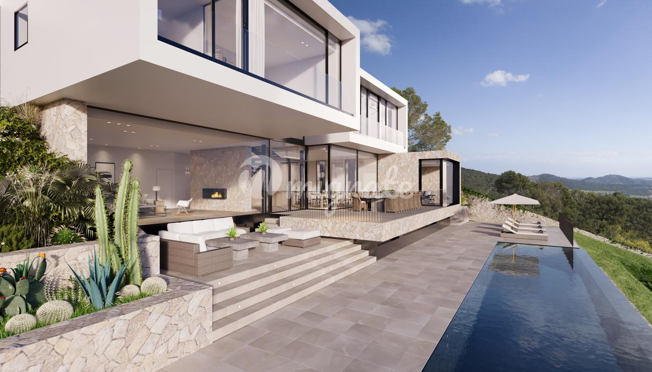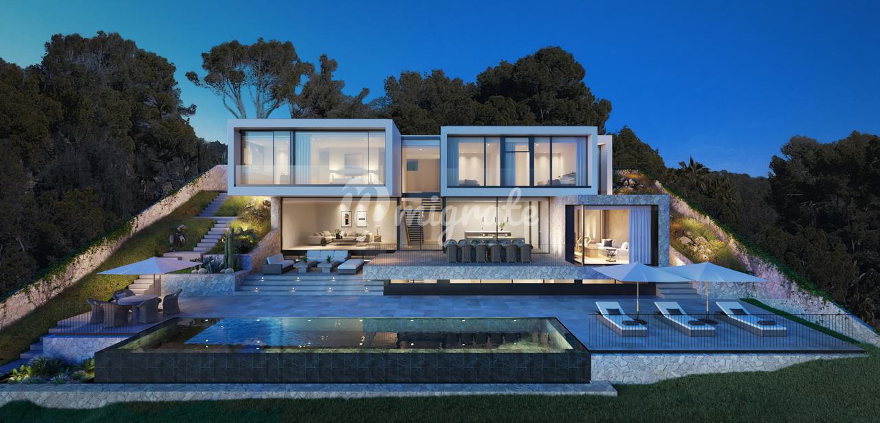 Удивительная недавно построенная вилла, расположенная на участке площадью 1175 м2, расположенном на холмах Коста-ден-Бланес, с захватывающим панорамным видом на море, гавань для яхт и залив Пуэрто-Порталс.