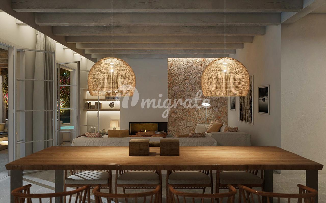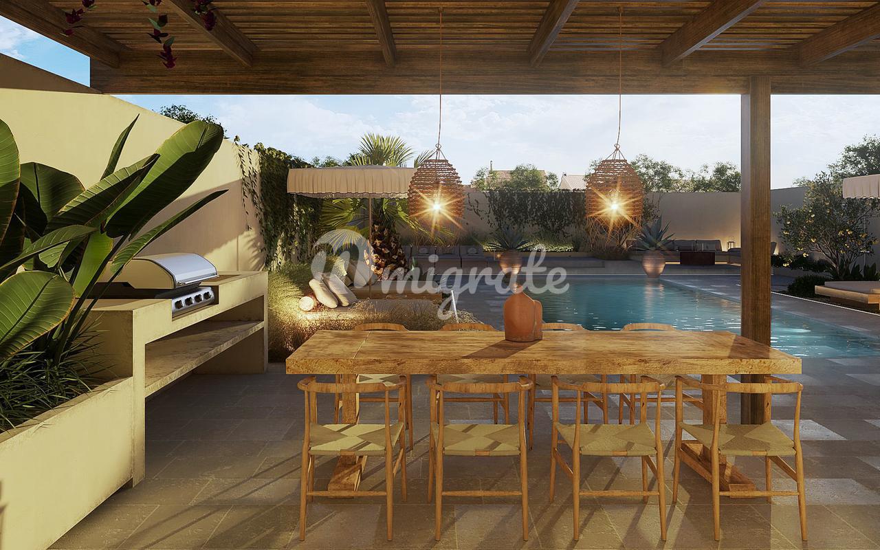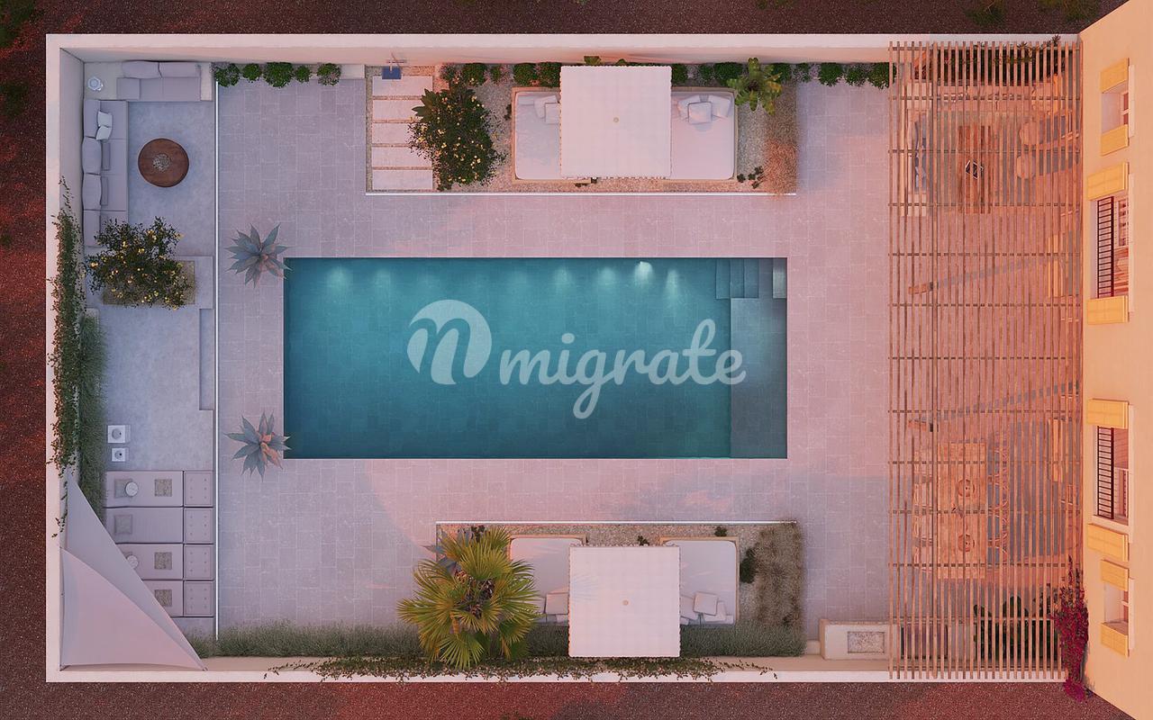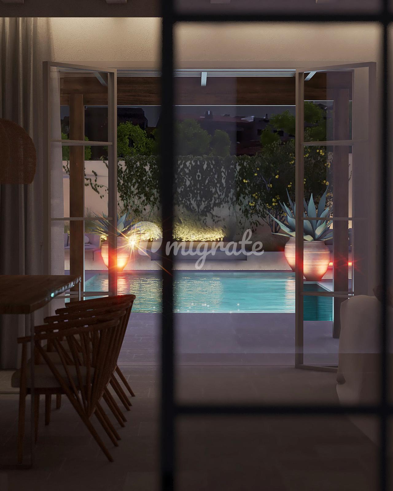 Первый этаж: на уровне улицы есть гараж на одну машину, холл, гостевой туалет, кабинет, кухня, открытая для столовой, гостиная, а на том же уровне есть выход в частный сад с бассейном 40 м2.