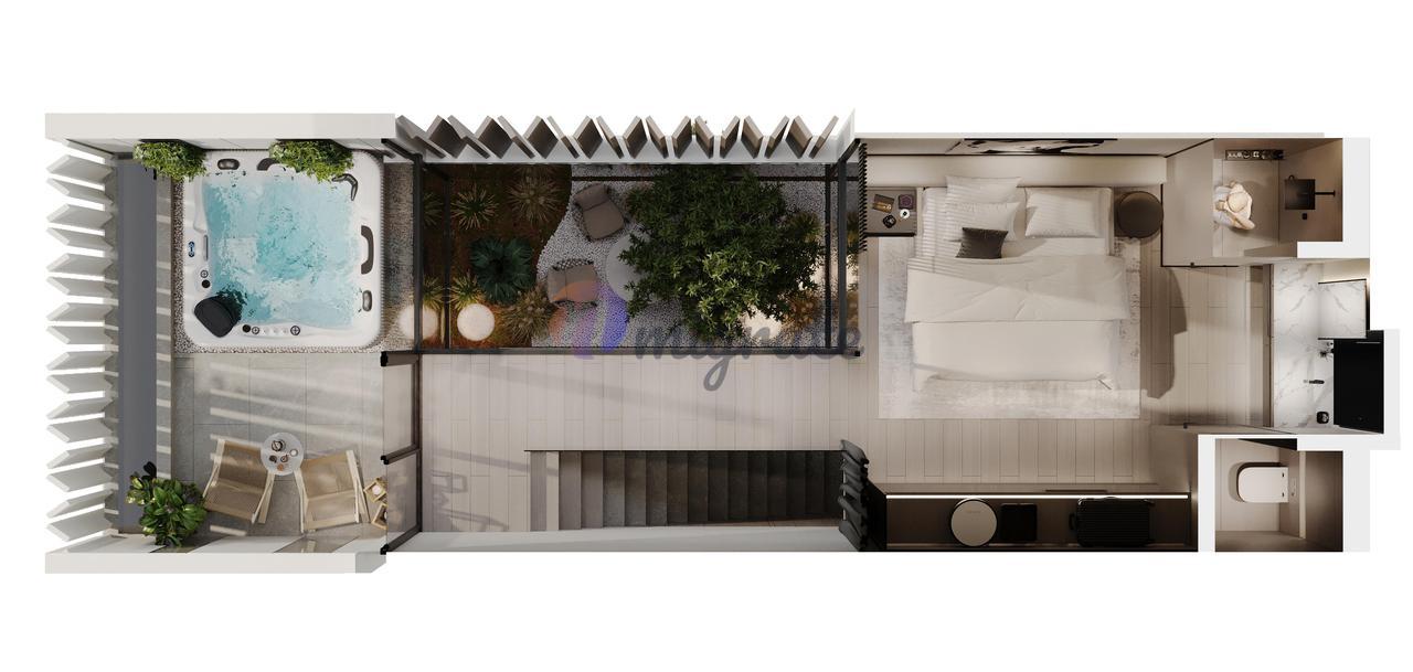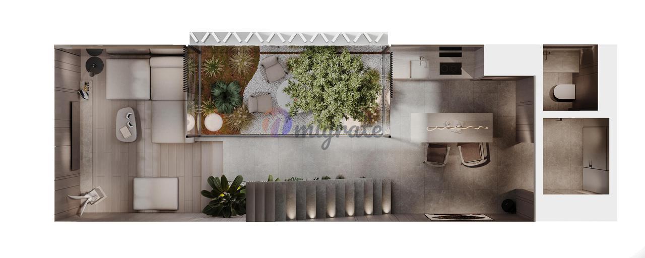 1-спальная вилла в Чангу. Всего 14 лотов. 1 этаж: гостиная с игровой приставкой smart-tv, внутренний сад под открытым небом, кухня и обеденная зона, гостевой санузел. 2 этаж: джакузи, спальная зона с большой кроватью, ванная комната,. место для хранения. На вилле имеется парковка для байков и система "умный дом".