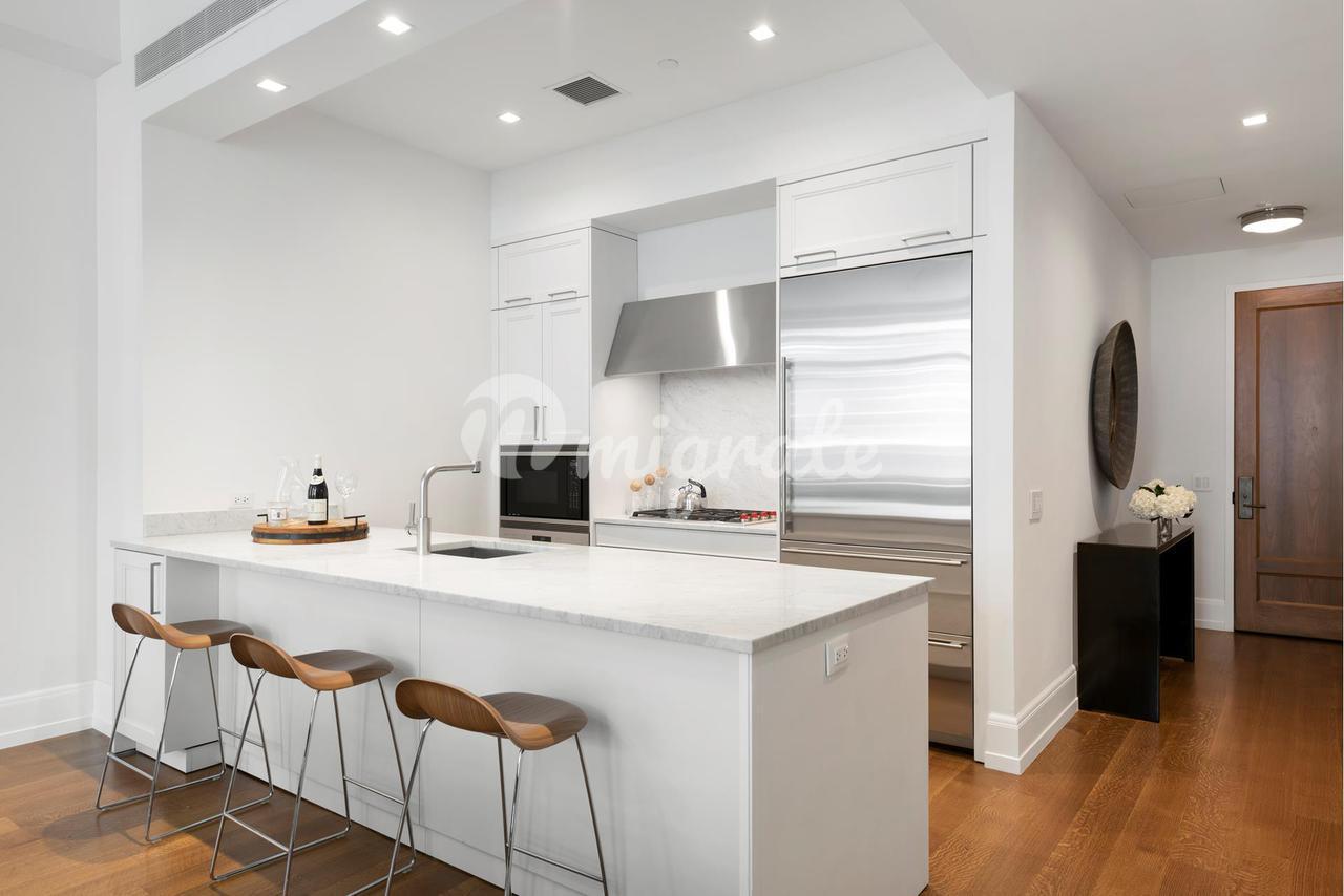 Кухня шеф-повара оборудована холодильником Subzero, охладителем вина Subzero, вентилируемой плитой Wolf и вытяжкой, духовкой Wolf, встроенной микроволновой печью Wolf и посудомоечной машиной Miele, а также островом изящных размеров, отделанным мрамором Carrera, который идеально подходит для приготовления блюд и развлечений.