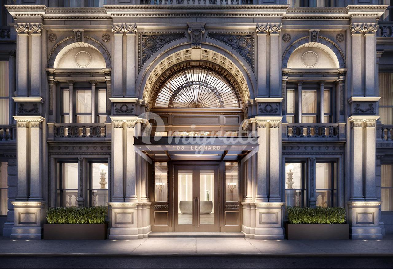 Отель 108 Leonard предлагает скрытую приемную для автомобилей, включая услуги парковщика, и три роскошных обслуживаемых вестибюля, каждое из которых имеет собственный лифт. Он предлагает как уединенный опыт бутик-здания, так и широту более 20 000 квадратных футов оздоровительных удобств. Отмеченная наградами дизайнерская фирма Jeffrey Beers International скрупулезно отреставрировала знаменитый архитектор McKim Mead & White, построенный в стиле итальянского Возрождения эпохи Возрождения; мастерски воплощая отчетливо современную, но неподвластную времени точку зрения в самом культовом вековом здании Трайбеки.