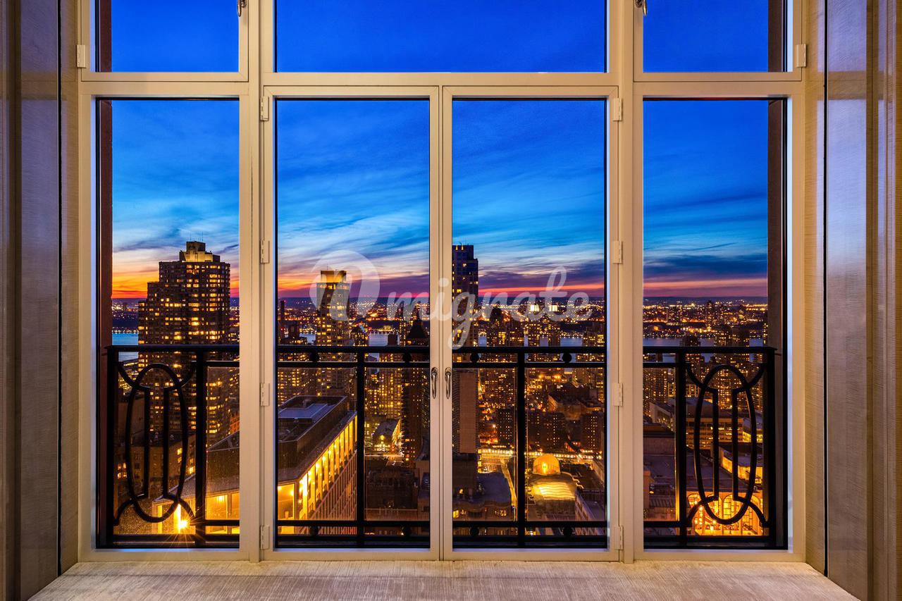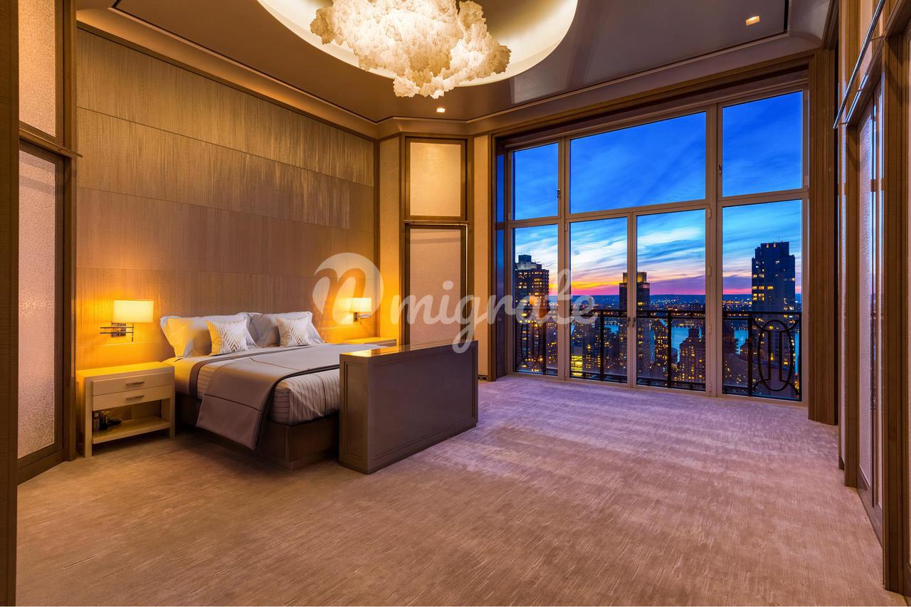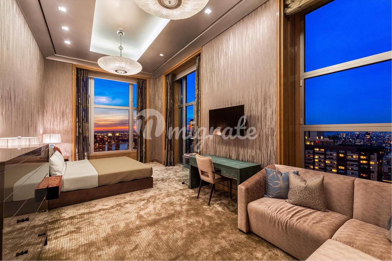 Вторичный люкс BR Еще одна массивная спальня с невероятным видом Центральный парк и река Гудзон Джульетта Балкон Окна от пола до потолка с сиденьями у окна Затемнение и солнечные оттенки Две потрясающие люстры Зал ожидания