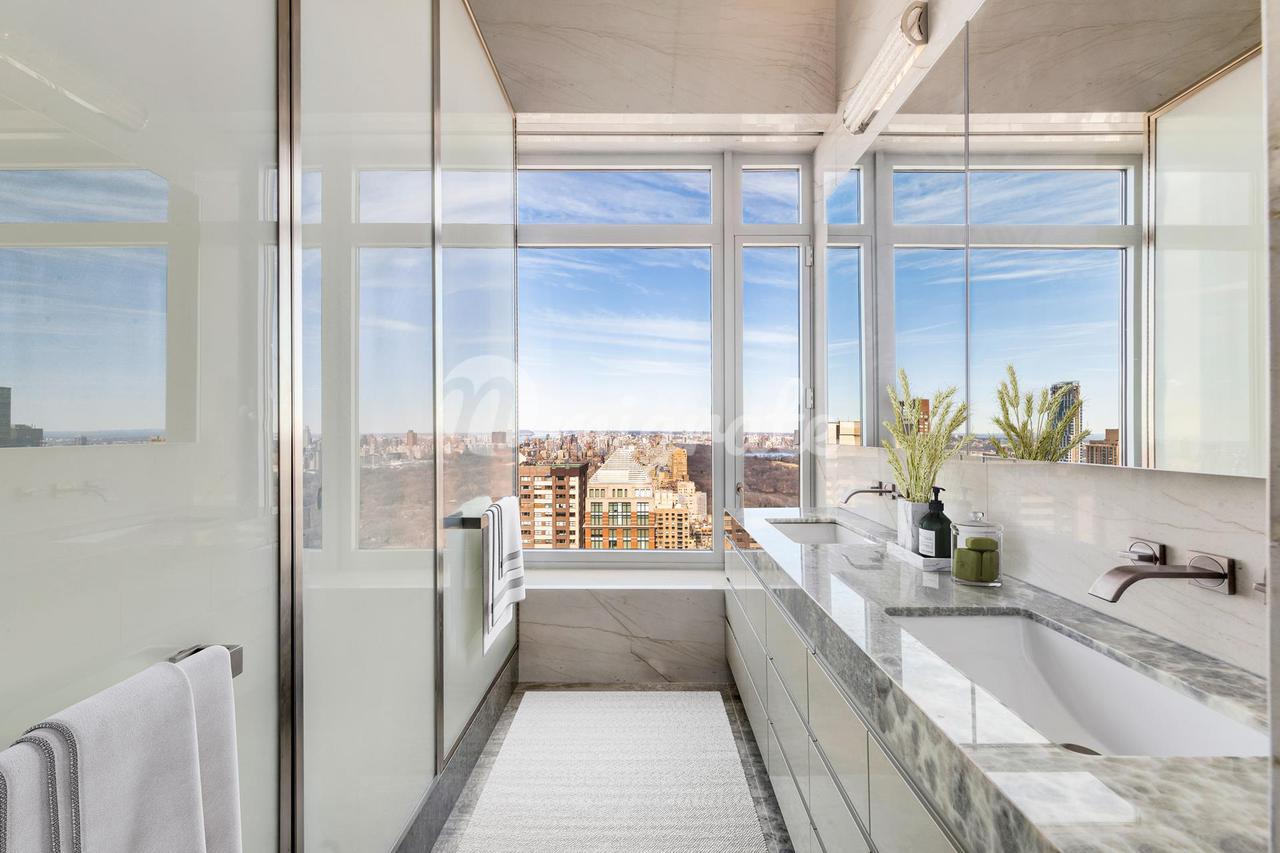 Вторичная ванная комната Windowed BA с видом на Центральный парк Двойная раковина со стеклянной душевой кабиной японский ЛАВ Хрустальные подвески Полы с подогревом Гардеробная комната Бельевой шкаф