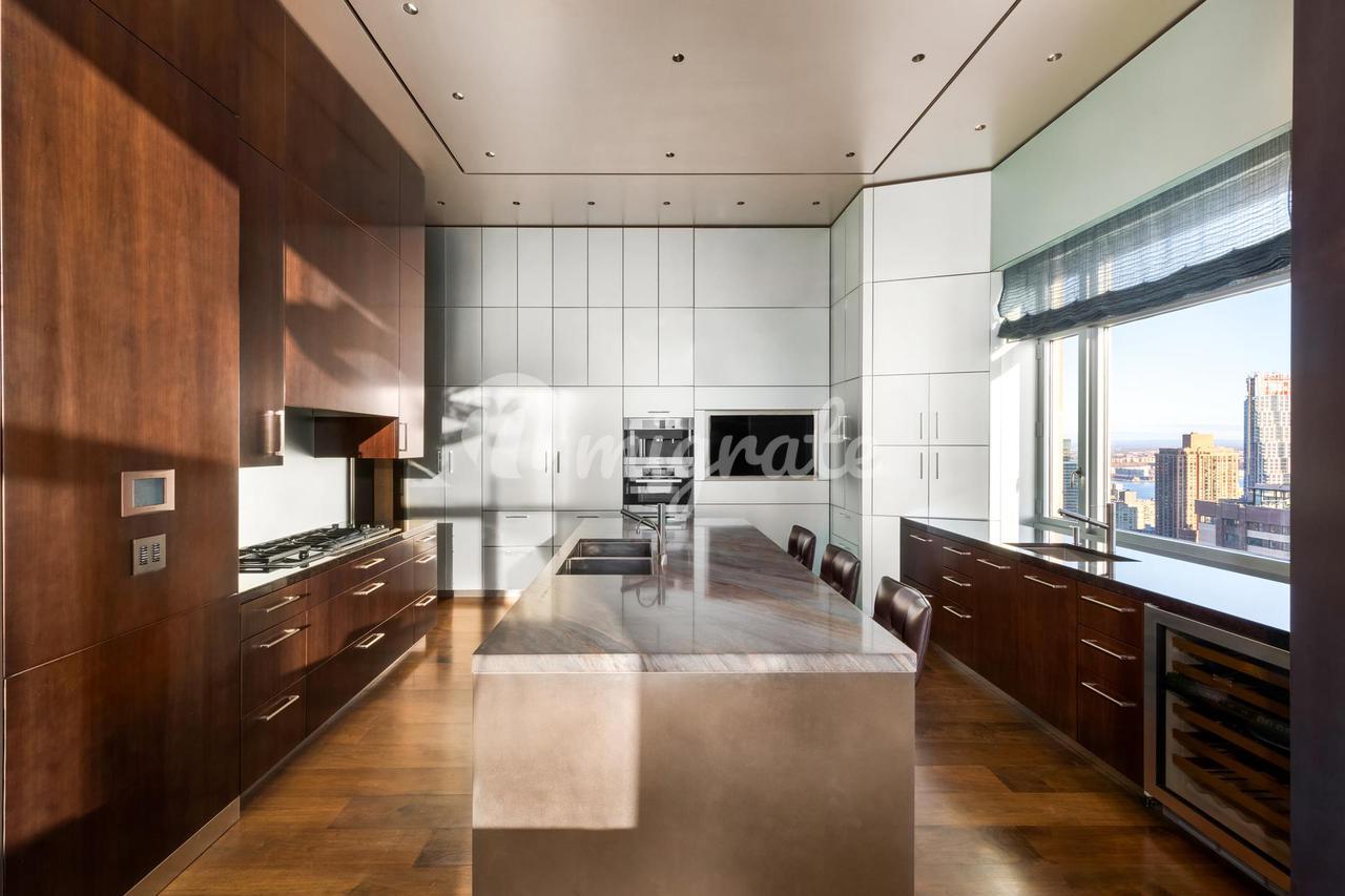 Дизайнерская кухня Сент-Чарльз из Нью-Йорка Массивное окно с видом на Центральный парк Вместимость стойки до 4 человек Шкафы со стеклянными панелями Мебель из орехового дерева Вентилируемая газовая плита / электрическая духовка 2 холодильника 4 морозильные камеры 4 посудомоечные машины Винный холодильник + барная стойка Служебный вход для персонала