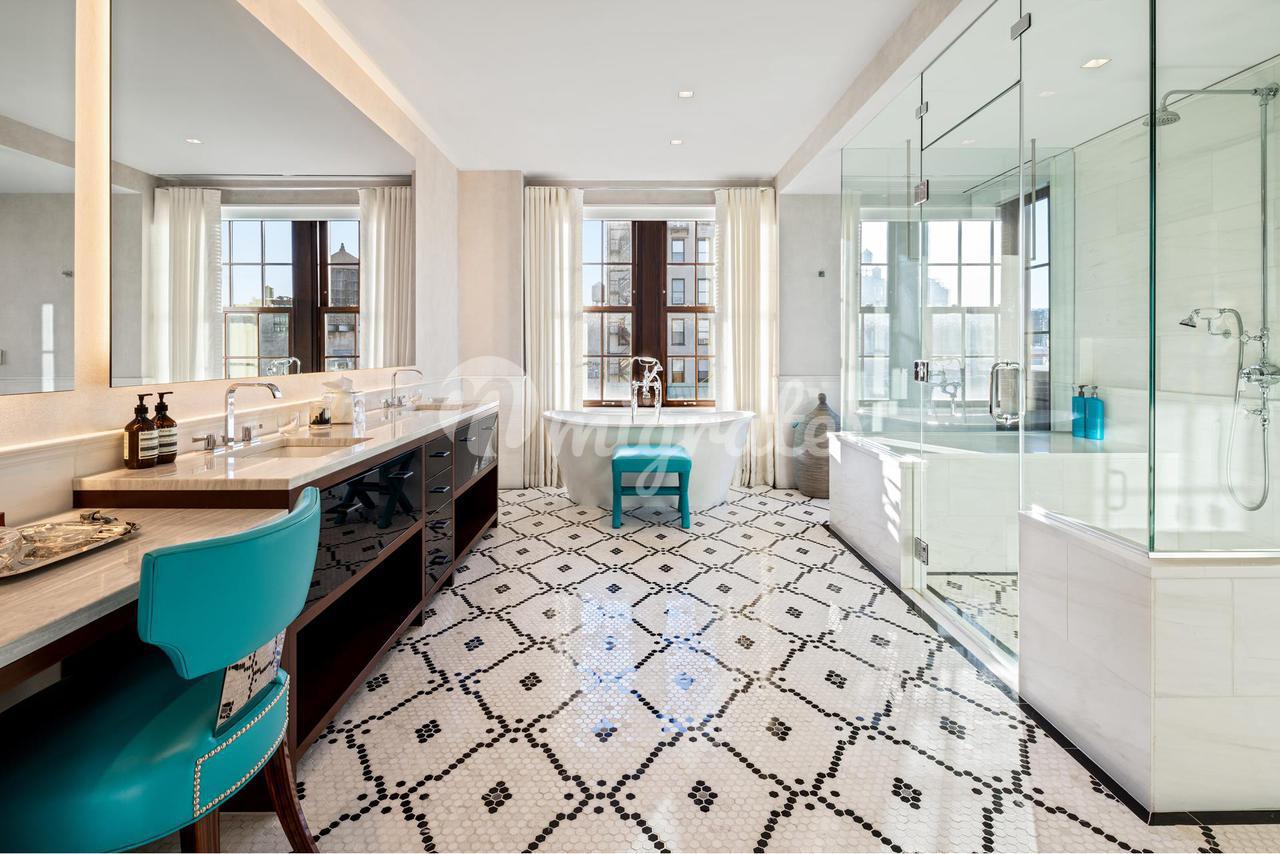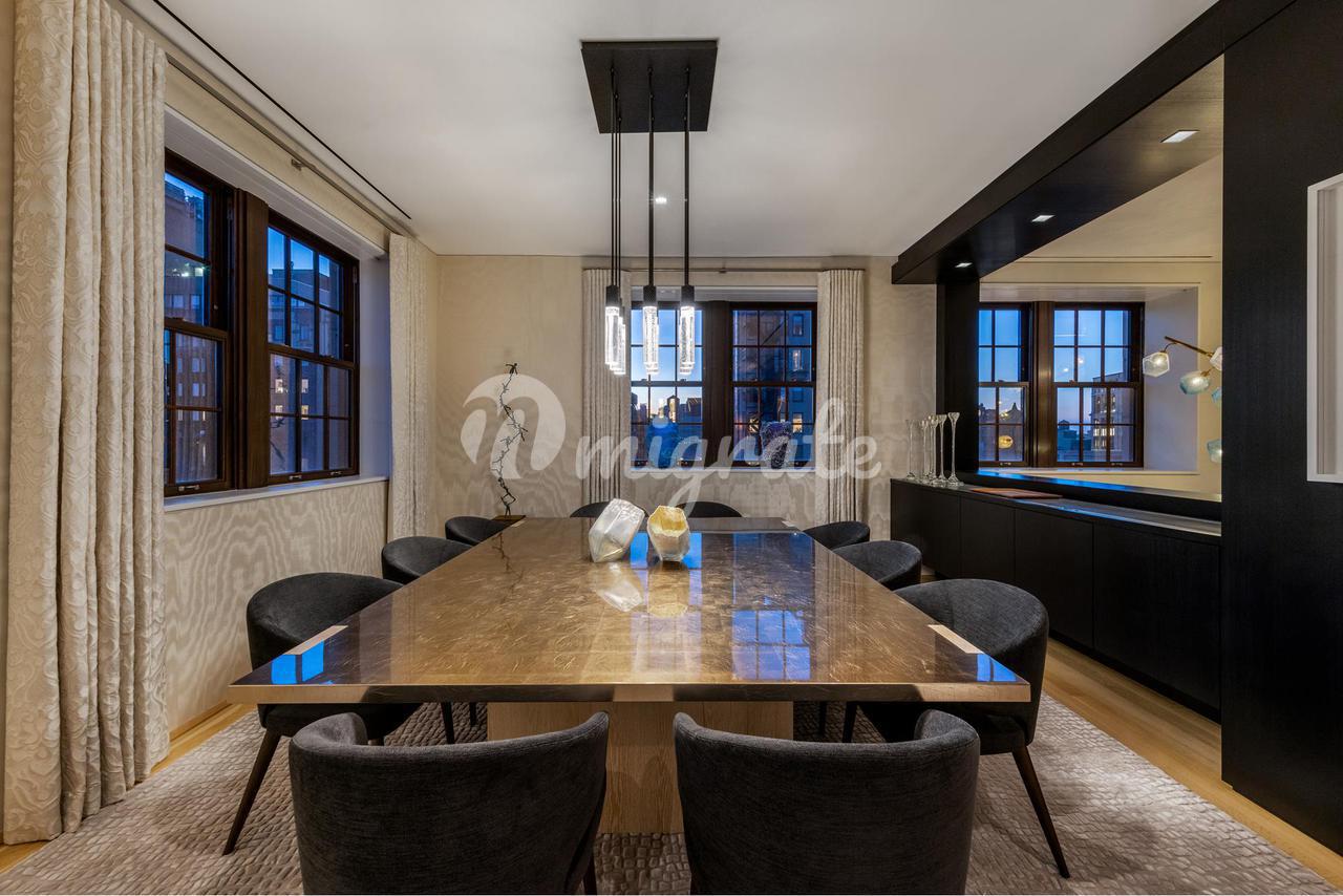 Величественный Большой зал с открытыми окнами на юг, Запад и Восток может похвастаться прекрасным солнечным светом в течение всего дня через большие створчатые окна. Обширное развлекательное пространство выходит на одну из самых больших террас дома, с которой открывается беспрепятственный вид на центр Манхэттена, включая Всемирный торговый центр One, мосты в центре города и за его пределами для проживания в помещении / на открытом воздухе и элегантных развлечений. В этой резиденции есть камин с изготовленной на заказ каминной полкой из мрамора и камня, замысловатая лепнина из белого дуба рифленой огранки и столярные изделия, а также стильный встроенный бар с мраморными стойками и мозаичной плиткой Adko. Открытое пространство гостиной и столовой плавно перетекает в галерею, кухню-столовую, дамскую комнату и кабинет с прямым выходом на террасы, выходящие как на север, так и на юг. К угловой кухне и кабинету шеф-повара с окнами примыкает еще одна просторная терраса, с которой открывается вид на достопримечательности Верхнего и среднего Манхэттена, такие как Эмпайр Стейт и Крайслер Билдинг. Кухня оборудована столешницами из полированного мрамора в виде скульптур, задней панелью Bardiglio и обоями Hermes. Первоклассная бытовая техника включает в себя полный набор бытовой техники Gaggenau, включая газовую плиту с 5 конфорками и вентилируемой вытяжкой, двойную духовку с выдвижным ящиком для подогрева, посудомоечную машину и винный холодильник.