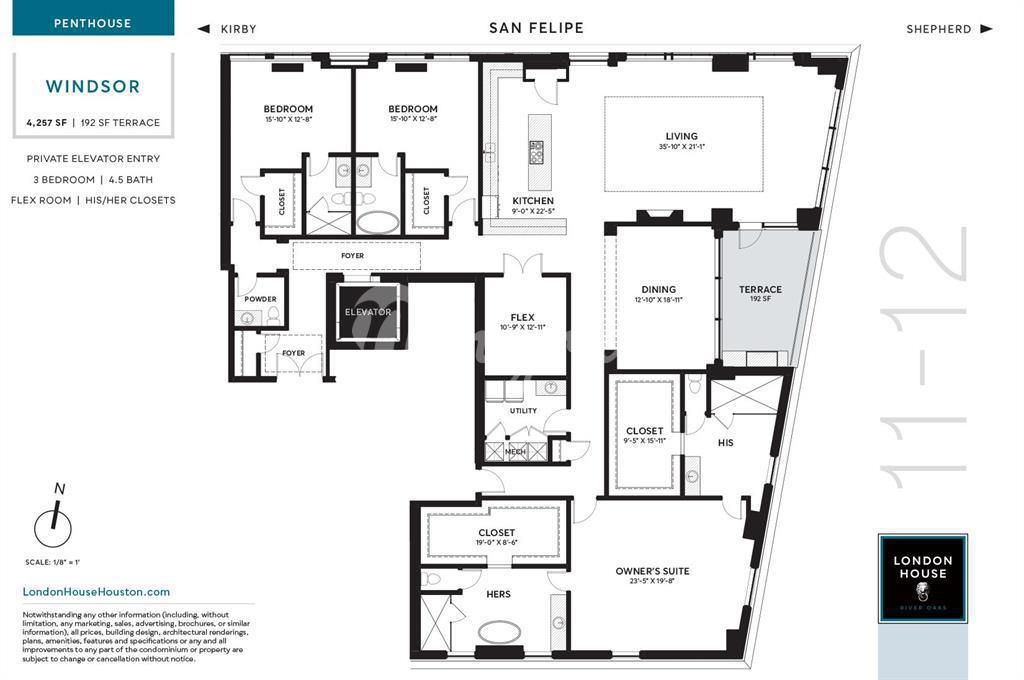 Добро пожаловать в Лондонский дом, расположенный в нескольких шагах от престижного загородного клуба River Oaks, где вас ждут элегантность и эксклюзивность. Построенный выдающимися строителями Рэндаллом и Натали Дэвис и возвышающийся на 12 этажей над Сан-Фелипе, Лондонский дом предлагает захватывающий вид на живописные окружающие поместья. Основанная на традиционной архитектуре Лондона, эта бутик-коллекция из двадцати трех домов предлагает комфортную жизнь во всей красе. Планировка нашего ВИНДЗОРСКОГО пентхауса является воплощением роскоши. Эта резиденция состоит из 3 спален и просторной спальни владельца с двумя роскошными ванными комнатами и двумя гардеробными. Идеально подходит для приема гостей, официальная столовая, два фойе и отдельный вход на лифте. Открытая терраса и летняя кухня. Внутри - мебель Eggersmann, бытовая техника Gaggenau, бесконтактные технологии для здоровья, газовый камин, высококачественные камни и фарфор на ваш выбор. Варианты адаптации пентхауса WINDSOR к вашим спецификациям предоставляются по запросу.