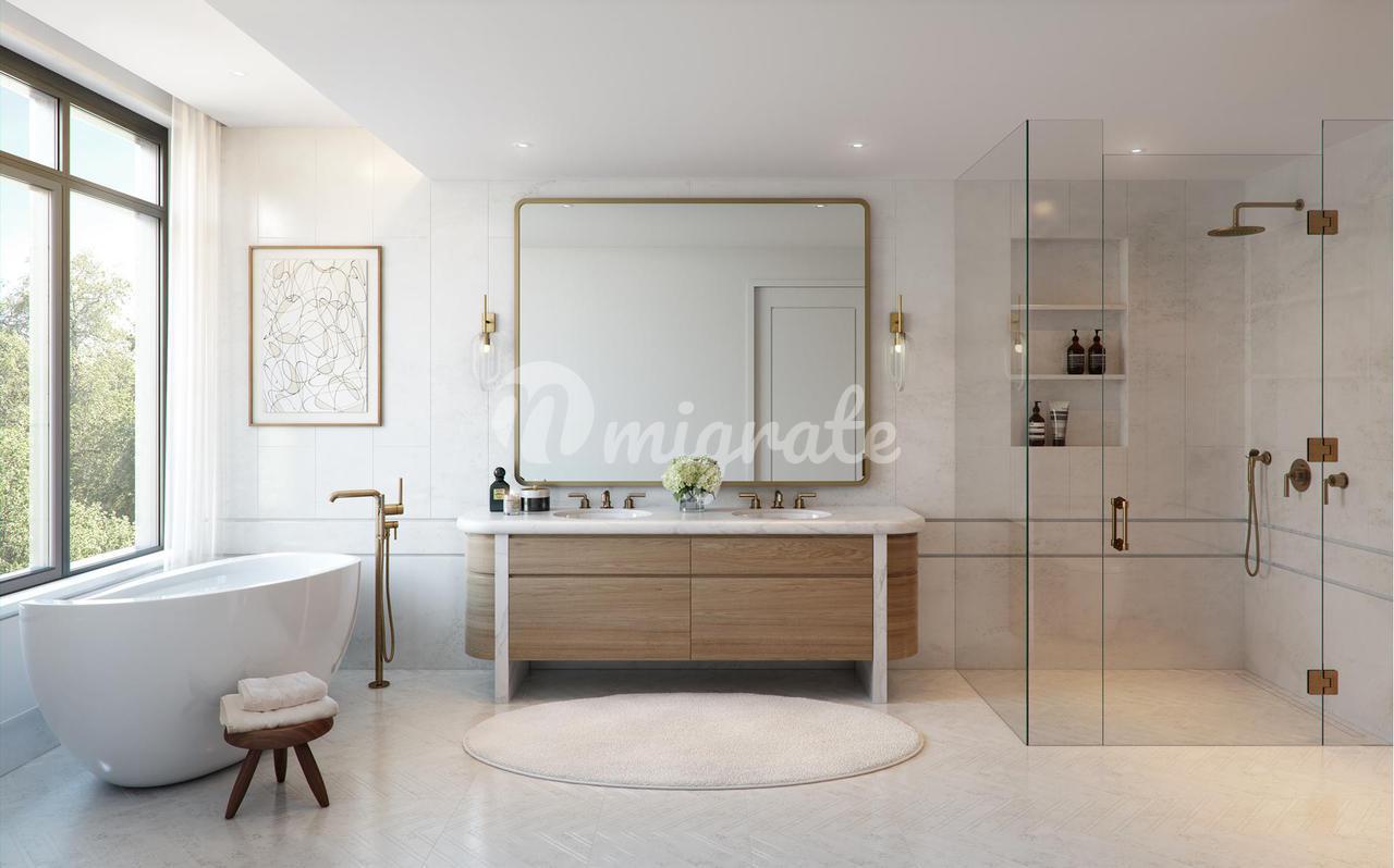 В дополнение к основной спальне есть еще две спальни с хорошими пропорциями и отличными гардеробными. Второстепенные ванные комнаты украшены стенами из отшлифованной керамогранитной плитки Flandre Marmi, изготовленными на заказ столешницами для туалетных столиков и акцентной стеной ванны с мраморным мозаичным полом от Asian Statuario. Подстольная ванна MTI Andrea предлагает элегантные ощущения от купания в сочетании со старинной латунной арматурой Henry, подстольной раковиной Clara от Waterworks и унитазом Duravit. Завершает этот замечательный дом прачечная со стиральной и сушильной машинами Bosch, расположенными рядом друг с другом.