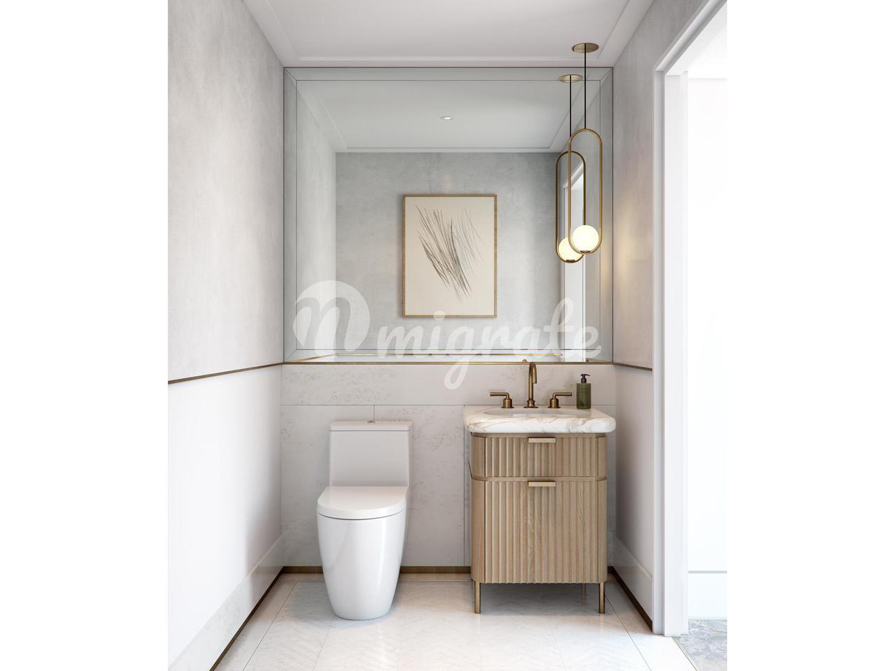 Фирменная туалетная комната, расположенная прямо у входа в фойе, украшена полами и стенами из отшлифованной белой мраморной плитки Намибии, а также столешницей из мраморной плиты Crema Delicato. Особенности включают светильники Генри из старинной латуни и унитаз Duravit.