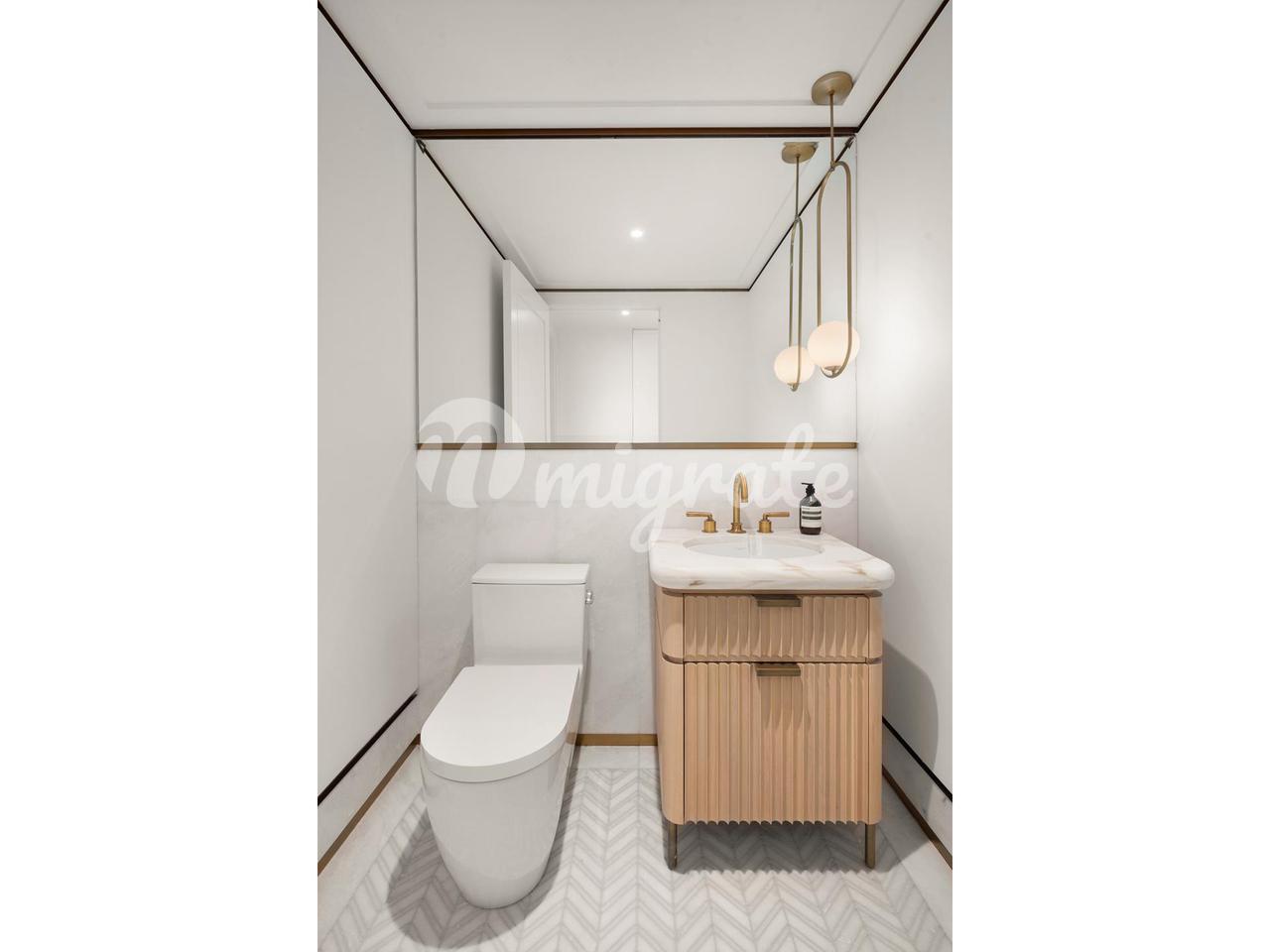 Фирменная туалетная комната, расположенная прямо у входа в фойе, украшена полами и стенами из отшлифованной белой мраморной плитки Намибии, а также столешницей из мраморной плиты Crema Delicato. Особенности включают светильники Генри из старинной латуни и унитаз Duravit.