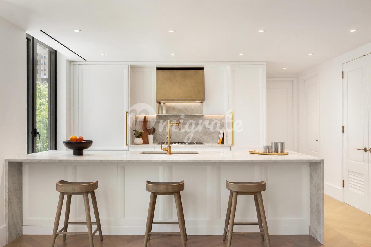 Изысканная разделенная резиденция с двумя спальнями и двумя ванными комнатами с потолками высотой 9 футов 5 дюймов и дубовым полом в елочку, сочетающая в себе классическую элегантность и изящное, функциональное жилое пространство. Формальное фойе ведет в великолепную большую комнату и кухню с окнами на запад. столовая представляет собой роскошную открытую кухню, спроектированную по индивидуальному заказу, с белыми лакированными шкафами, столешницами и фартуком из кварцита Taj Mahal.Кухня полностью оборудована современной встроенной бытовой техникой Gaggenau, включая 5-конфорочную варочную панель из нержавеющей стали, холодильник, морозильная камера, посудомоечная машина и встроенная 24-дюймовая микроволновая печь.