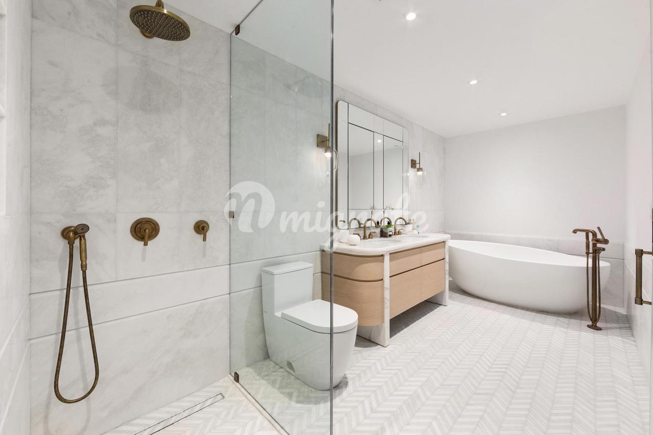 В дополнение к основной спальне есть дополнительная спальня с хорошими пропорциями и отличной гардеробной. Дополнительная ванная комната украшена стенами из отшлифованной керамогранитной плитки Flandre Marmi, изготовленными на заказ столешницами умывальника и акцентной стеной ванны с мраморным мозаичным полом от Asian Statuario. Подстольная ванна предлагает элегантные ощущения от купания в сочетании со старинной латунной арматурой Henry, встраиваемой раковиной Clara от Waterworks и унитазом Duravit. Завершает этот замечательный дом прачечная со стиральной и сушильной машинами Bosch, расположенными рядом друг с другом.