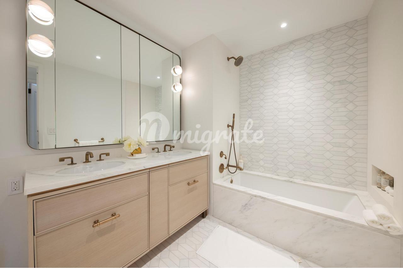 Фирменная туалетная комната, расположенная прямо у входа в фойе, украшена полами и стенами из отшлифованной белой мраморной плитки Намибии, а также столешницей из мраморной плиты Crema Delicato. Особенности включают светильники Генри из старинной латуни и унитаз Duravit.