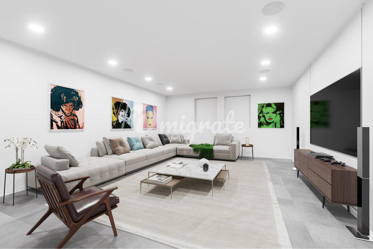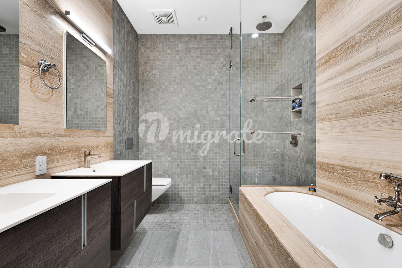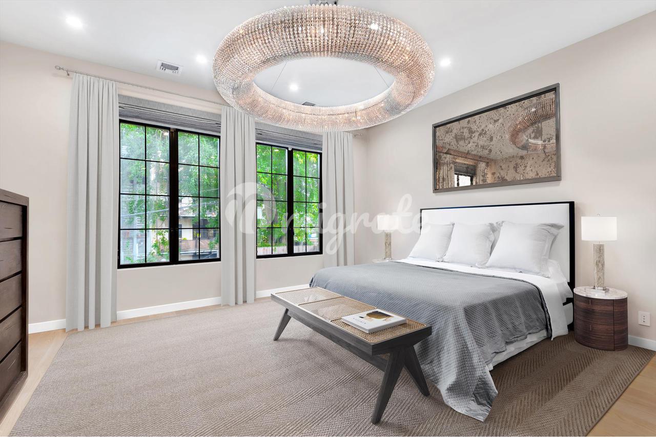 Главная спальня, выходящая на север, оснащена поразительной 72-дюймовой хрустальной люстрой в виде ореола и завидной гардеробной, дополненной двойными широкими окнами. В основной ванной комнате есть пол с подогревом, первоклассная сантехника Hansgrohe, двойная раковина Porcelanosa, туалет от Duravit, глубокая ванна и отдельная душевая кабина со стеклянными стенами прекрасно подчеркнуты столешницами из травертина и мозаичной настенной плиткой.