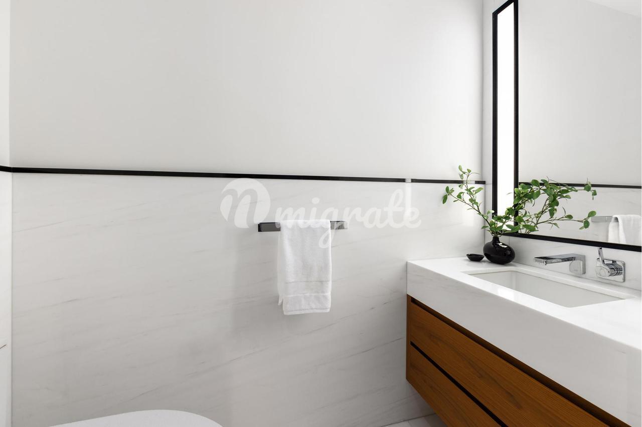 Основной люкс, занимающий юго-восточный угол дома, может похвастаться огромной гардеробной с дополнительным местом для гардероба и основной ванной с окнами, похожими на спа. Ванна оснащена элегантной отдельно стоящей ванной и ватерклозетом от Duravit, стены отделаны мраморными плитами San Nicola в полный рост, полы из мрамора Bianco Dolomiti с подогревом, туалетный столик из орехового дерева с двумя раковинами Kohler Kathryn и столешницей из мрамора Dolomiti с водопадом, смесители Dornbracht LULU с полированным хромированным покрытием и застекленная душевая кабина с тропическим душем и ручными душевыми насадками.