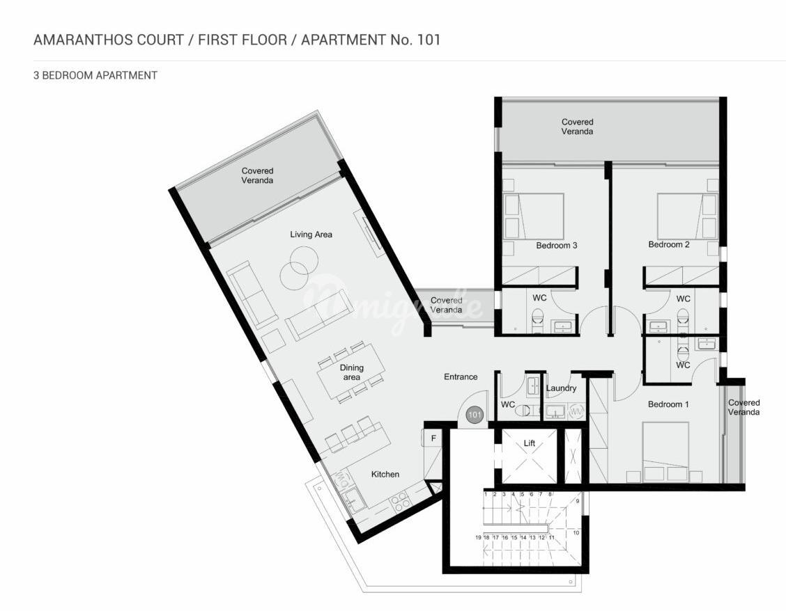 Современные линии здания и V-образный вид сверху придают ему уникальный вид. Всего в здании 3 этажа, на каждом из которых расположены апартаменты с 3 спальнями. Внутренние помещения каждой квартиры очень просторные, с пространством открытой планировки между кухней, обеденной зоной и гостиной зоной. Во всех спальнях есть отдельный туалет и ванная комната, а также выход на крытую веранду. Все апартаменты идентичны по планировке, за исключением пентхауса с большой открытой и полузакрытой террасой на крыше. Каждая квартира дополнена прачечной, гостевым туалетом и доступом к лифту, крытой парковкой и кладовой. Комплекс находится в непосредственной близости от моря, набережной и гавани Пафоса, торгового центра Kings Avenue и всех удобств в центре города.