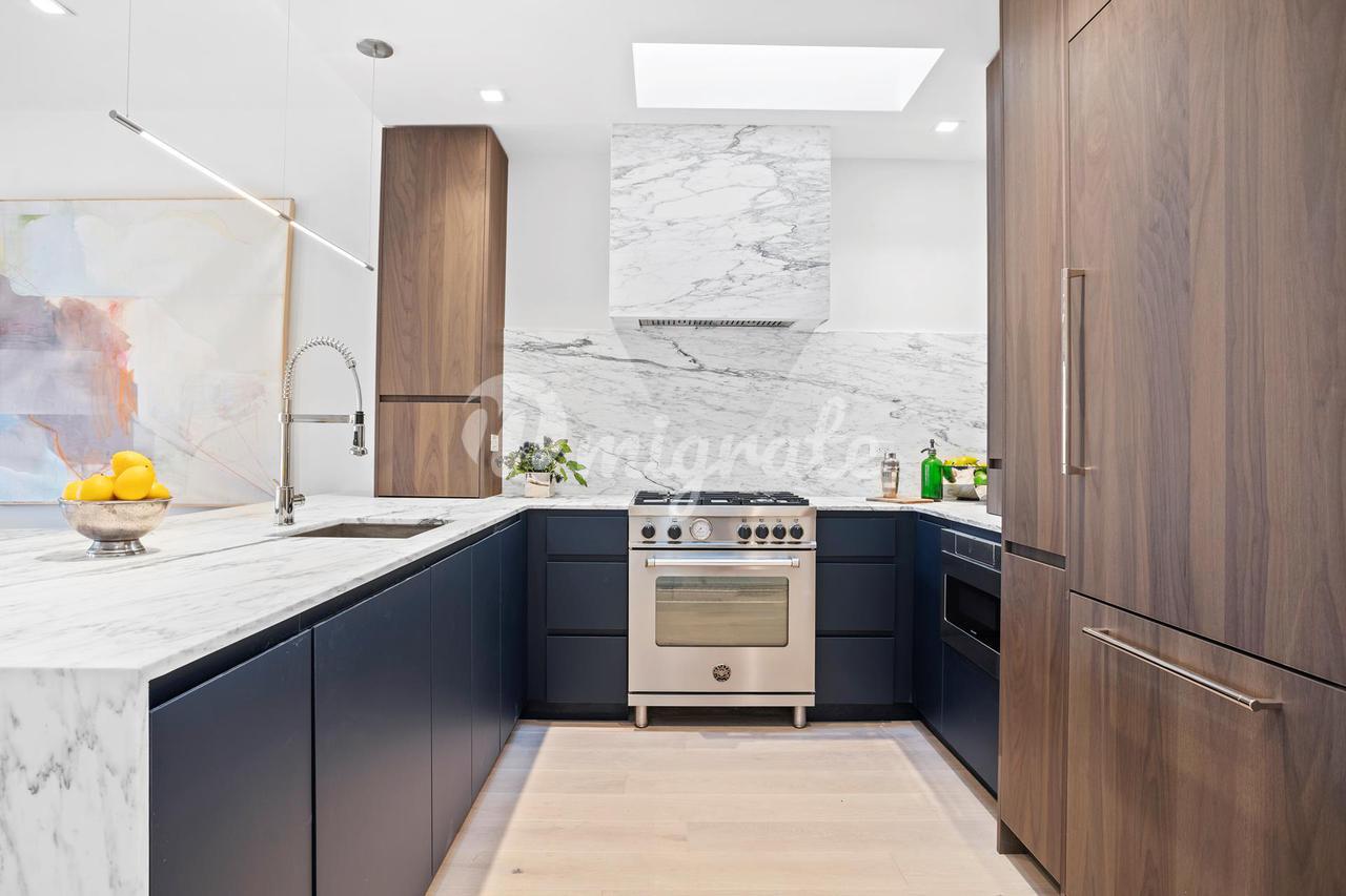 Открытая кухня шеф-повара оснащена плитой Bertozzoni с вентилируемой вытяжкой, окруженной мраморной окантовкой, посудомоечной машиной Bosch и холодильником с полностью встроенными индивидуальными панелями. Сдержанный современный дизайн подчеркивается двухцветной мебелью из бельгийского ореха и полированными столешницами Calacatta Cervaiole, которые подчеркнуты индивидуальной подсветкой Juniper.
