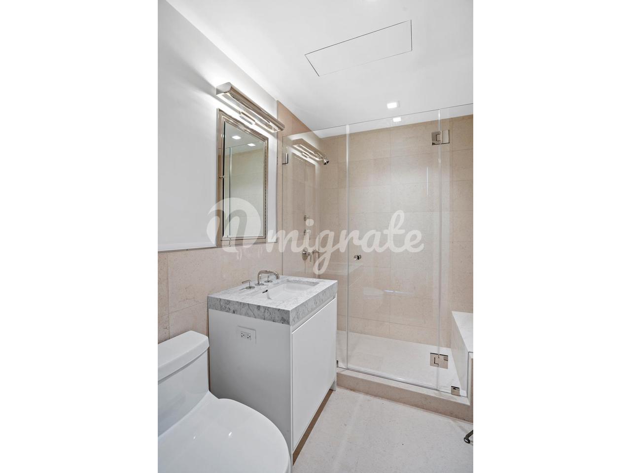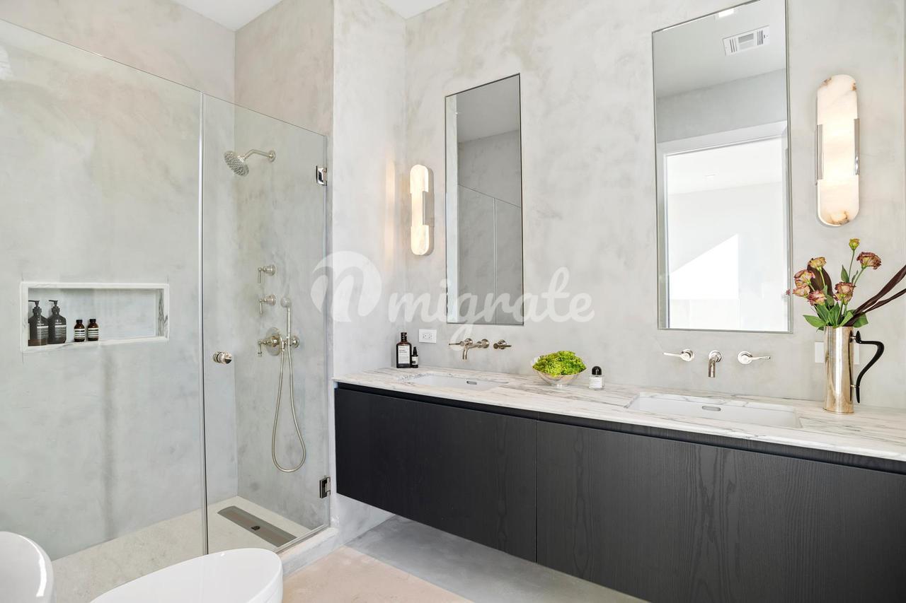 Основная спальня включает в себя большую гардеробную и ванную комнату с пятью светильниками. Отделка ванной комнаты выполнена из полированного никеля от Lefroy Brooks and Waterworks. Индивидуальные настенные туалетные столики дополняются мраморными столешницами Calacatta Cervaiole и нестандартным освещением.