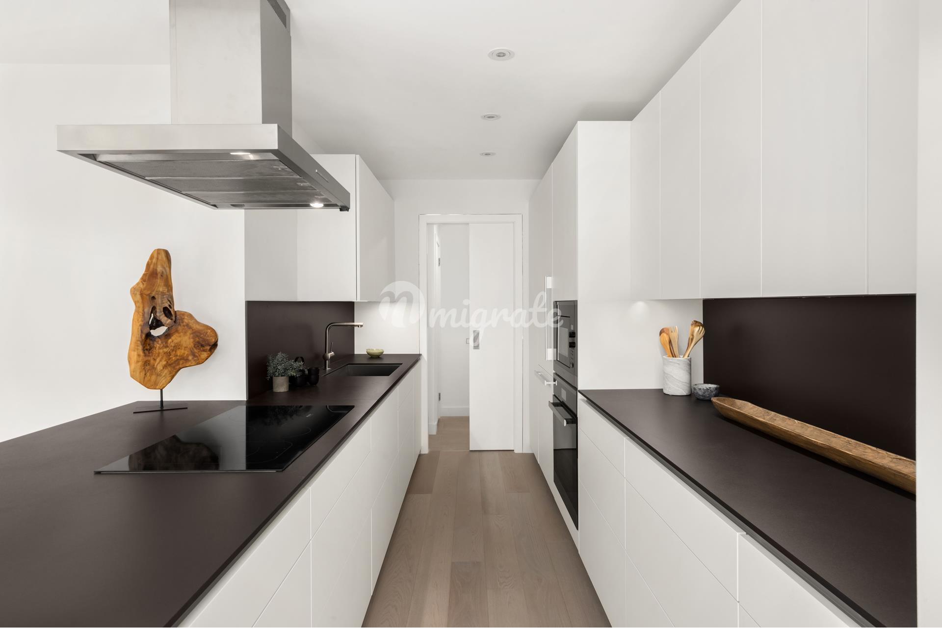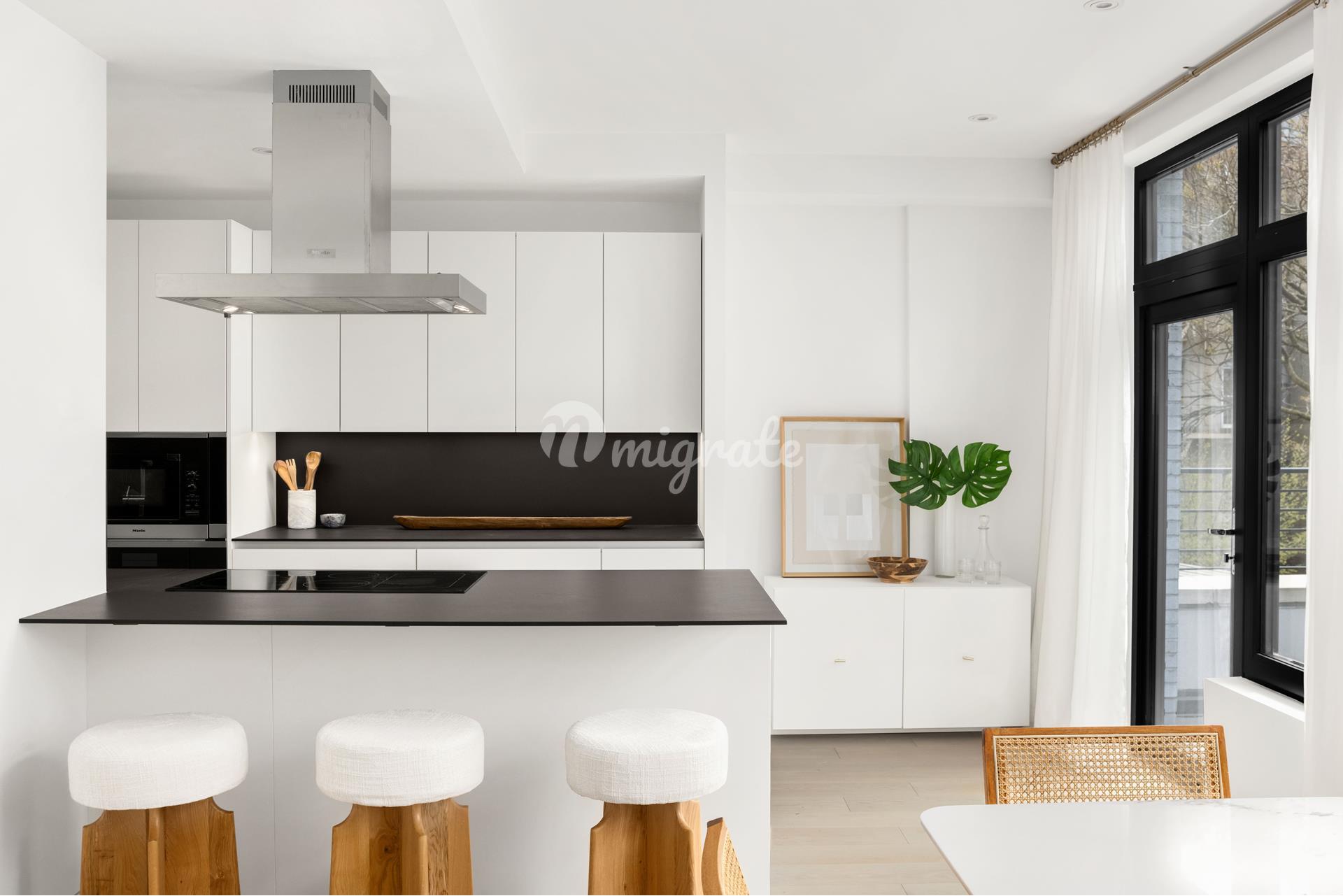 В классическом стиле таунхаусов высота потолков во всех этих резиденциях, начиная с 1-го этажа и заканчивая пентхаусами, очень высока. Большие поворотно-откидные окна в элегантных черных рамах создают стильную отделку, сочетающую в себе как современную, так и классическую роскошь. Эти окна изолированы для повышения энергоэффективности. Такой дизайн обеспечивает непревзойденное естественное освещение во всех домах. На этих полностью белых кухнях Poggenpohl с открытым островом, изготовленных на заказ, установлена современная бытовая техника Miele, включая конвекционную духовку, индукционную варочную панель, вытяжки с вентиляцией, а также посудомоечную машину Miele и холодильные установки. Столешницы и задние панели Dekton представлены на всех кухнях, а изготовленные на заказ дверцы шкафов с мягким закрыванием делают эти кухни современными и идеальными для использования с высокой функциональностью. Резиденции выходят окнами на северную и южную стороны.
