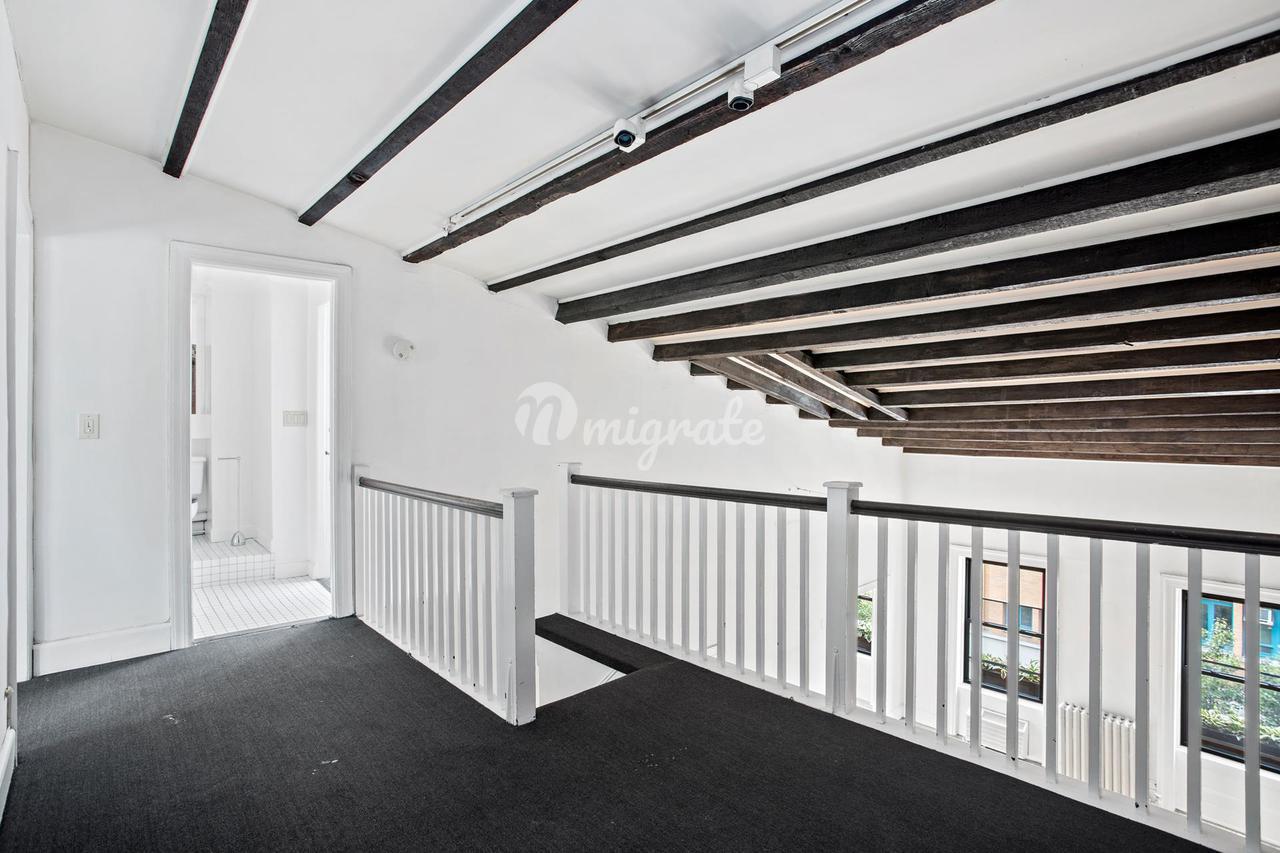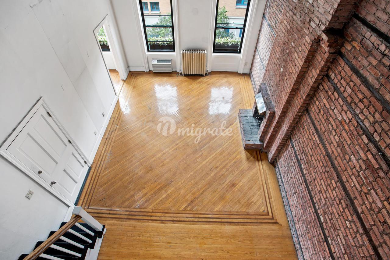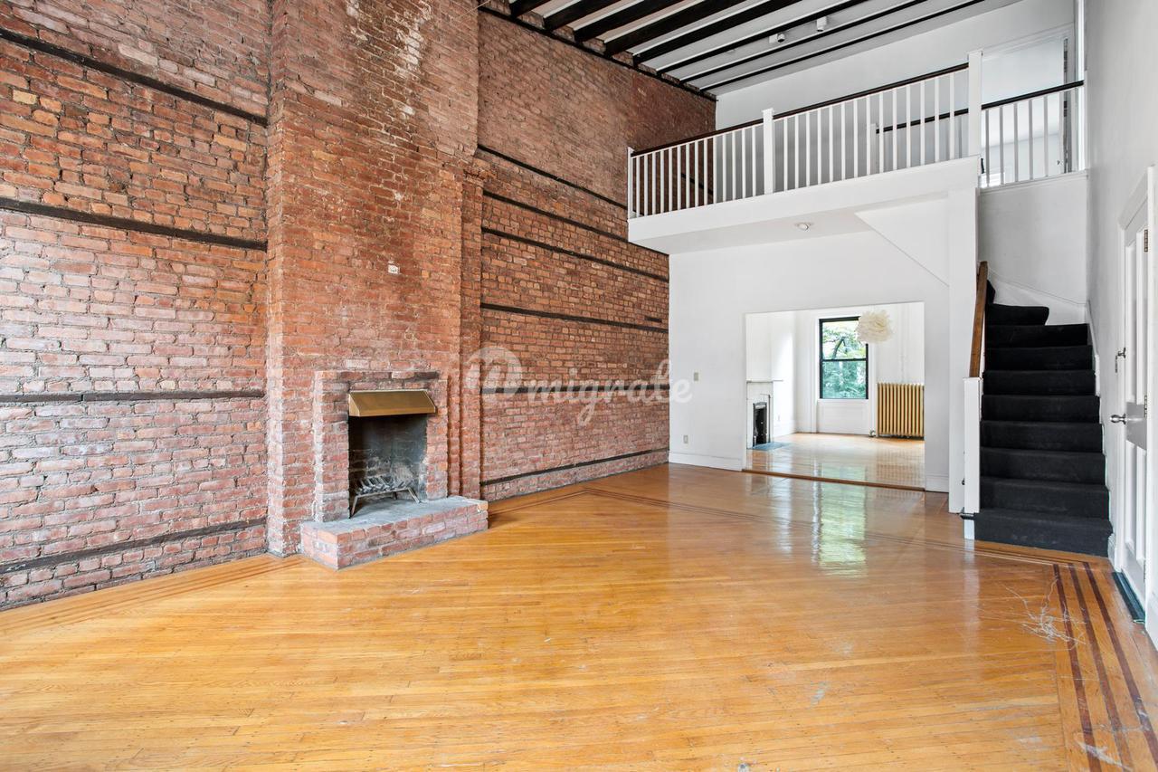 4-й этаж и мезонин: В этих светлых апартаментах на верхнем этаже есть замечательная большая комната с потолочными балками высотой 18 футов, камином и открытыми кирпичными стенами. Прекрасная столовая, кабинет с окнами / домашний офис и дамская комната. Лестница из большой комнаты ведет в спальню в мезонине. Из которого открывается вид на Эмпайр-стейт-билдинг, ванная комната с окном и гардеробная с мансардным окном.