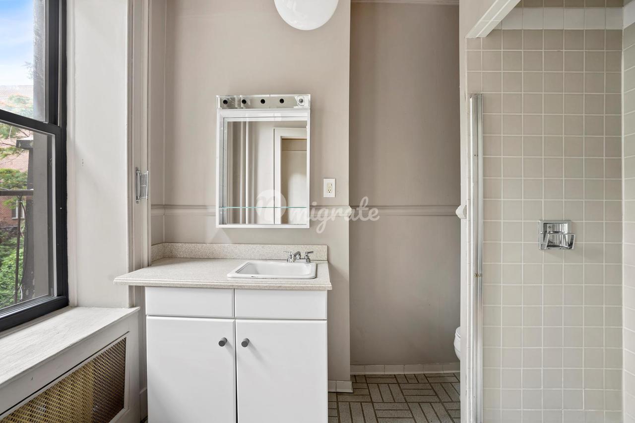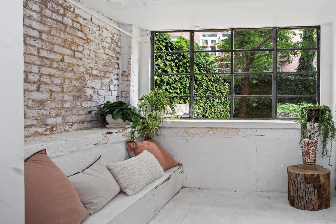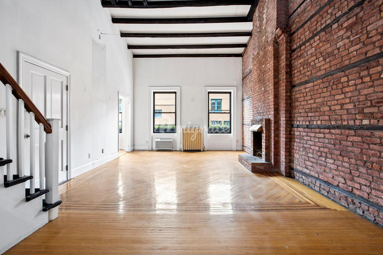 4-й этаж и мезонин: В этих светлых апартаментах на верхнем этаже есть замечательная большая комната с потолочными балками высотой 18 футов, камином и открытыми кирпичными стенами. Прекрасная столовая, кабинет с окнами / домашний офис и дамская комната. Лестница из большой комнаты ведет в спальню в мезонине. Из которого открывается вид на Эмпайр-стейт-билдинг, ванная комната с окном и гардеробная с мансардным окном.