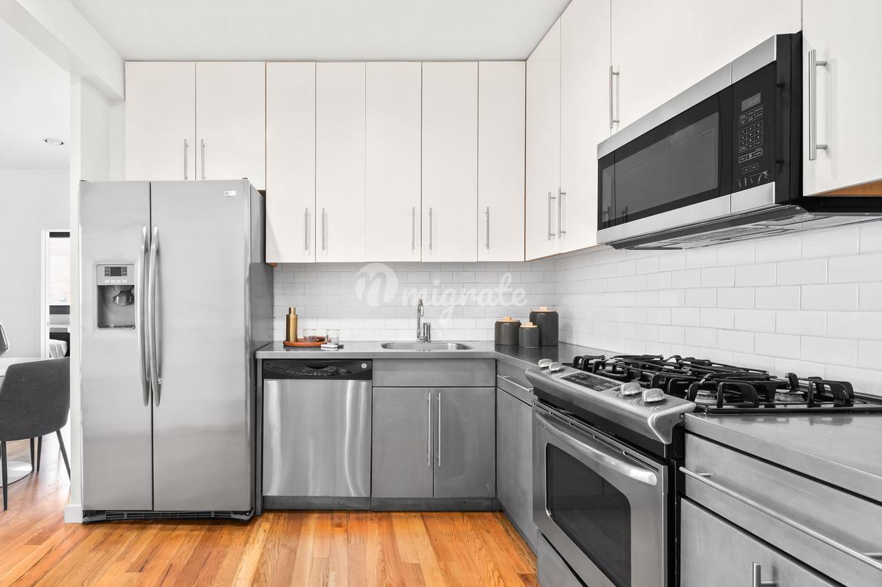 Пройдите в хорошо оборудованную открытую кухню с обильной белой и серой мебелью до потолка и приборами из нержавеющей стали для домашнего шеф-повара. Блестящие деревянные полы простираются по всему дому и в просторную гостиную/столовую. Из больших окон и стеклянной двери, ведущей на примыкающий отдельный балкон, открывается прекрасный вид на город с дивана или обеденного стола.