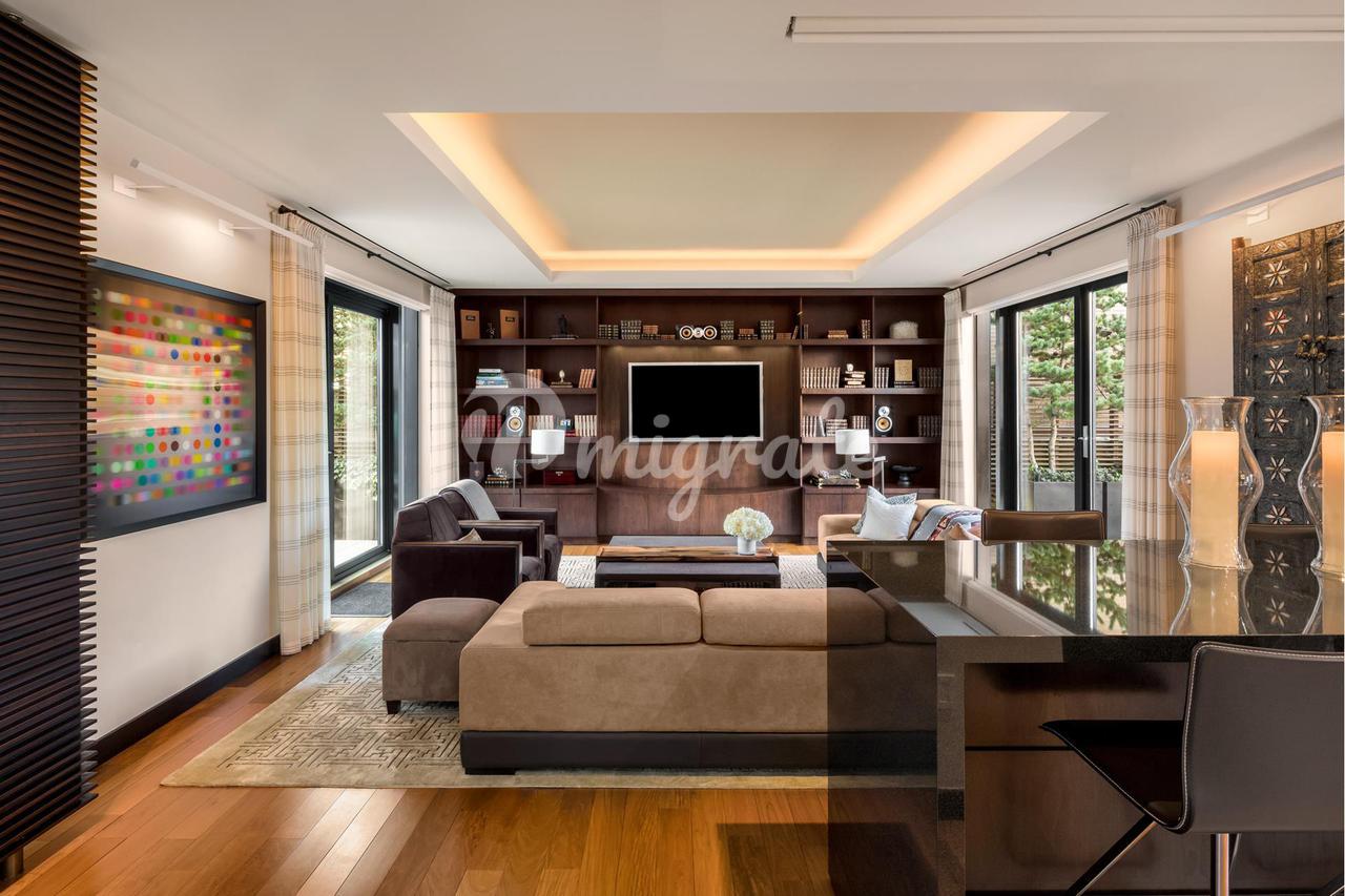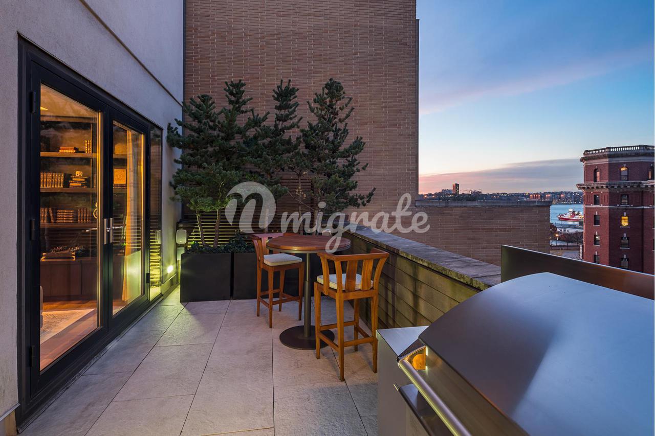 На первый уровень можно попасть через элегантное медное фойе и галерею, которые соединяются с развлекательными комнатами пентхауса. Гостиная, столовая с двойным стеклянным атриумом и прилегающая зона домашнего офиса выходят на юг и оснащены газовым камином. Гостиная выходит на две частные террасы первого уровня. С западной террасы и атриума открывается вид на реку Гудзон и набережную.