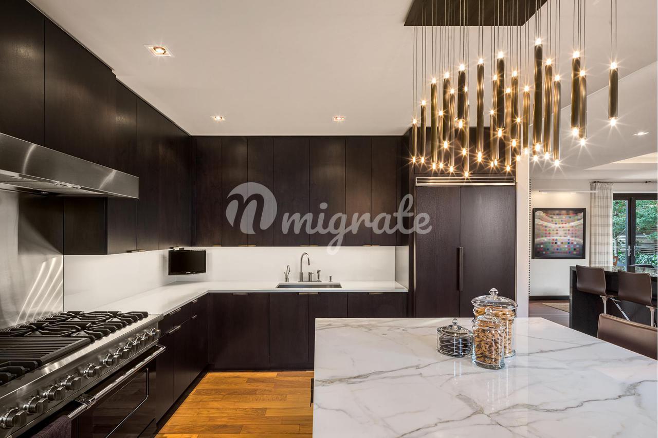 В открытой кухне шеф-повара есть кухонный остров, достаточно большой для четырех человек, а также двухместная барная стойка для завтрака. Индивидуальные шкафы, столешницы и высококачественная бытовая техника повсюду, включая две посудомоечные машины. Завершение первого уровня - это ванная комната и четвертая спальня дома.