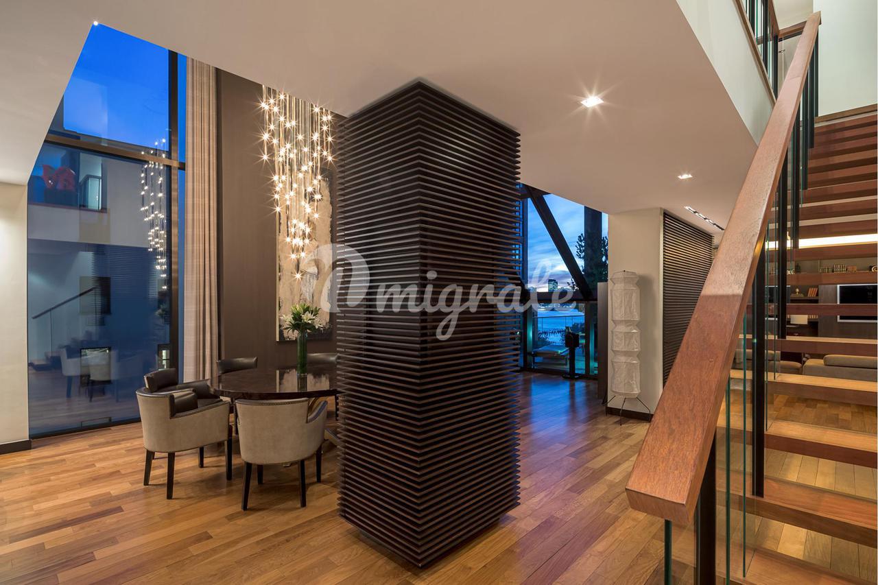 Penthouse-West имеет общую площадь 3844 квадратных метра, а также три большие частные террасы. Он имеет изящную планировку, охватывающую два уровня, с видом на реку и прекрасным освещением с южной, западной и северной сторон. Расположенный на вершине здания с его зелеными террасами, к которым можно подняться на запирающемся на ключ лифте, этот пентхаус отличается максимальным уединением и спокойствием. Ореховые полы, кленовые шкафы и высокие потолки присутствуют во всем доме.