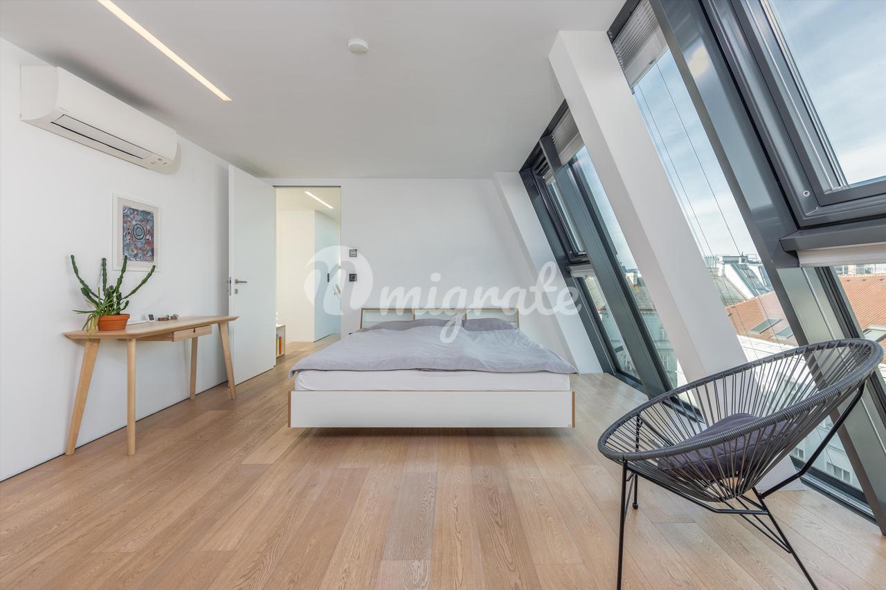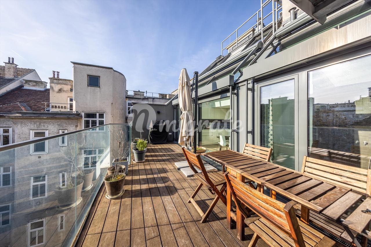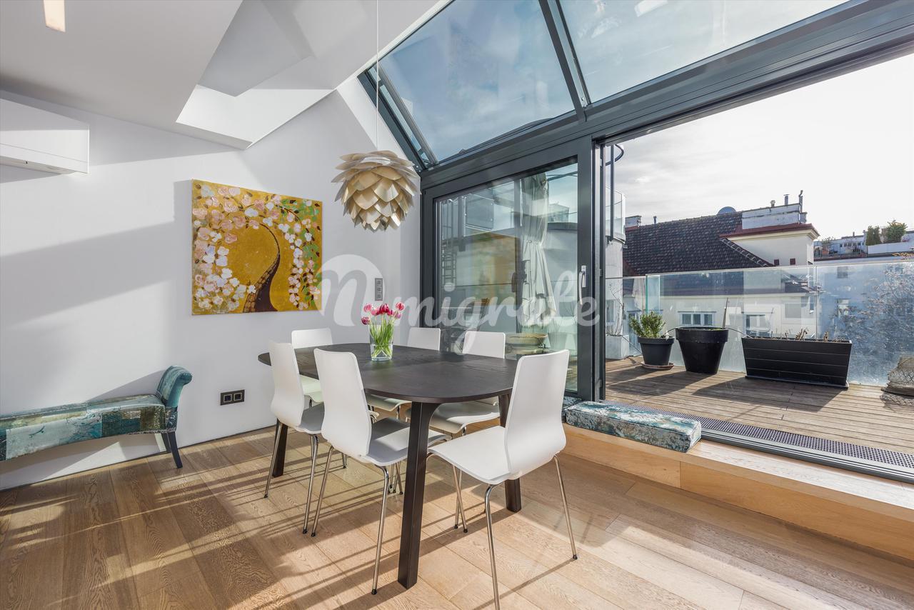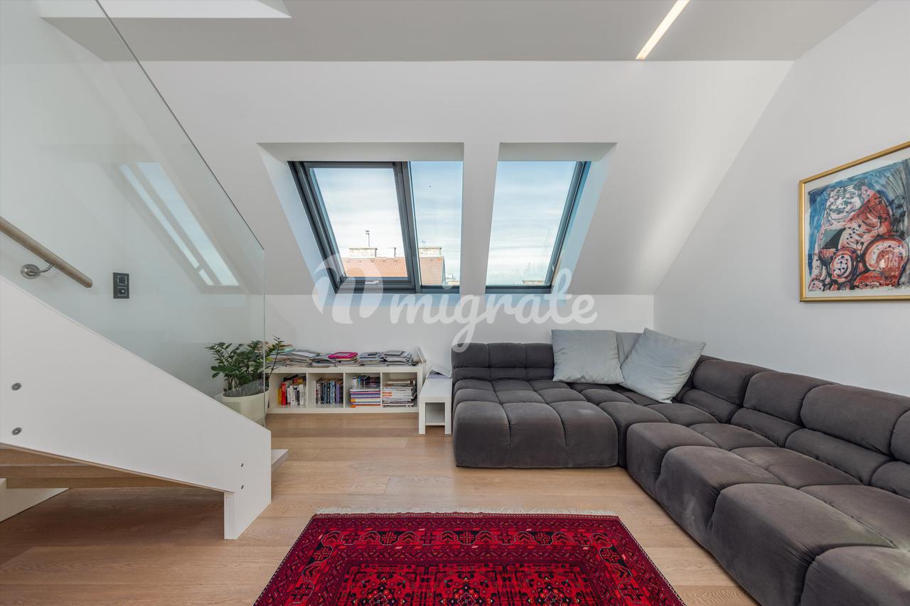 Мезонет был построен в 2016 году во время переоборудования крыши дома Gründerzeit. Недвижимость расположена в здании с лифтом и предлагает 160 кв. м жилой площади, распределенной на двух уровнях. Она состоит из прихожей, гостиной и полностью оборудованной кухни открытой планировки с обеденной зоной и выходом на террасу со стороны внутреннего двора на первом уровне. Две спальни с центральным доступом, ванная комната с душем, гостевой туалет и кладовая завершают этот уровень. На втором этаже находится главная спальня с душевой кабиной и ванной, галерея, офисная зона и небольшая терраса. В квартире также есть подвал и парковочное место в гараже с электрической зарядной станцией.