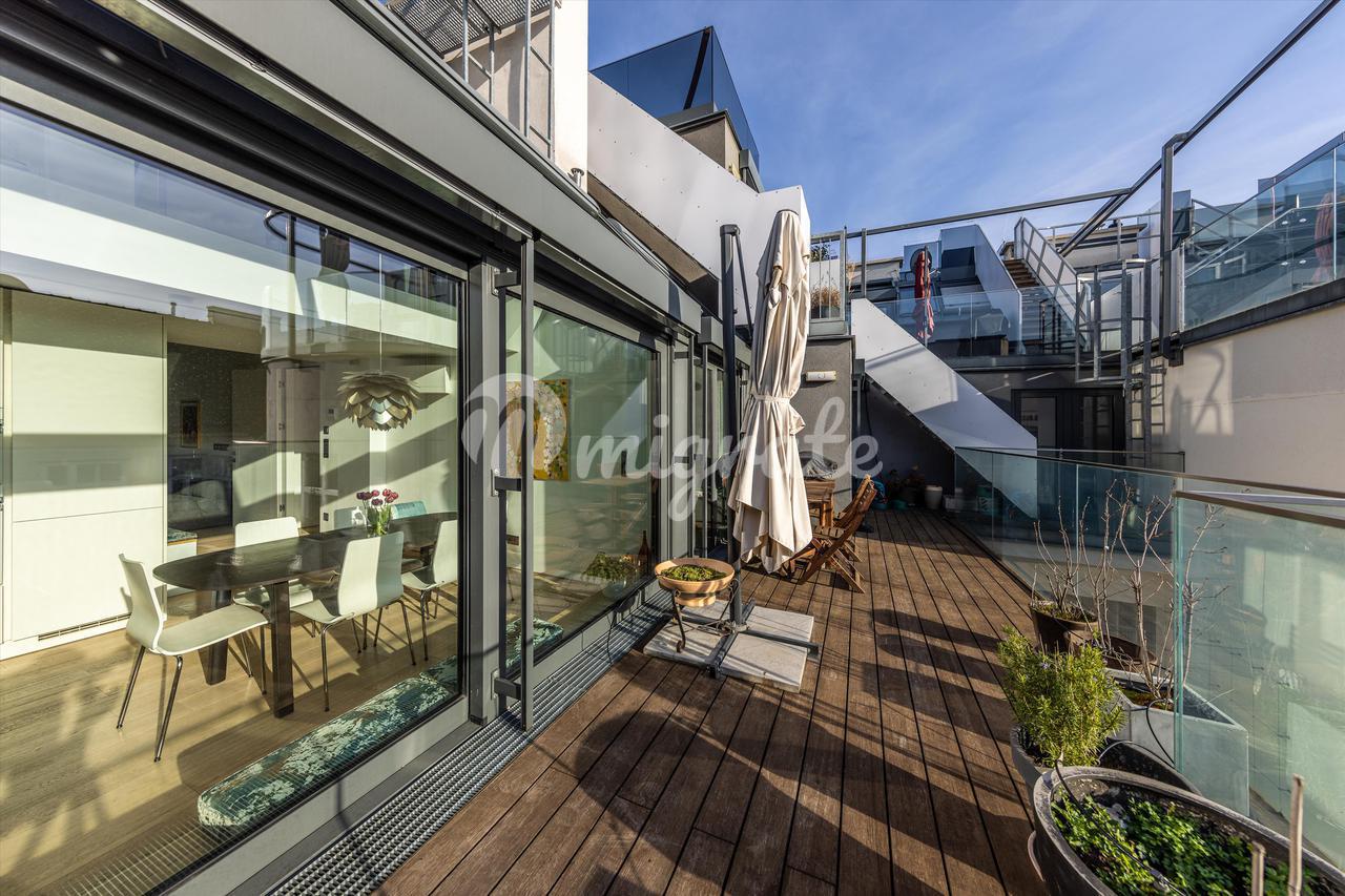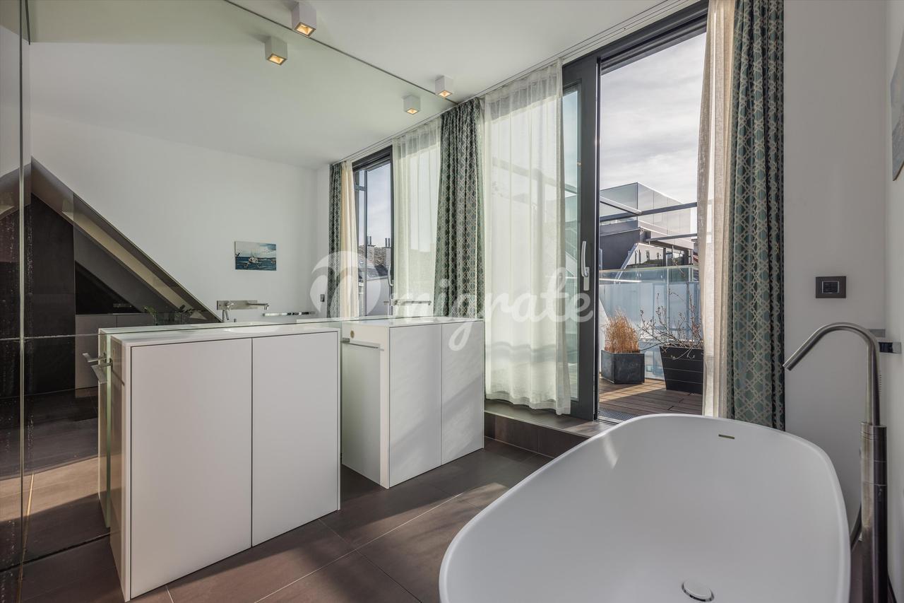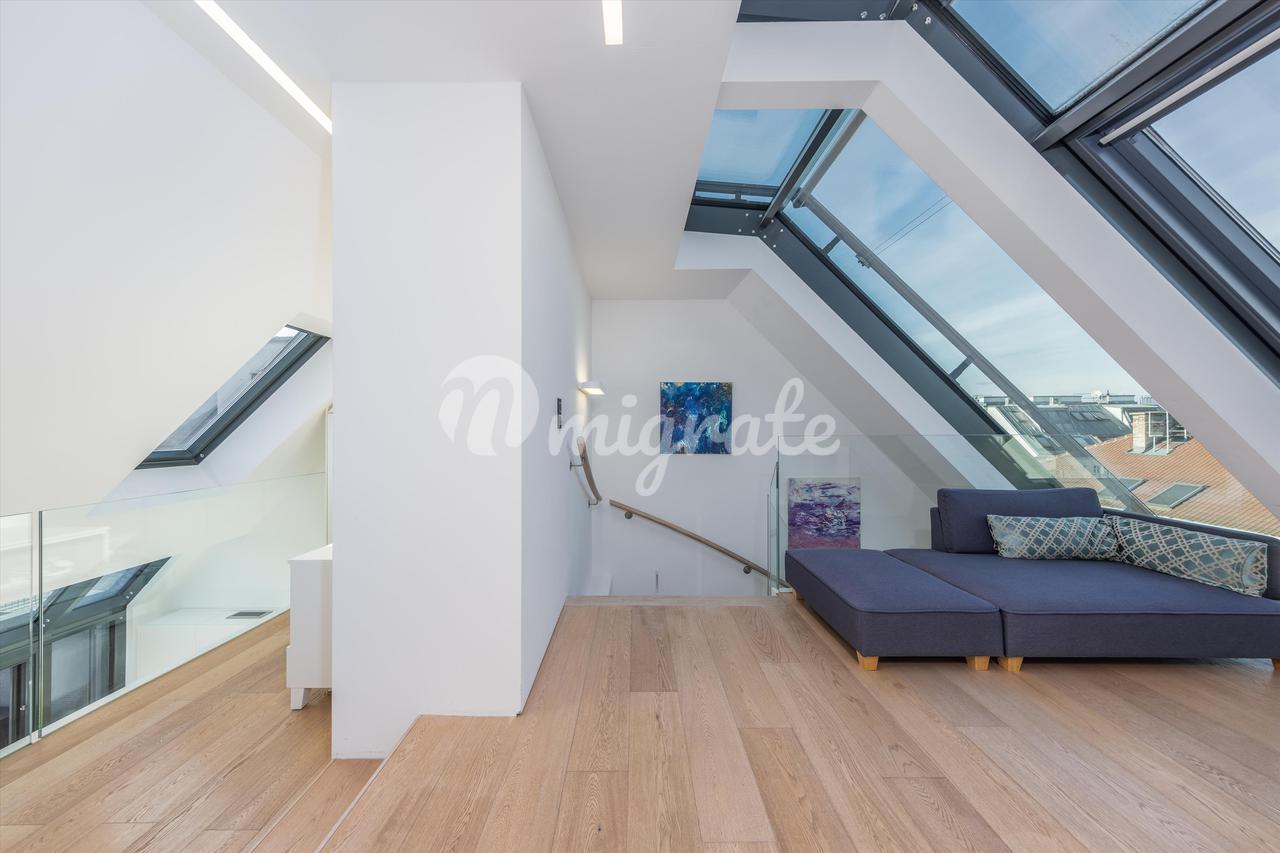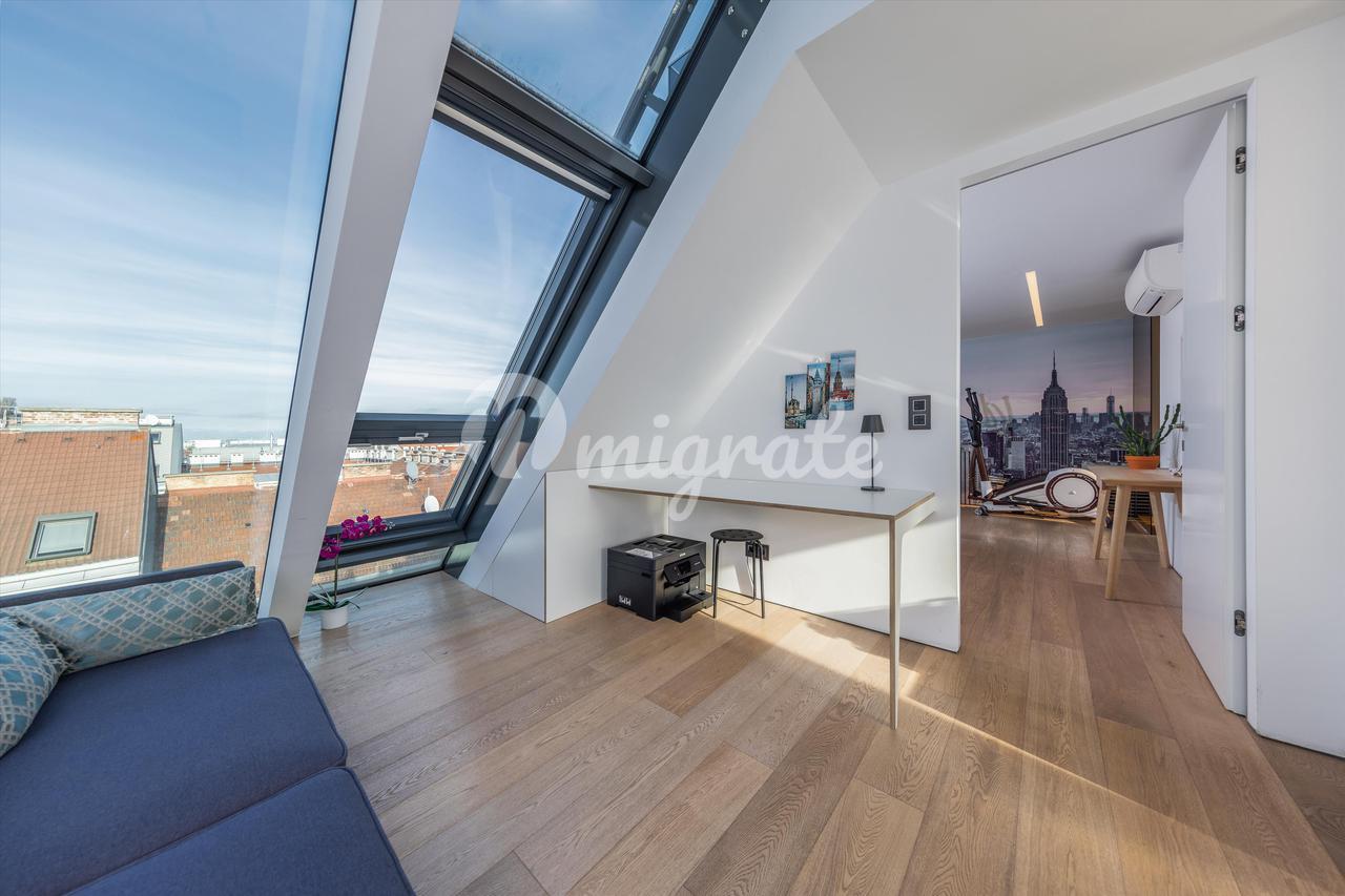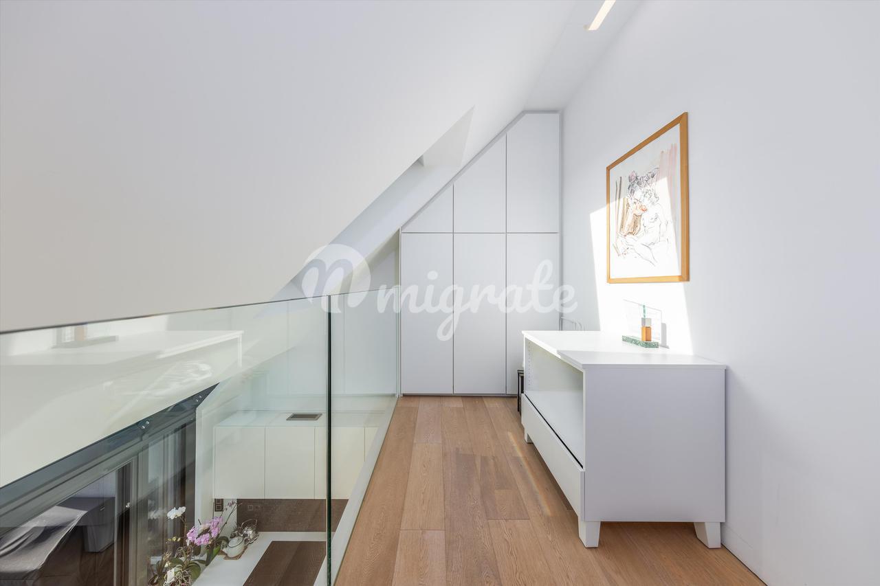 Мезонет был построен в 2016 году во время переоборудования крыши дома Gründerzeit. Недвижимость расположена в здании с лифтом и предлагает 160 кв. м жилой площади, распределенной на двух уровнях. Она состоит из прихожей, гостиной и полностью оборудованной кухни открытой планировки с обеденной зоной и выходом на террасу со стороны внутреннего двора на первом уровне. Две спальни с центральным доступом, ванная комната с душем, гостевой туалет и кладовая завершают этот уровень. На втором этаже находится главная спальня с душевой кабиной и ванной, галерея, офисная зона и небольшая терраса. В квартире также есть подвал и парковочное место в гараже с электрической зарядной станцией.