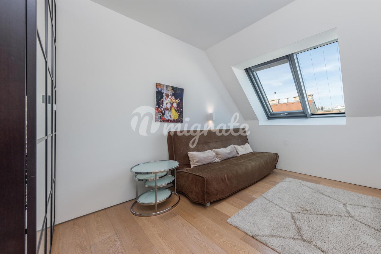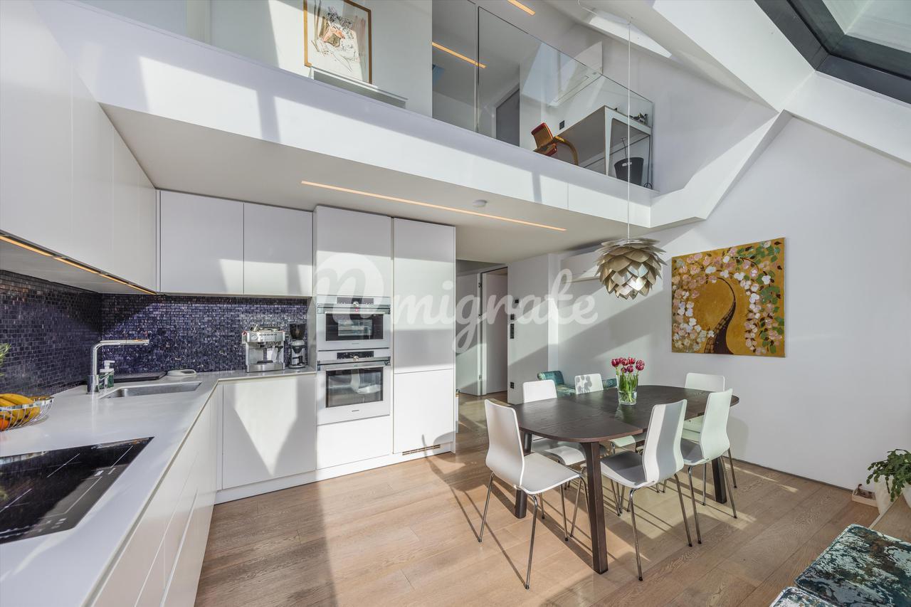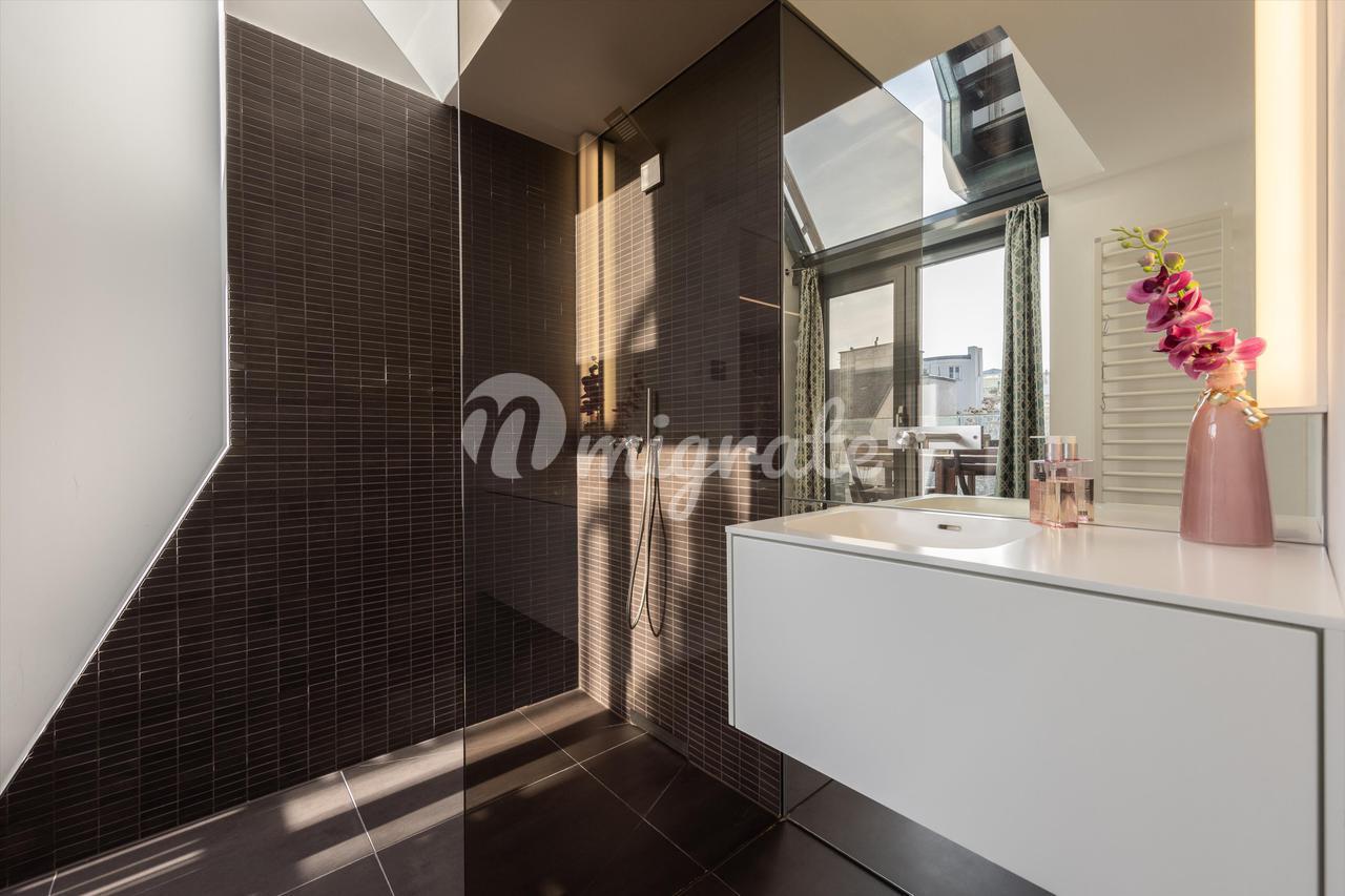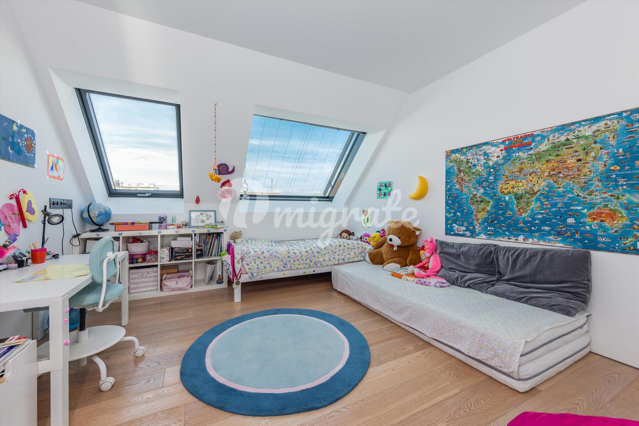 Мезонет был построен в 2016 году во время переоборудования крыши дома Gründerzeit. Недвижимость расположена в здании с лифтом и предлагает 160 кв. м жилой площади, распределенной на двух уровнях. Она состоит из прихожей, гостиной и полностью оборудованной кухни открытой планировки с обеденной зоной и выходом на террасу со стороны внутреннего двора на первом уровне. Две спальни с центральным доступом, ванная комната с душем, гостевой туалет и кладовая завершают этот уровень. На втором этаже находится главная спальня с душевой кабиной и ванной, галерея, офисная зона и небольшая терраса. В квартире также есть подвал и парковочное место в гараже с электрической зарядной станцией.