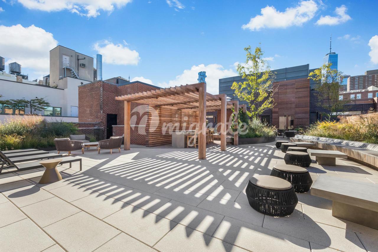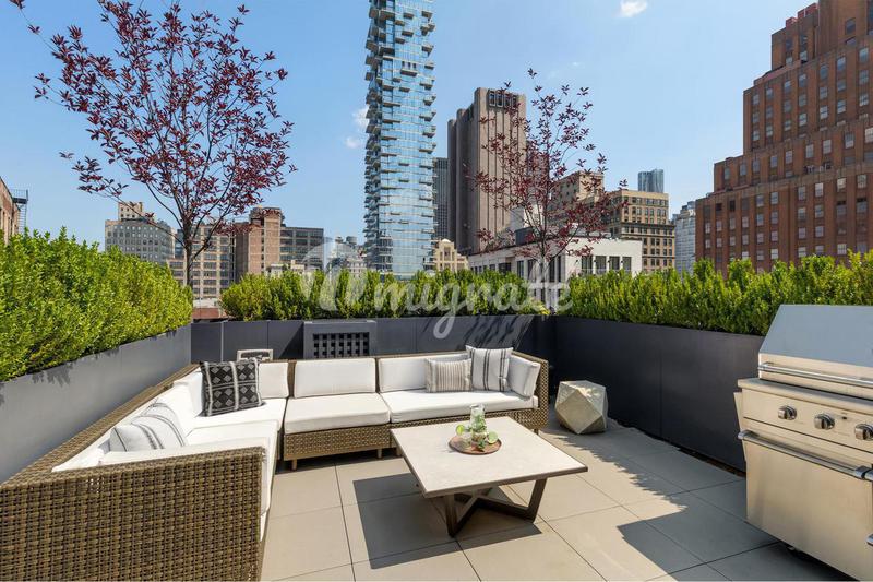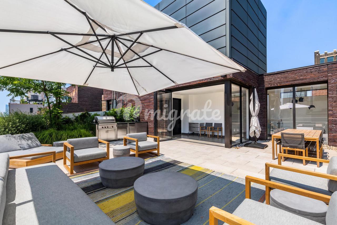 Верхний этаж этого пентхауса, безусловно, является жемчужиной дома с игровой комнатой, заключенной в стеклянные двери-гармошки от пола до потолка, которые легко открываются на обширную частную открытую террасу на крыше. Это пространство площадью более 1000 квадратных футов имеет встроенную кухню с барбекю Wolfe на природном газе, раковиной, холодильником, уличными динамиками, освещением и ландшафтным садом.