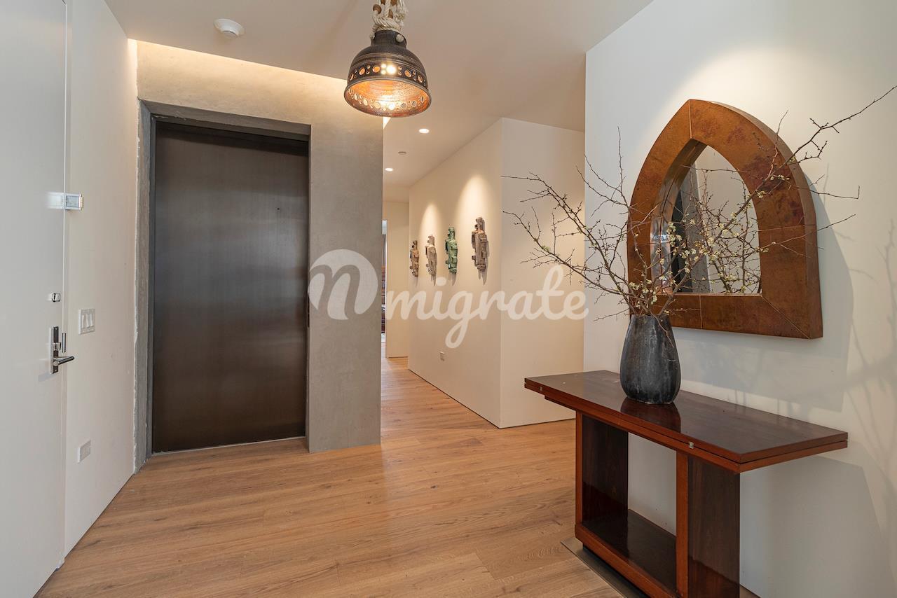 Ненавязчивый лифт с ключом открывается прямо в фойе, ведущем в элегантно обставленный Большой зал шириной 50 футов с газовым камином и 10-футовыми потолками. Это потрясающее развлекательное пространство дополняется красивыми окнами от пола до потолка, выходящими на южную сторону, и прямым выходом на просторную частную террасу с видом на Хайлайн.